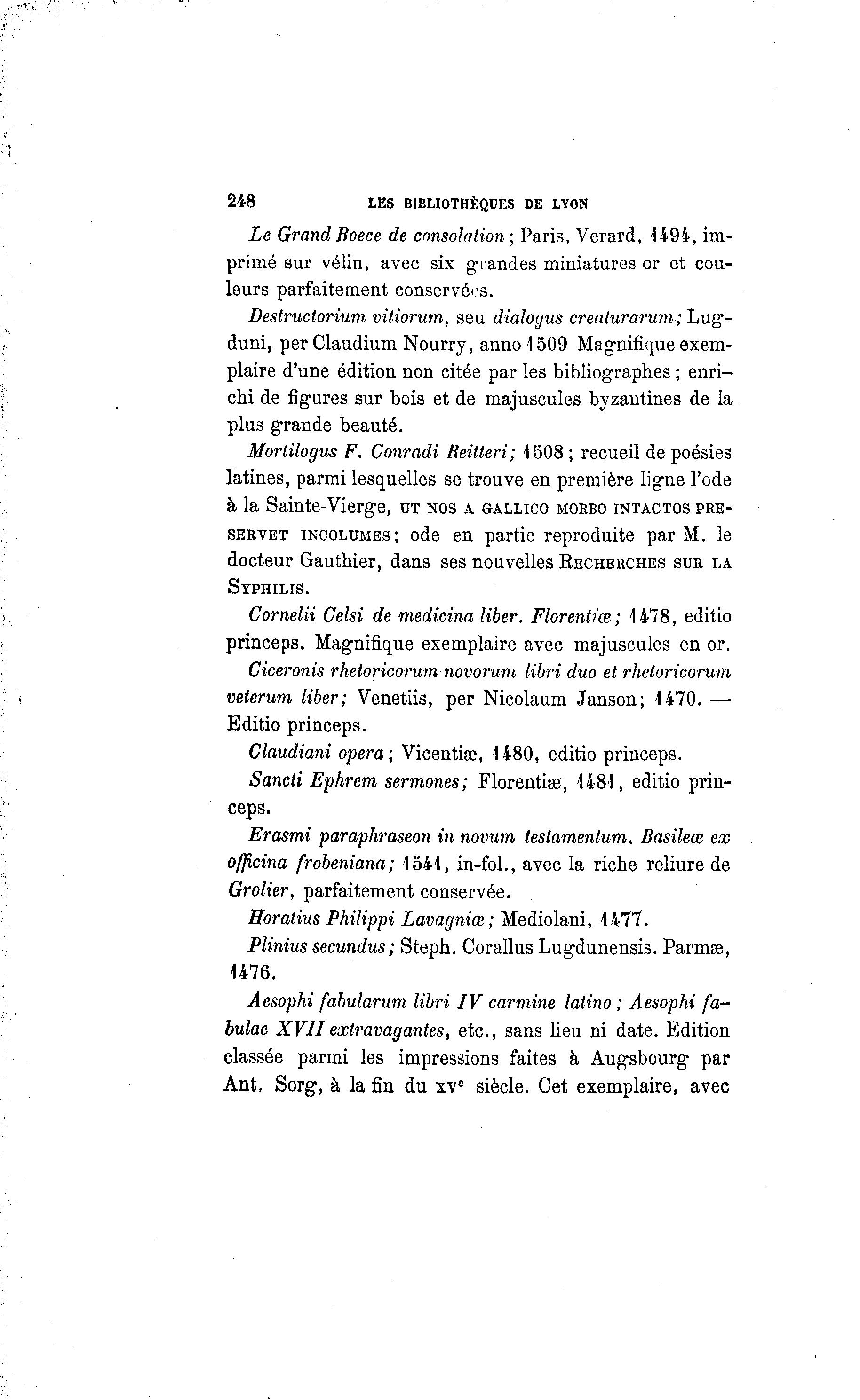 248 LES BIBLIOTHÈQUES DE LYON Le Grand Boece de consolation ; Paris, Verard, 1494, im- primé sur vélin, avec six grandes miniatures or et cou- leurs parfaitement conservées. Destructorium vitiorum, seu dialogus creaturarum ; Lug- duni, per Claudium Nourry, anno 1509 Magnifique exem- plaire d'une édition non citée par les bibliographes ; enri- chi de figures sur bois et de majuscules byzantines de la plus grande beauté. Mortilogus F. Conradi Reitteri; 1508 ; recueil de poésies latines, parmi lesquelles se trouve en première ligne l'ode à la Sainte-Vierge, UT NOS A GALLICO MOEBO INTACTOS PRE- SEBVET INCOLUMES; ode en partie reproduite par M. le docteur Gauthier, dans ses nouvelles RECHERCHES SUR LA SYPHILIS. Cornelii Celsi de medicina liber. Florentiœ; 1478, editio princeps. Magnifique exemplaire avec majuscules en or. Ciceronis rhetoricorum novorum libri duo et rhetoricorum veterum liber; Venetiis, per Nicolaum Janson; 1470. — Editio princeps. Claudiani opéra; Vicentiœ, 1480, editio princeps. Sancti Ephrem sermones; Florentise, 1481, editio prin- ceps. Erasmi paraphraseon in novum testamentum, Basileœ ex officina frobeniana; 1541, in-fol., avec la riche reliure de Grolier, parfaitement conservée. Horalius Philippi Lavagniœ; Mediolani, 1477. Plinius secundus; Steph. Corallus Lugdunensis. Parmse, 1476. Aesophi fabularum libri IV carminé latino ; Aesophi fa- bulae XVIIextravagantes, etc., sans lieu ni date. Edition classée parmi les impressions faites à Augsbourg par Ant. Sorg, à la fin du xve siècle. Cet exemplaire, avec