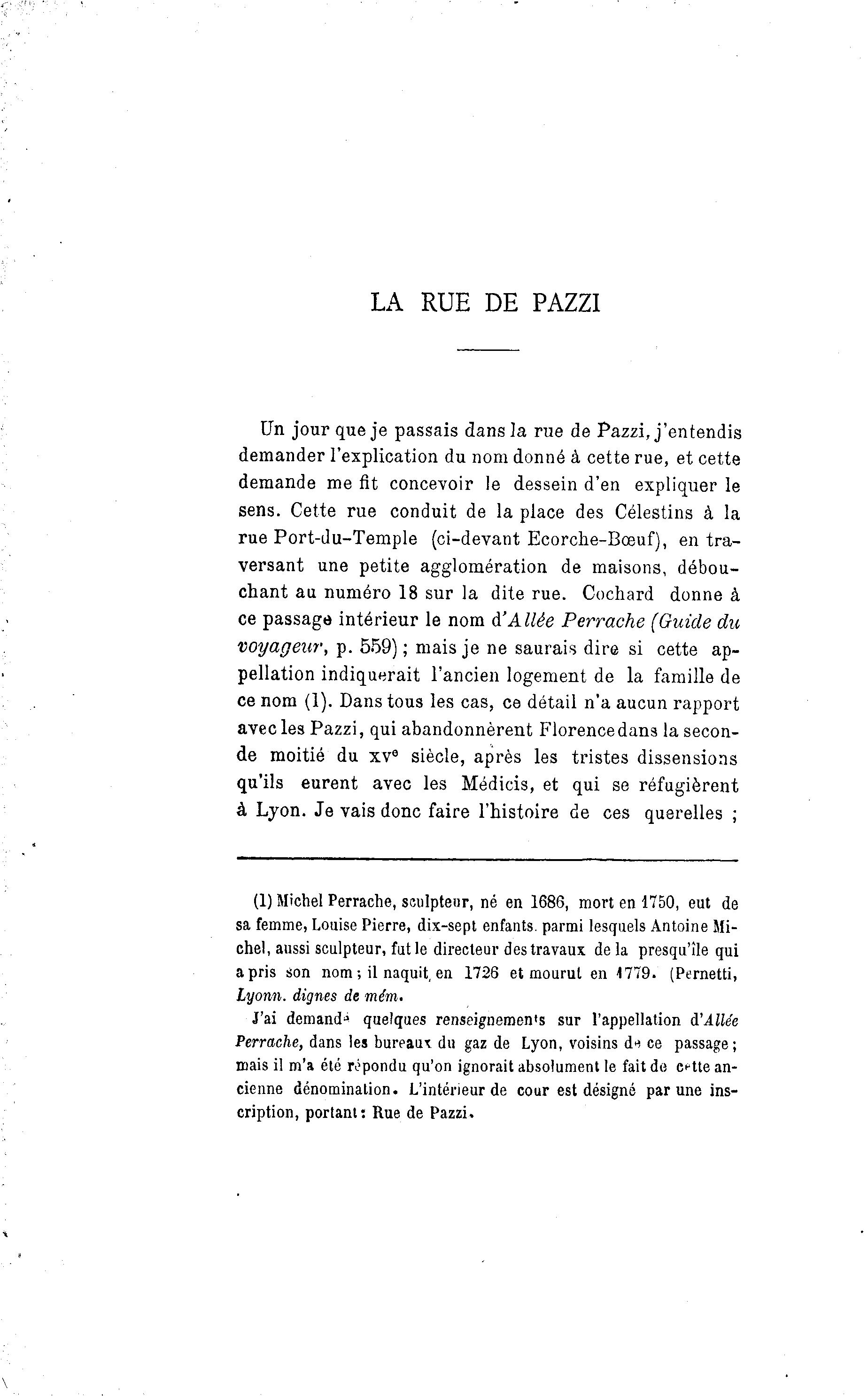 LA RUE DE PAZZI Un jour que je passais dans la rue de Pazzi, j'entendis demander l'explication du nom donné à cette rue, et cette demande me fit concevoir le dessein d'en expliquer le sens. Cette rue conduit de la place des Célestins à la rue Port-du-Temple (ci-devant Ecorche-Bœuf), en tra- versant une petite agglomération de maisons, débou- chant au numéro 18 sur la dite rue. Cochard donne à ce passage intérieur le nom d'Allée Perrache (Guide du voyageur, p. 559) ; mais je ne saurais dire si cette ap- pellation indiquerait l'ancien logement de la famille de ce nom (1). Dans tous les cas, ce détail n'a aucun rapport avec les Pazzi, qui abandonnèrent Florence dans la secon- de moitié du xv e siècle, après les tristes dissensions qu'ils eurent avec les Médicis, et qui se réfugièrent à Lyon. Je vais donc faire l'histoire de ces querelles ; (1) Michel Perrache, sculpteur, né en 1686, mort en 1750, eut de sa femme, Louise Pierre, dix-sept enfants, parmi lesquels Antoine Mi- chel, aussi sculpteur, fut le directeur des travaux de la presqu'île qui apris son nom ; il naquit, en 1726 et mourut en 1779. (Pernetti, Lyonn. dignes de mém. J'ai demanda quelques renseignements sur l'appellation d'Allée Perrache, dans les bureaut du gaz de Lyon, voisins d^ ce passage; mais il m'a été répondu qu'on ignorait absolument le fait do Cftte an- cienne dénomination. L'intérieur de cour est désigné par une ins- cription, portant: Rue de Pazzi.