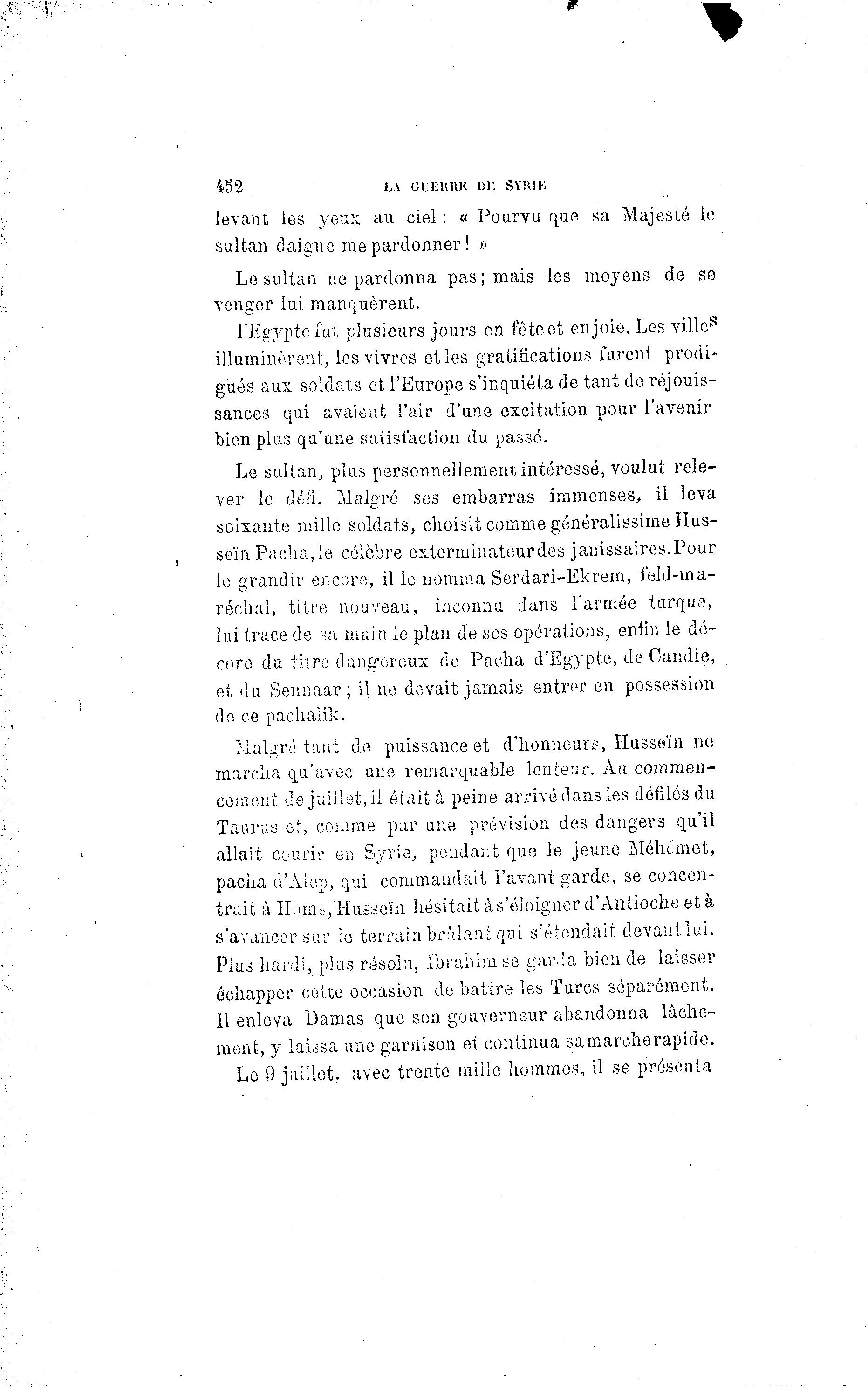 W2 LA GUlillHE DE SYRIE levant les yeux au ciel : « Pourvu que sa Majesté le sultan daigne me pardonner ! » Le sultan ne pardonna pas ; mais les moyens de se venger lui manquèrent. l'Egypte fut plusieurs jours en fête et en joie. Les ville*5 illuminèrent, les vivres et les gratifications furent prodi- gués aux soldats et l'Europe s'inquiéta de tant de réjouis- sances qui avaient l'air d'une excitation pour l'avenir bien plus qu'une satisfaction du passé. Le sultan, plus personnellement intéressé, voulut rele- ver le défi. Malgré ses embarras immenses, il leva soixante mille soldats, choisit comme généralissime Hus- sein Pacha, le célèbre exterminateur des janissaires.Pour le grandir encore, il le nomma Serdari-Ekrem, feld-ma- réchal, titre nouveau, inconnu dans l'armée turque, lui trace de sa main le plan de ses opérations, enfin le dé- core du titre dangereux de Pacha d'Egypte, de Candie, et du Sennaar; il ne devait jamais entrer en possession de ce pachalik. Malgré tant de puissance et d'honneurs, Hussein ne marcha qu'avec une remarquable lenteur. Au commen- cement de juillet, il était à peine arrivé dans les défilés du Tauras et, comme par une, prévision des dangers qu'il allait courir en Syrie, pendant que le jeune Méhémet, pacha d'Aiep, qui commandait l'avant garde, se concen- trait à Ilomsj'Hussein hésitait à s'éioignerd'Antioehe et à s'avancer sur le terrain brûlant qui s'étendait devantlui. Plus hardi, plus résoin, Ibrahim se garda bien de laisser échapper cette occasion de battre les Turcs séparément. Il enleva Damas que son gouverneur abandonna lâche- ment, y laissa une garnison et continua samarcherapide. Le 9 juillet, avec trente mille hommes, il se présenta