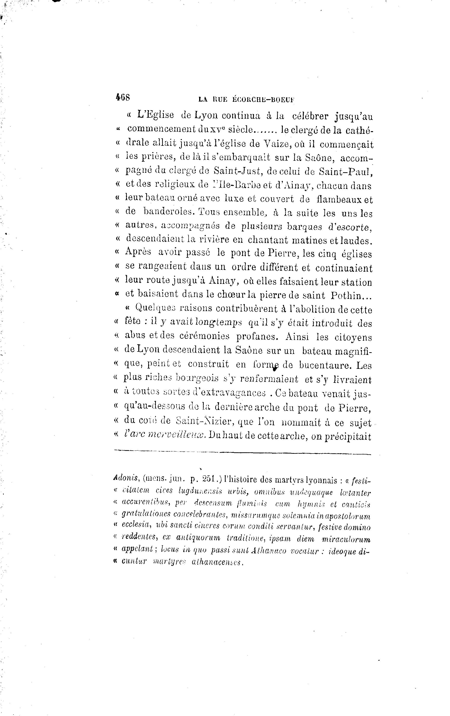 468 LA KUE ÉCOllCHIÏ-BOEUF « L'Eglise de Lyon continua à la célébrer jusqu'au « commencement duxv 6 siècle le clergé de la cathé- « drale allait jusqu'à l'église de Vaize, où il commençait « les prières, de là il s'embarquait sur la Saône, aecom- « pagné du clergé de Saint-Just, de celui de Saint-Paul, « et des religieux de l'Ile-Barbeet d'Ainay, chacun dans « leur bateau orné avec luxe et couvert de flambeaux et « de banderoles. Tous ensemble, à la suite les uns les « autres, accompagnés de plusieurs barques d'escorte, « descendaient la rivière en chantant matines et laudes. « Après avoir passé le pont de Pierre, les cinq églises « se rangeaient dans un ordre différent et continuaient « leur route jusqu'à Ainay, où elles faisaient leur station o et baisaient dans le chœur la pierre de saint Pothin... « Quelques raisons contribuèrent à l'abolition de cette « fête : il y avait long-temps qu'il s'y était introduit des « abus et des cérémonies profanes. Ainsi les citoyens « de Lyon descendaient la Saône sur un bateau magnifi- « que, peint et construit en forage de bucentaure. Les « plus riches bourgeois s'y renfermaient et s'y livraient « à toutes sortes d'extravagances .Ce bateau venait jus- c qu'au-dessous de la dernière arche du pont de Pierre, e « du coté de Saint-Xizier, que l'on nommait à ce sujet < l'arc merveilleux. Du haut de cette arche, on précipitait < : Adonis, (mens. jun. p. 201.) l'histoire dos martyrs lyonnais : s festi- « citalcm cires lugdur.e;isi>t uruis, omnibus uudequaque lœtanter « accurentibus, per descensum p.umiiis cum hymni:< et canticix « gratulaliones concélébrantes, missarumque solemnia inapostolorum « ecclesia, ubi sancti cineres eorunt condiii gervanlur, feslive domino « reddentes, ex anliqiwrum iradilione, ipsam diem miraculorum « appelant; locus in quu pussi sunl Athanaco vocaiur : ideoque di- « cuntur martyre:- athanacentes.