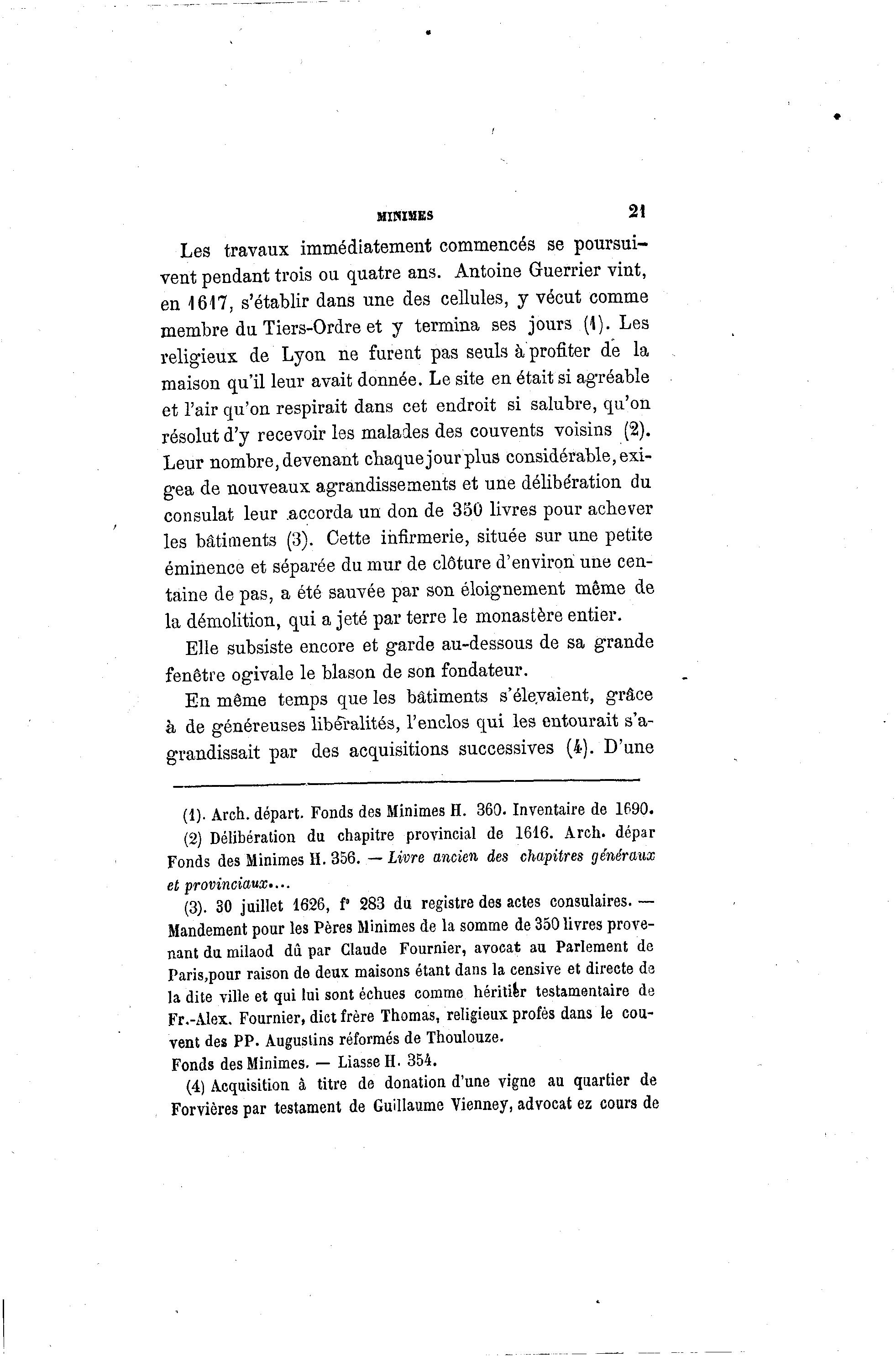 MUNIMES 21 Les travaux immédiatement commencés se poursui- vent pendant trois ou quatre ans. Antoine Guerrier vint, en 1617, s'établir dans une des cellules, y vécut comme membre du Tiers-Ordre et y termina ses jours (1). Les religieux de Lyon ne furent pas seuls à profiter de la maison qu'il leur avait donnée. Le site en était si agréable et l'air qu'on respirait dans cet endroit si salubre, qu'on résolut d'y recevoir les malades des couvents voisins (2). Leur nombre, devenant chaque jour plus considérable, exi- gea de nouveaux agrandissements et une délibération du consulat leur accorda un don de 350 livres pour achever les bâtiments (3). Cette infirmerie, située sur une petite éminence et séparée du mur de clôture d'environ une cen- taine de pas, a été sauvée par son éloigneinent même de la démolition, qui a jeté par terre le monastère entier. Elle subsiste encore et garde au-dessous de sa grande fenêtre ogivale le blason de son fondateur. En même temps que les bâtiments s'élevaient, grâce à de généreuses libéralités, l'enclos qui les entourait s'a- grandissait par des acquisitions successives (4). D'une (1). Arch. départ. Fonds des Minimes H. 360. Inventaire de 1690. (2) Délibération du chapitre provincial de 1616. Arch. dépar Fonds des Minimes H. 356. — Livre ancien des chapitres généraux et provinciaux-... (3). 30 juillet 1626, f 283 du registre des actes consulaires. — Mandement pour les Pères Minimes de la somme de 350 livres prove- nant du milaod dû par Claude Fournier, avocat au Parlement de Paris,pour raison de deux maisons étant dans la censive et directe de la dite ville et qui lui sont échues comme héritier testamentaire de Fr.-Alex. Fournier, diet frère Thomas, religieux profès dans le cou- vent des PP. Auguslins réformés de Thoulouze. Fonds des Minimes. — Liasse H. 354. (4) Acquisition à titre de donation d'une vigne au quartier de Forvières par testament de Guillaume Vienney, advocat ez cours de