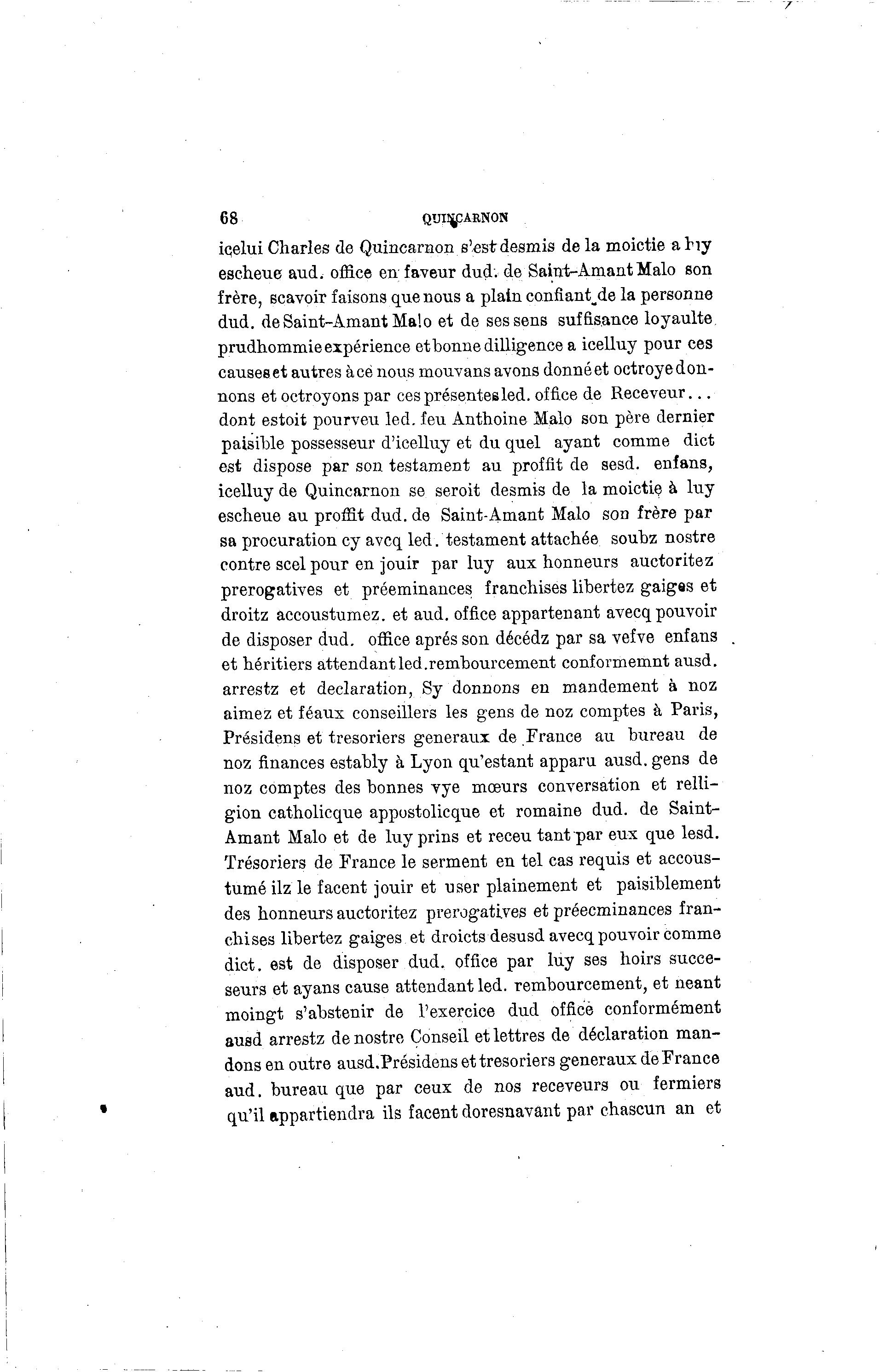 68 QUII^CARNON icelui Charles de Quincarnon s'-est desmis de la moictie a hry escheue aud. office en faveur dud. de Saint-Amant Malo son frère, scavoir faisons que nous a plain confiant_de la personne dud. de Saint-Amant Malo et de ses sens suffisance loyaulte prudhommie expérience etbonnedilligencea iceliuy pour ces causeset autres à cè nous mouvans avons donnéet octroyedon- nons et octroyons par cesprésentesled. office de Receveur... dont estoit pourveu led. feu Anthoine Malo son père dernier paisible possesseur d'icelluy et du quel ayant comme dict est dispose par son testament au proffit de sesd. enfans, iceliuy de Quincarnon se seroit desmis de la moictie à luy escheue au proffit dud. de Saint-Amant Malo son frère par sa procuration cy avcq led. testament attachée soubz nostre contre scel pour en jouir par luy aux honneurs auctoritez prérogatives et préeminances franchises libertez gaigas et droitz accoustumez. et aud. office appartenant avecq pouvoir de disposer dud. office après son décédz par sa vefve enfans et héritiers attendant led.rembourcement conformemnt ausd. arrestz et déclaration, Sy donnons en mandement à noz aimez et féaux conseillers les gens de noz comptes à Paris, Présidens et trésoriers généraux de France au bureau de noz finances estably à Lyon qu'estant apparu ausd. gens de noz comptes des bonnes vye mœurs conversation et relli- gion catholicque appostolicque et romaine dud. de Saint- Amant Malo et de luy prins et receu tant par eux que lesd. Trésoriers de France le serment en tel cas requis et accous- tuméilz le facent jouir et user plainement et paisiblement des honneurs auctoritez prérogatives et préecminances fran- chises libertez gaiges et droicts desusd avecq pouvoir comme dict. est de disposer dud. office par luy ses hoirs succe- seurs et ayans cause attendant led. rembourcement, et néant moingt s'abstenir de l'exercice dud office conformément ausd arrestz de nostre Conseil et lettres de déclaration man- dons en outre ausd.Présidens et trésoriers généraux de France aud. bureau que par ceux de nos receveurs ou fermiers qu'il appartiendra ils facent doresnavant par chascun an et