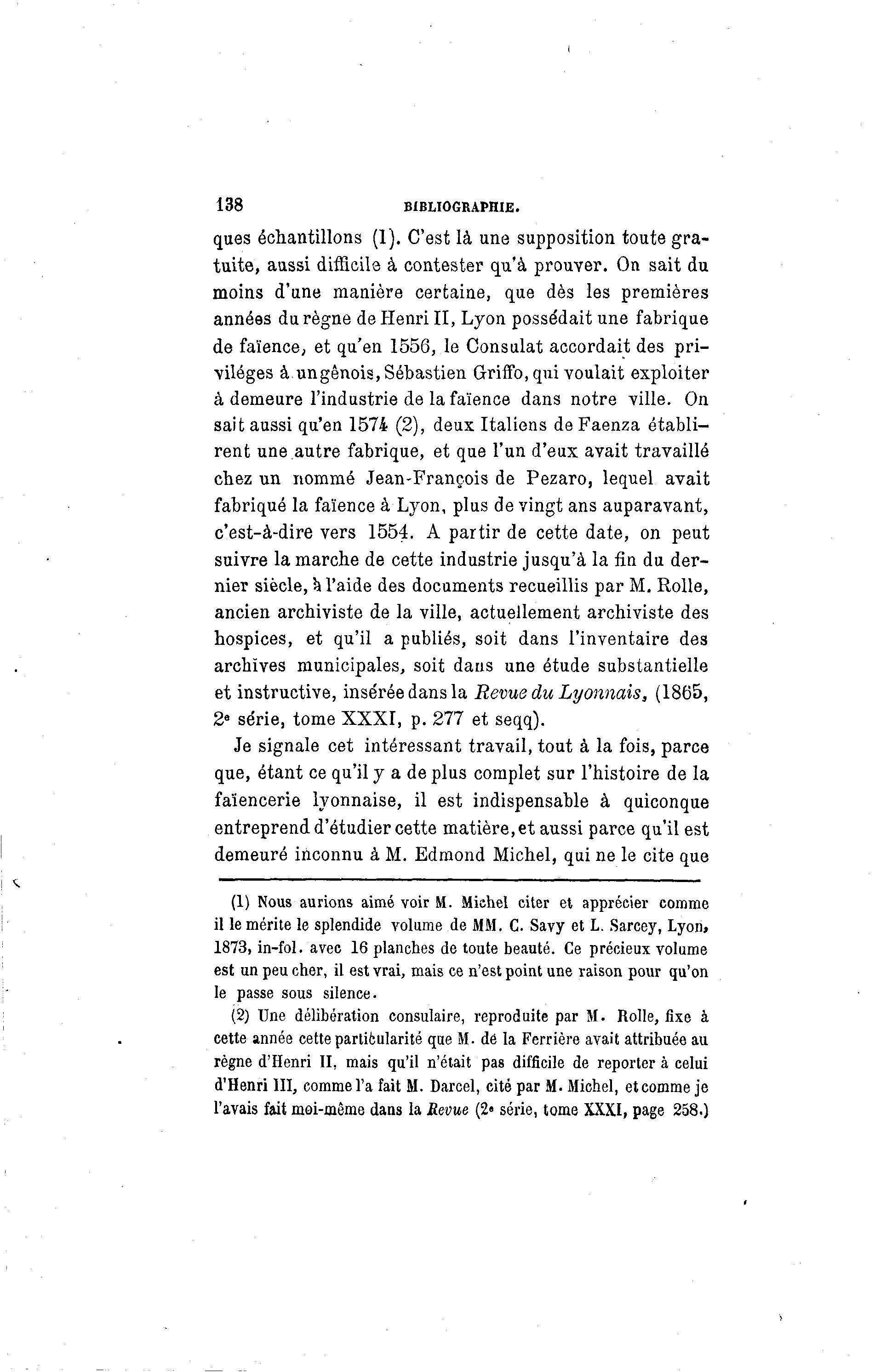 138 BIBLIOGRAPHIE. ques échantillons (1). C'est là une supposition toute gra- tuite, aussi difficile à contester qu'à prouver. On sait du moins d'une manière certaine, que dès les premières années du règne de Henri II, Lyon possédait une fabrique de faïence, et qu'en 1556, le Consulat accordait des pri- vilèges à ungênois, Sébastien Griffo, qui voulait exploiter à demeure l'industrie de la faïence dans notre ville. On sait aussi qu'en 1574 (2), deux Italiens de Faenza établi- rent une autre fabrique, et que l'un d'eux avait travaillé chez un nommé Jean-François de Pezaro, lequel avait fabriqué la faïence à Lyon, plus de vingt ans auparavant, c'est-à -dire vers 1554. A partir de cette date, on peut suivre la marche de cette industrie jusqu'à la fin du der- nier siècle, à l'aide des documents recueillis par M. Rolle, ancien archiviste de la ville, actuellement archiviste des hospices, et qu'il a publiés, soit dans l'inventaire des archives municipales, soit dans une étude substantielle et instructive, insérée dans la Revue du Lyonnais, (1865, 2e série, tome XXXI, p. 277 et seqq). Je signale cet intéressant travail, tout à la fois, parce que, étant ce qu'il y a de plus complet sur l'histoire de la faïencerie lyonnaise, il est indispensable à quiconque entreprend d'étudier cette matière, et aussi parce qu'il est demeuré inconnu à M. Edmond Michel, qui ne le cite que (1) Nous aurions aimé voir M. Miehel citer et apprécier comme il le mérite le splendide volume de MM. C. Savy et L. Sarcey, Lyon» 1873, in-fol. avec 16 planches de toute beauté. Ce précieux volume est un peu cher, il est vrai, mais ce n'est point une raison pour qu'on le passe sous silence. (2) Une délibération consulaire, reproduite par M. Rolle, fixe à cette année cette partièularité que M. dé la Perrière avait attribuée au règne d'Henri II, mais qu'il n'était pas difficile de reporter à celui d'Henri III, comme l'a fait M. Darcel, cité par M. Michel, et comme je l'avais fait moi-même dans la Revue (2« série, tome XXXI, page 258.)