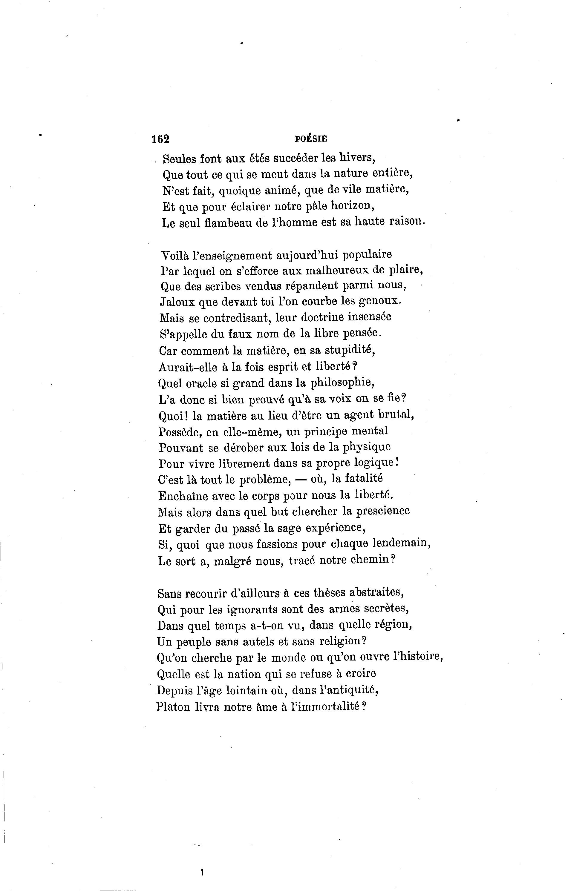 162 POÉSIE . Seules font aux étés succéder les hivers, Que tout ce qui se meut dans la nature entière, N'est fait, quoique animé, que de vile matière, Et que pour éclairer notre pâle horizon, Le seul flamheau de l'homme est sa haute raison. Voilà l'enseignement aujourd'hui populaire Par lequel on s'efforce aux malheureux de plaire, Que des scribes vendus répandent parmi nous, Jaloux que devant toi l'on courbe les genoux. Mais se contredisant, leur doctrine insensée S'appelle du faux nom de la libre pensée. Car comment la matière, en sa stupidité, Aurait-elle à la fois esprit et liberté ? Quel oracle si grand dans la philosophie, L'a donc si bien prouvé qu'à sa voix on se fie? Quoi ! la matière au lieu d'être un agent brutal, Possède, en elle-même, un principe mental Pouvant se dérober aux lois de la physique Pour vivre librement dans sa propre logique ! C'est là tout le problème, — où, la fatalité Enchaîne avec le corps pour nous la liberté. Mais alors dans quel but chercher la prescience Et garder du passé la sage expérience, Si, quoi que nous fassions pour chaque lendemain, Le sort a, malgré nous, tracé notre chemin? Sans recourir d'ailleurs à ces thèses abstraites, Qui pour les ignorants sont des armes secrètes, Dans quel temps a-t-on vu, dans quelle région, Un peuple sans autels et sans religion? Qu'on cherche par le monde ou qu'on ouvre l'histoire, Quelle est la nation qui se refuse à croire Depuis l'âge lointain où, dans l'antiquité, Platon livra notre âme à l'immortalité?