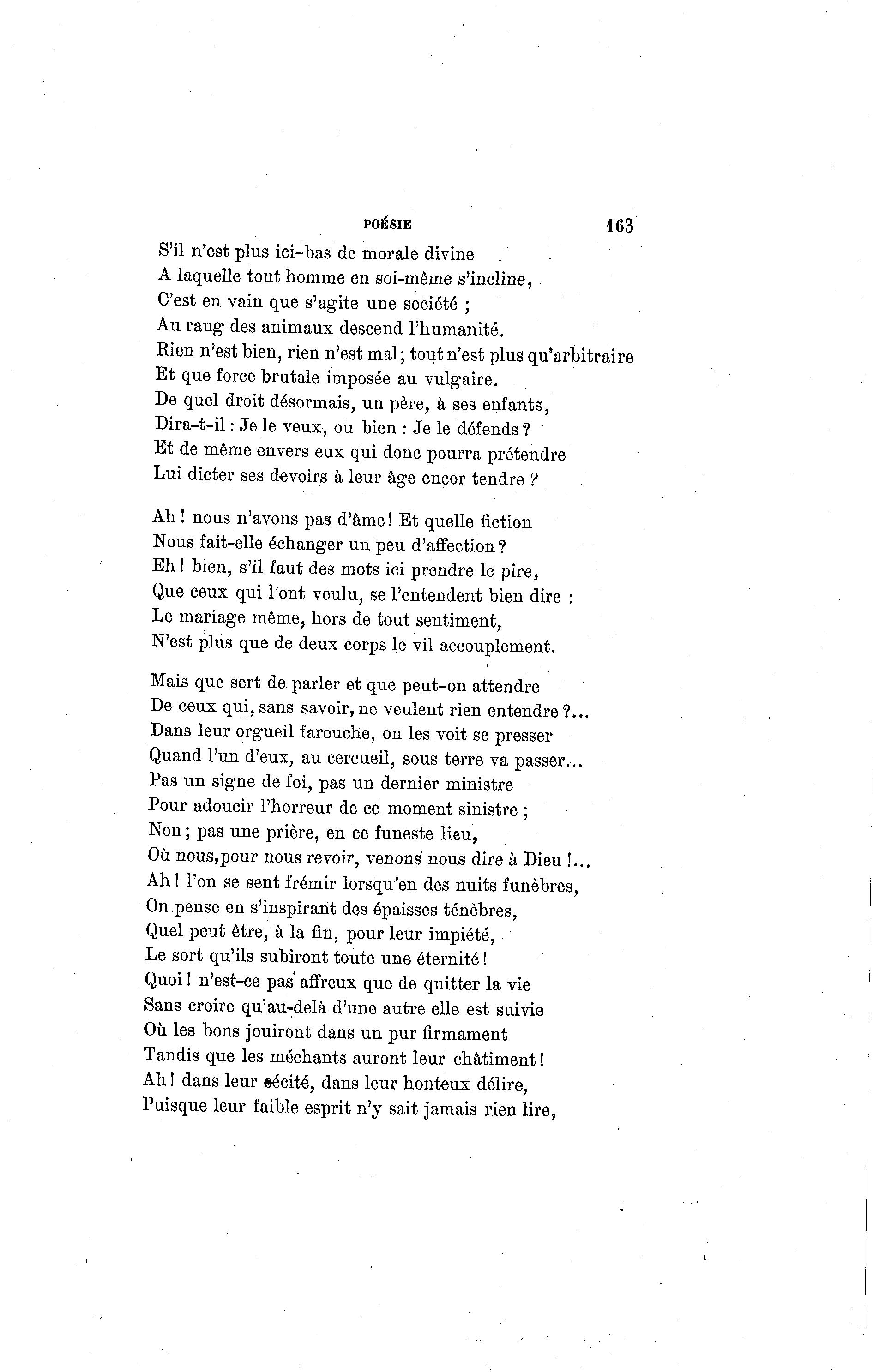 POÉSIE 163 S'il n'est plus ici-bas de morale divine A laquelle tout homme en soi-même s'incline, C'est en vain que s'agite une société ; Au rang des animaux descend l'humanité. Rien n'est bien, rien n'est mal; tout n'est plus qu'arbitraire Et que force brutale imposée au vulgaire. De quel droit désormais, un père, à ses enfants, Dira-t-il : Je le veux, ou bien : Je le défends ? Et de même envers eux qui donc pourra prétendre Lui dicter ses devoirs à leur âge encor tendre ? Ah! nous n'avons pas d'âme! Et quelle fiction Nous fait-elle échanger un peu d'affection ? Eh ! bien, s'il faut des mots ici prendre le pire, Que ceux qui l'ont voulu, se l'entendent bien dire : Le mariage même, hors de tout sentiment, N'est plus que de deux corps le vil accouplement. Mais que sert de parler et que peut-on attendre De ceux qui, sans savoir, ne veulent rien entendre ?... Dans leur orgueil farouche, on les voit se presser Quand l'un d'eux, au cercueil, sous terre va passer... Pas un signe de foi, pas un dernier ministre Pour adoucir l'horreur de ce moment sinistre ; Non ; pas une prière, en ce funeste lieu, Où nous,pour nous revoir, venons nous dire à Dieu !... Ah ! l'on se sent frémir lorsqu'on des nuits funèbres, On pense en s'inspirant des épaisses ténèbres, Quel peut être, à la fin, pour leur impiété, Le sort qu'ils subiront toute une éternité ! Quoi ! n'est-ce pas affreux que de quitter la vie Sans croire qu'au-delà d'une autre elle est suivie Où les bons jouiront dans un pur firmament Tandis que les méchants auront leur châtiment ! Ah ! dans leur eécité, dans leur honteux délire, Puisque leur faible esprit n'y sait jamais rien lire,