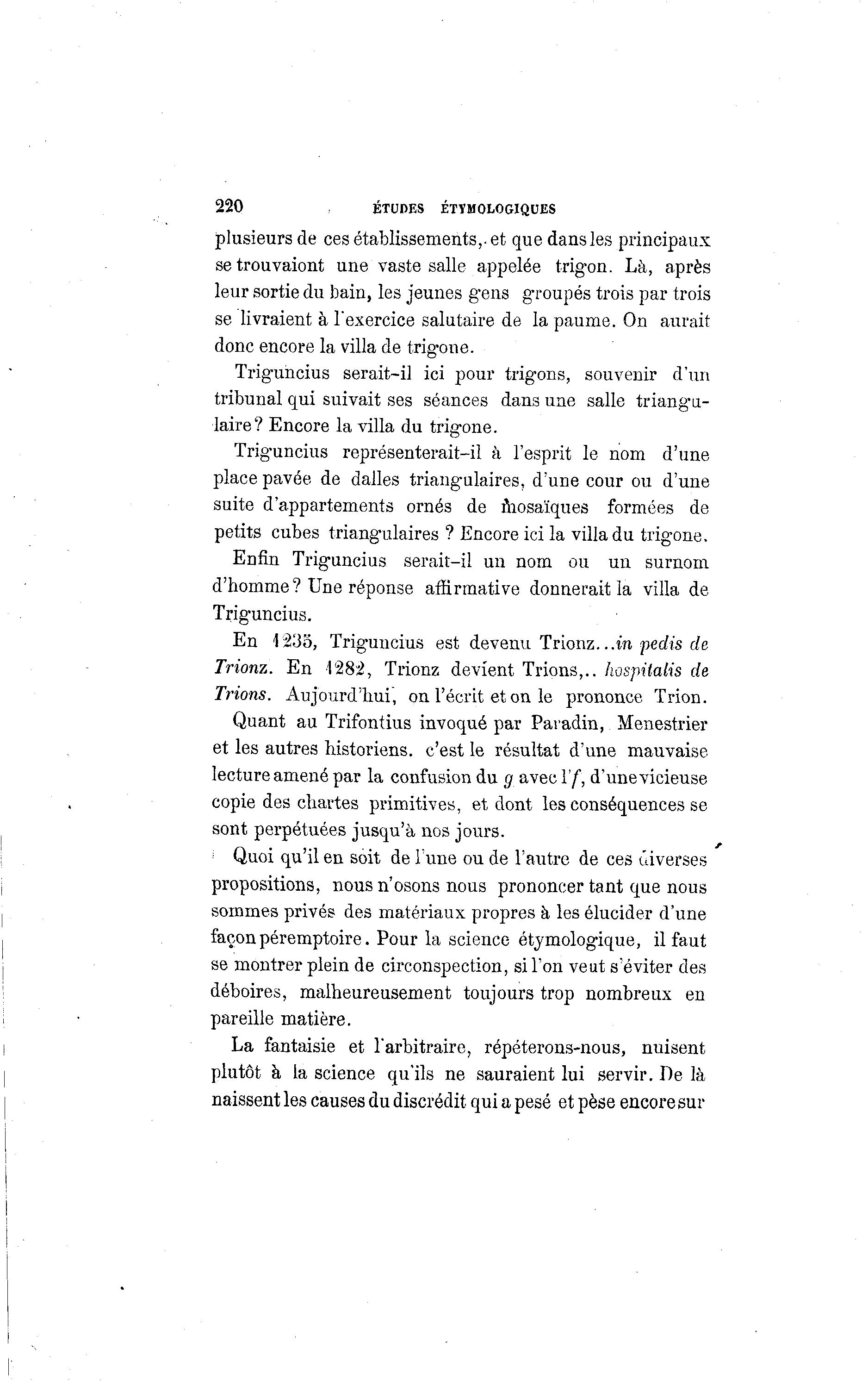 220 ÉTUDES ÉTYMOLOGIQUES plusieurs de ces établissements,, et que dans les principaux setrouvaiont une vaste salle appelée trigon. Là , après leur sortie du bain, les jeunes gens groupés trois par trois se livraient à l'exercice salutaire de la paume. On aurait donc encore la villa de trigone. Triguncius serait-il ici pour trigons, souvenir d'un tribunal qui suivait ses séances dans une salle triangu- laire? Encore la villa du trigone. Trig-uncius représenterait-il à l'esprit le nom d'une place pavée de dalles triangulaires, d'une cour ou d'une suite d'appartements ornés de mosaïques formées de petits cubes triangulaires ? Encore ici la villa du trigone. Enfin Triguncius serait-il un nom ou un surnom d'homme? Une réponse affirmative donnerait la villa de Triguncius. En 1235, Triguncius est devenu Trionz...in pedis de Trionz. En '1282, Trionz devient Trions,., hospitalis de Trions. Aujourd'hui, on l'écrit et on le prononce Trion. Quant au Trifontius invoqué par Païadin, Menestrier et les autres historiens, c'est le résultat d'une mauvaise lecture amené par la confusion du g avec Vf, d'une vicieuse copie des chartes primitives, et dont les conséquences se sont perpétuées jusqu'à nos jours. Quoi qu'il en soit de lune ou de l'autre de ces diverses propositions, nous n'osons nous prononcer tant que nous sommes privés des matériaux propres à les élucider d'une façonpéremptoire. Pour la science étymologique, il faut se montrer plein de circonspection, si l'on veut s'éviter des déboires, malheureusement toujours trop nombreux en pareille matière. La fantaisie et l'arbitraire, répéterons-nous, nuisent plutôt à la science qu'ils ne sauraient lui servir. De là naissent les causes du discrédit qui a pesé et pèse encore sur