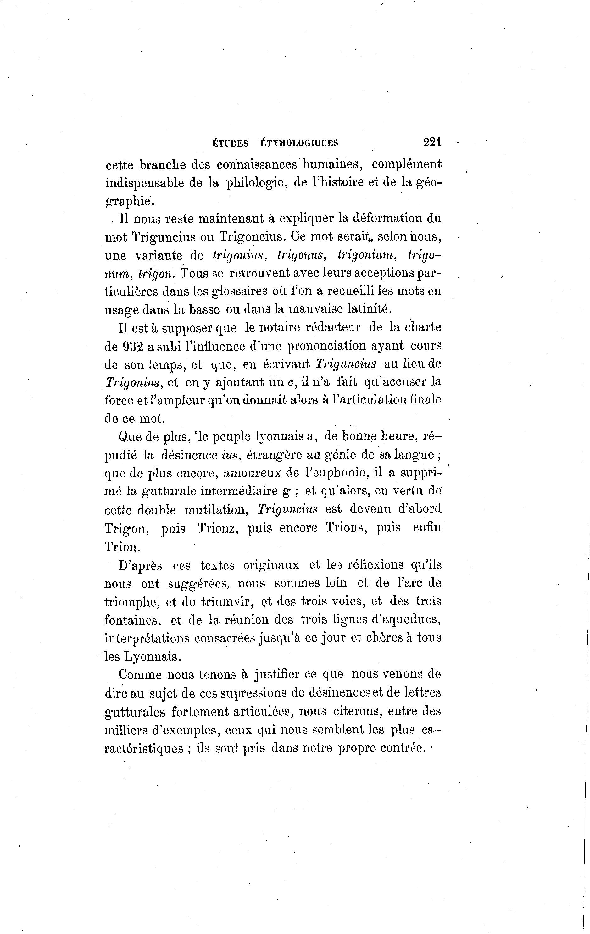 ÉTUDES ÉTYMOLOGIQUES 221 cette branche des connaissances humaines, complément indispensable de la philologie, de l'histoire et de la géo- graphie. Il nous reste maintenant à expliquer la déformation du mot Triguncius ou Trigoncius. Ce mot serait, selon nous, une variante de trigonius, trigonus, trigonium, trigo- num, trigon. Tousse retrouvent avec leurs acceptions par- ticulières dans les glossaires où l'on a recueilli les mots en usage dans la basse ou dans la mauvaise latinité. Il est à supposer que le notaire rédacteur de la charte de 932 a subi l'influence d'une prononciation ayant cours de son temps, et que, en écrivant Triguncius au lieu de Trigonius, et en y ajoutant un c, il n'a fait qu'accuser la force et l'ampleur qu'on donnait alors à l'articulation finale de ce mot. Que de plus, "le peuple lyonnais a, de bonne heure, ré- pudié la désinence tus, étrangère au génie de sa langue ; que de plus encore, amoureux de l'euphonie, il a suppri- mé la gutturale intermédiaire g ; et qu'alors,, en vertu de cette double mutilation, Triguncius est devenu d'abord Trigon, puis Trionz, puis encore Trions, puis enfin Trion. D'après ces textes originaux et les réflexions qu'ils nous ont suggérées, nous sommes loin et de l'arc de triomphe, et du triumvir, et des trois voies, et des trois fontaines, et de la réunion des trois lignes d'aqueducs, interprétations consacrées jusqu'à ce jour et chères à tous les Lyonnais. Comme nous tenons à justifier ce que nous venons de dire au sujet de ces supressions de désinences et de lettres gutturales fortement articulées, nous citerons, entre des milliers d'exemples, ceux qui nous semblent les plus ca- ractéristiques ; ils sont pris dans notre propre contrée.