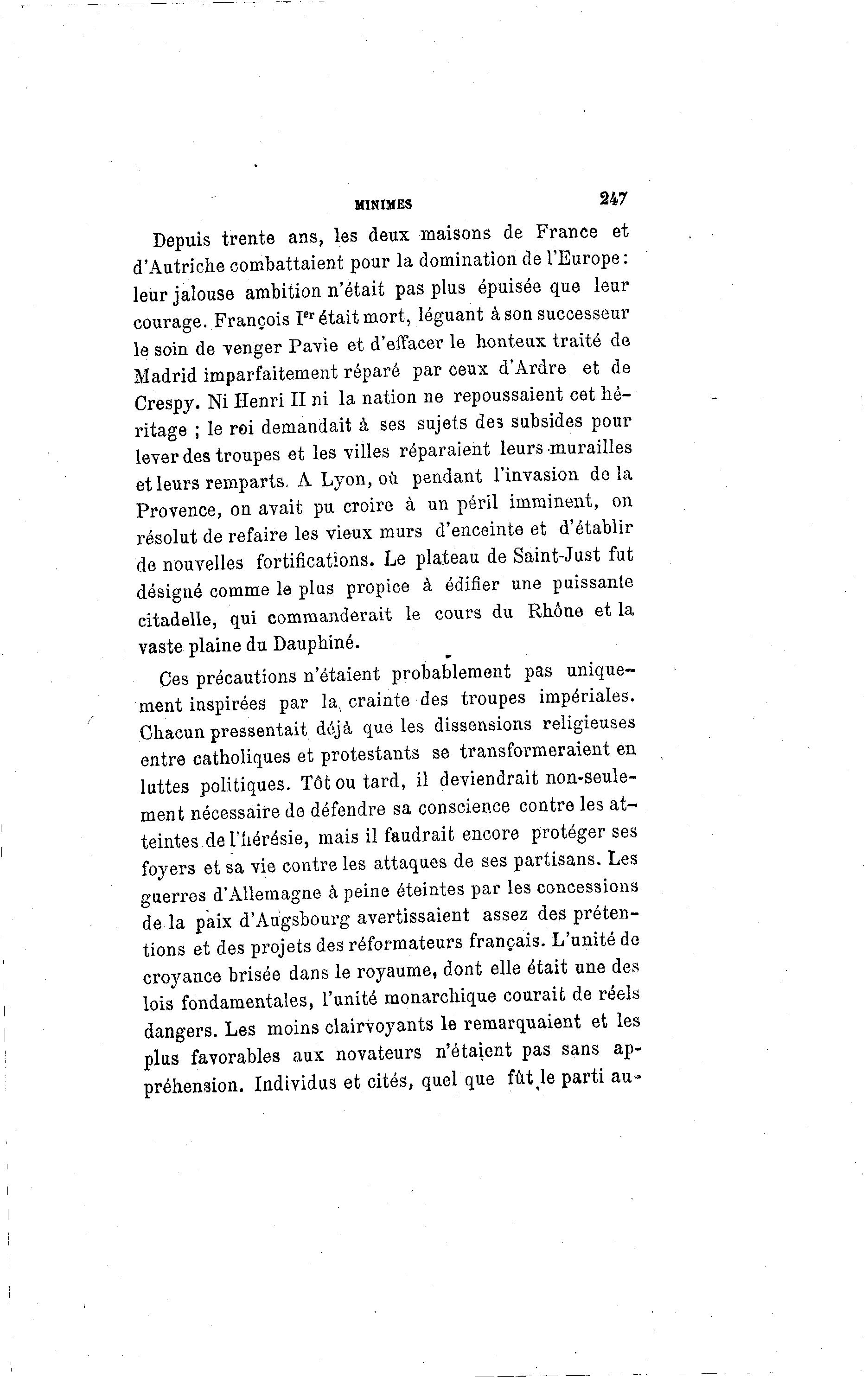 MINIMES 247 Depuis trente ans, les deux maisons de France et d'Autriche combattaient pour la domination de l'Europe : leur jalouse ambition n'était pas plus épuisée que leur courage. François Ier était mort, léguant à son successeur le soin de -venger Pavie et d'effacer le honteux traité de Madrid imparfaitement réparé par ceux d'Ardre et de Crespy. Ni Henri II ni la nation ne repoussaient cet hé- ritage ; le roi demandait à ses sujets des subsides pour lever des troupes et les villes réparaient leurs murailles et leurs remparts. A Lyon, où pendant l'invasion delà Provence, on avait pu croire à un péril imminent, on résolut de refaire les vieux murs d'enceinte et d'établir de nouvelles fortifications. Le plateau de Saint-Just fut désigné comme le plus propice à édifier une puissante citadelle, qui commanderait le cours du Rhône et la vaste plaine du Dauphiné. Ces précautions n'étaient probablement pas unique- ment inspirées par la, crainte des troupes impériales. Chacun pressentait déjà que les dissensions religieuses entre catholiques et protestants se transformeraient en luttes politiques. Tôt ou tard, il deviendrait non-seule- ment nécessaire de défendre sa conscience contre les at- teintes de l'hérésie, mais il faudrait encore protéger ses foyers et sa vie contre les attaques de ses partisans. Les guerres d'Allemagne à peine éteintes par les concessions de la paix d'Augsbourg avertissaient assez des préten- tions et des projets des réformateurs français. L'unité de croyance brisée dans le royaume, dont elle était une des lois fondamentales, l'unité monarchique courait de réels dangers. Les moins clairvoyants le remarquaient et les plus favorables aux novateurs n'étaient pas sans ap- préhension. Individus et cités, quel que fût le parti au-