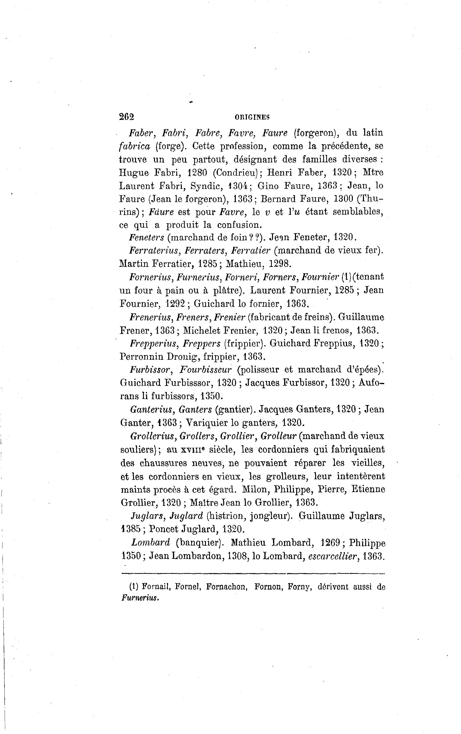 262 ORIGINES Faber, Fabri, Fabre, Favre, Faure (forgeron), du latin fabrica (forge). Cette profession, comme la précédente, se trouve un peu partout, désignant des familles diverses : Hugue Fabri, 1280 (Condrieu); Henri Faber, 1320; Mtre Laurent Fabri, Syndic, 1304; Gino Faure, 1363; Jean, lo Faure (Jean le forgeron), 1363; Bernard Faure, 1300 (Thu- rins) ; Faure est pour Favre, le v et Vu étant semblables, ce qui a produit la confusion. Feneters (marchand de foin??). Je