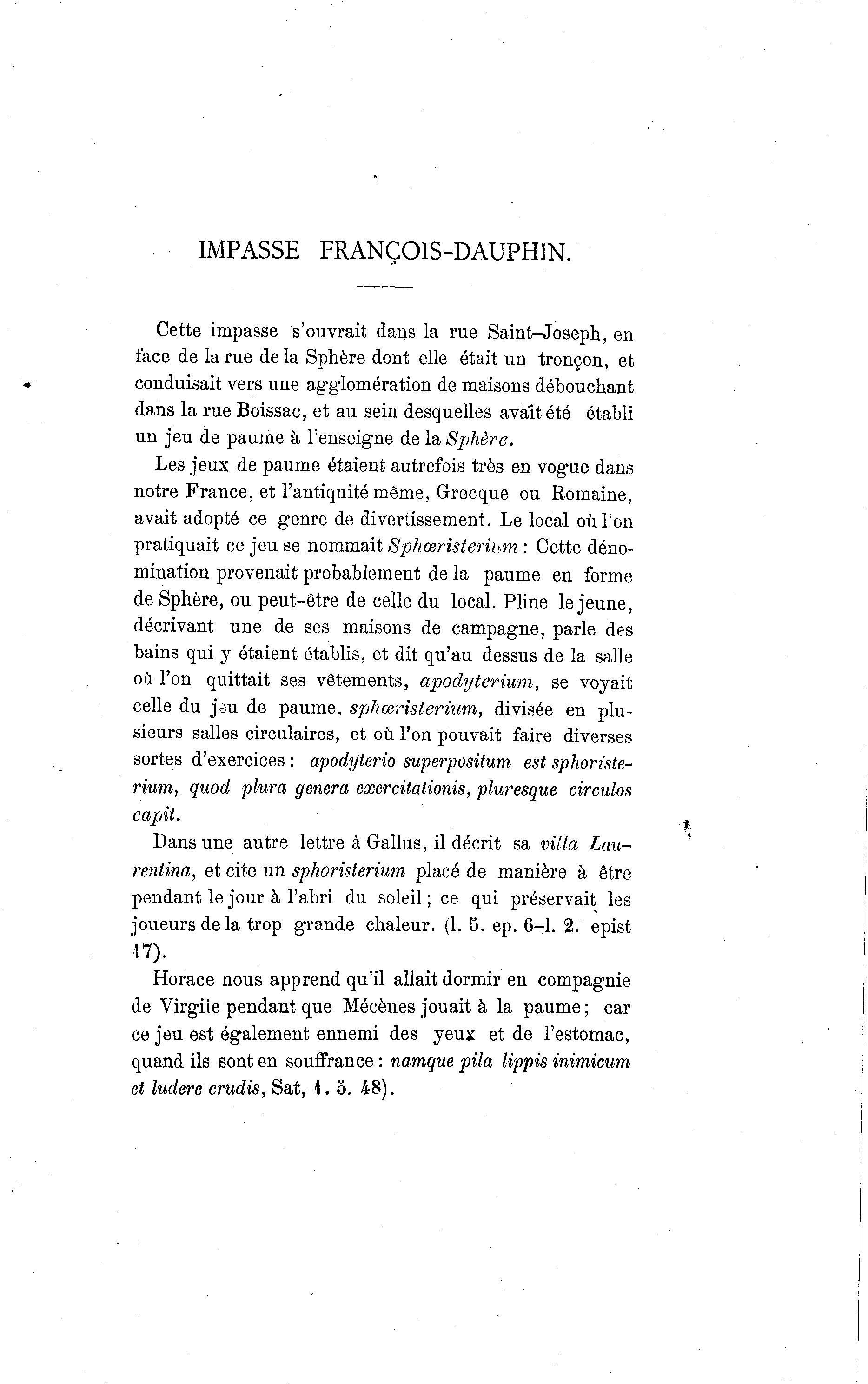 IMPASSE FRANÇOIS-DAUPHIN. Cette impasse s'ouvrait dans la rue Saint-Joseph, en face de la rue de la Sphère dont elle était un tronçon, et conduisait vers une agglomération de maisons débouchant dans la rue Boissac, et au sein desquelles avait été établi un jeu de paume à l'enseigne de la Sphère, Les jeux de paume étaient autrefois très en vogue dans notre France, et l'antiquité même, Grecque ou Romaine, avait adopté ce genre de divertissement. Le local où l'on pratiquait ce jeu se nommait Sphœristerium : Cette déno- mination provenait probablement de la paume en forme de Sphère, ou peut-être de celle du local. Pline le jeune, décrivant une de ses maisons de campagne, parle des bains qui y étaient établis, et dit qu'au dessus de la salle où l'on quittait ses vêtements, apodyterium, se voyait celle du jeu de paume, sphœristerium, divisée en plu- sieurs salles circulaires, et où l'on pouvait faire diverses sortes d'exercices : apodyterio superpositum est sphoriste- rium, quod plura gênera exercitationis, pluresque circulos capit. Dans une autre lettre à Gallus, il décrit sa villa Lau- rentina, et cite un sphoristerium placé de manière à être pendant le jour à l'abri du soleil ; ce qui préservait les joueurs de la trop grande chaleur. (1. 5. ep. 6-1. 2. epist 17). Horace nous apprend qu'il allait dormir en compagnie de Virgile pendant que Mécènes jouait à la paume ; car ce jeu est également ennemi des yeux et de l'estomac, quand ils sont en souffrance : namque pila lippis inimicum et ludere crudis, Sat, 4. 5. 48).