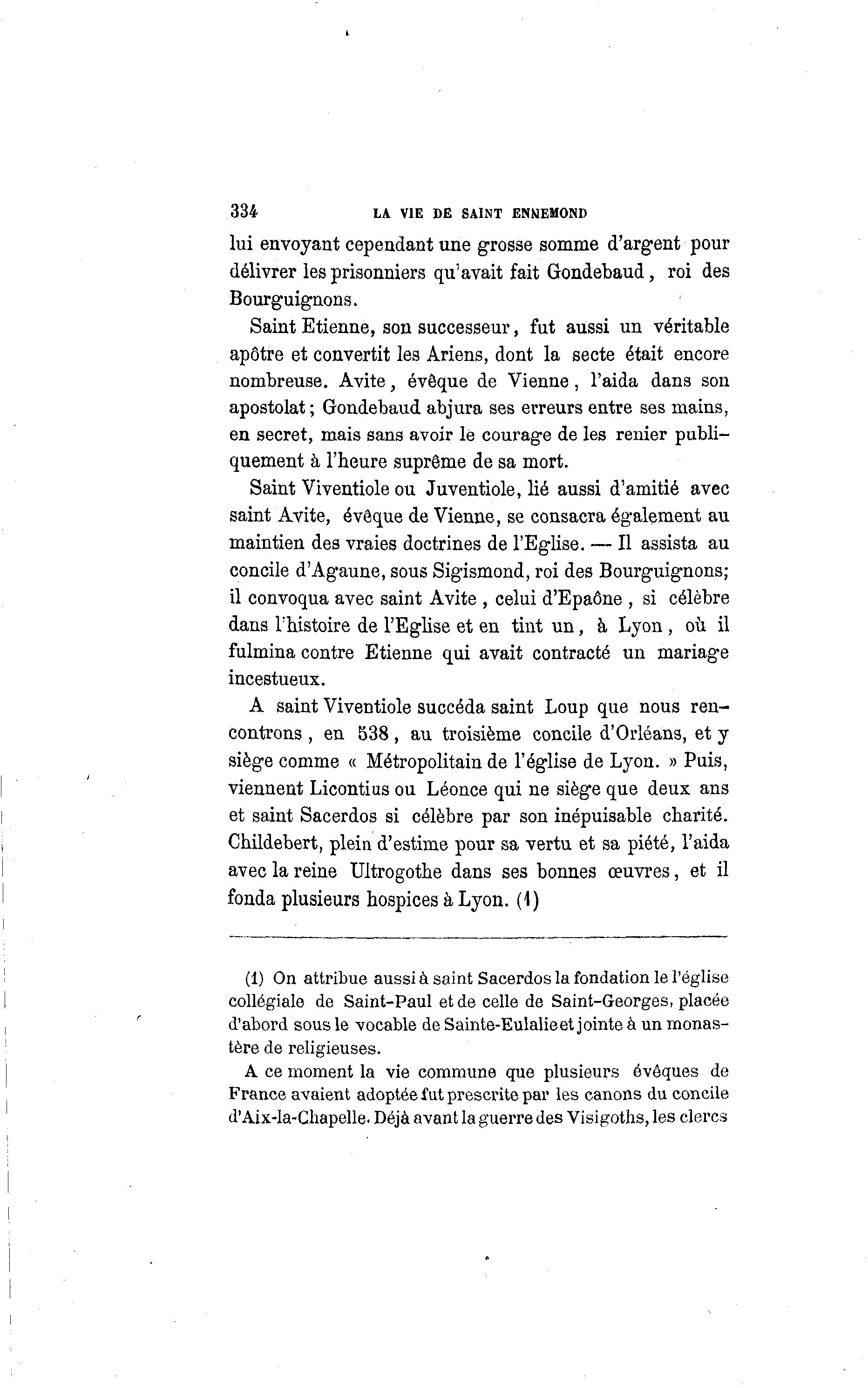 334 LA VIE DE SAINT ENNEMOND lui envoyant cependant une grosse somme d'argent pour délivrer les prisonniers qu'avait fait Gondebaud, roi des Bourguignons. Saint Etienne, son successeur, fut aussi un véritable apôtre et convertit le9 Ariens, dont la secte était encore nombreuse. Avite, évêque de Vienne , l'aida dans son apostolat ; Gondebaud abjura ses erreurs entre ses mains, en secret, mais sans avoir le courage de les renier publi- quement à l'heure suprême de sa mort. Saint Viventiole ou Juventiole, lié aussi d'amitié avec saint Avite, évêque de Vienne, se consacra également au maintien des vraies doctrines de l'Eglise. — Il assista au concile d'Agaune, sous Sigismond, roi des Bourguignons; il convoqua avec saint Avite , celui d'Epaône , si célèbre dans l'histoire de l'Eglise et en tint un, à Lyon , où il fulmina contre Etienne qui avait contracté un mariage incestueux. A saint Viventiole succéda saint Loup que nous ren- controns , en 538, au troisième concile d'Orléans, et y siège comme « Métropolitain de l'église de Lyon. » Puis, viennent Licontius ou Léonce qui ne siège que deux ans et saint Sacerdos si célèbre par son inépuisable charité. Childebert, plein d'estime pour sa vertu et sa piété, l'aida avec la reine Ultrogothe dans ses bonnes œuvres, et il fonda plusieurs hospices à Lyon. (1) (1) On attribue aussi à saint Sacerdos la fondation le l'église collégiale de Saint-Paul et de celle de Saint-Georges, placée d'abord sous le vocable de Sainte-Eulalieet jointe à un monas- tère de religieuses. A ce moment la vie commune que plusieurs évoques de France avaient adoptée fut prescrite par les canons du concile d'Aix-la-Chapelle. Déjà avant la guerre des Visigoths, les clercs