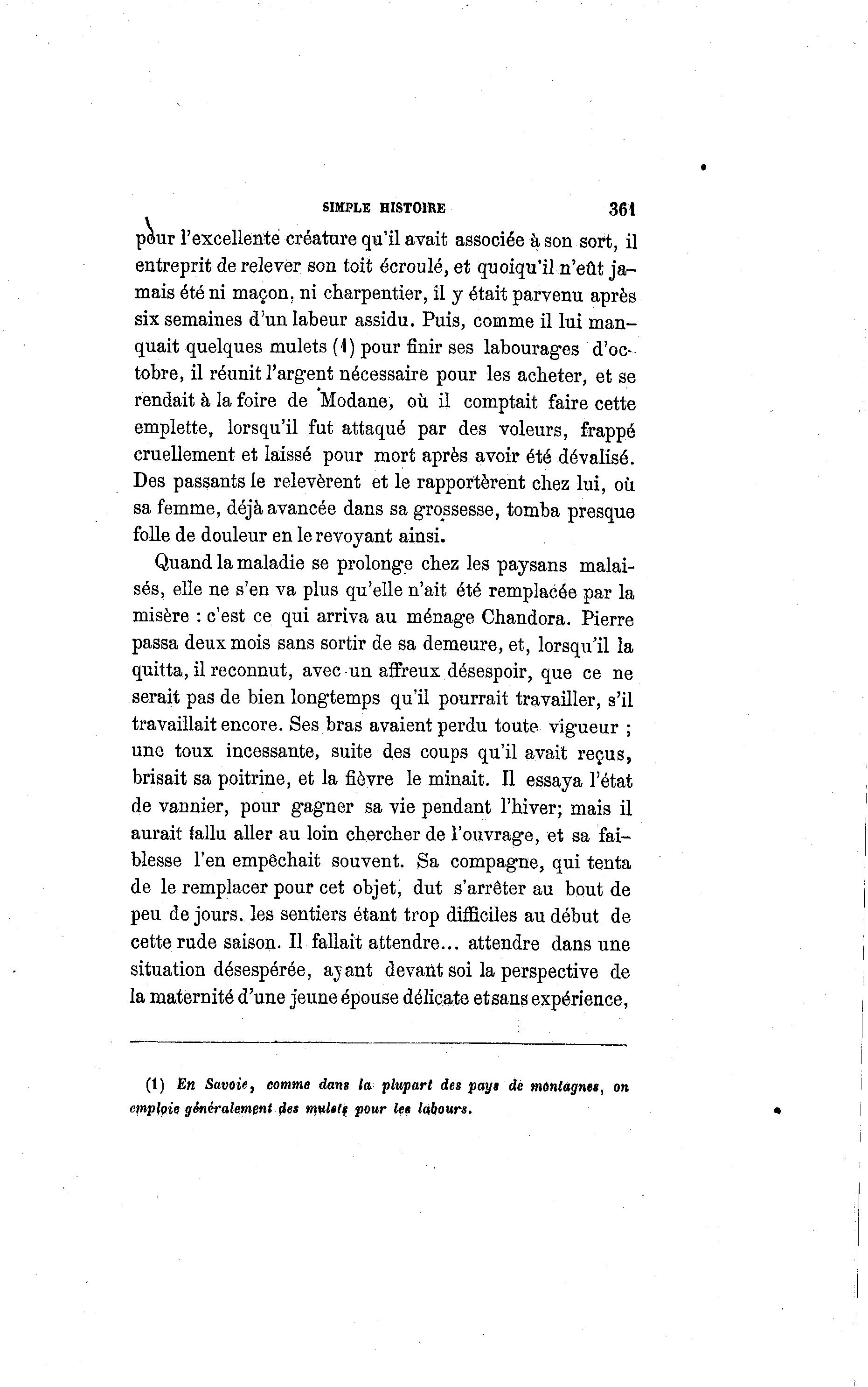 SIMPLE HISTOIRE 361 pour l'excellente créature qu'il avait associée à son sort, il entreprit de relever son toit écroulé, et quoiqu'il n'eût ja- mais été ni maçon, ni charpentier, il y était parvenu après six semaines d'un labeur assidu. Puis, comme il lui man- quait quelques mulets (1) pour finir ses labourages d'oc- tobre, il réunit l'argent nécessaire pour les acheter, et se rendait à la foire de Modane, où il comptait faire cette emplette, lorsqu'il fut attaqué par des voleurs, frappé cruellement et laissé pour mort après avoir été dévalisé. Des passants le relevèrent et le rapportèrent chez lui, où sa femme, déjà avancée dans sa grossesse, tomba presque folle de douleur en le revoyant ainsi. Quand la maladie se prolonge chez les paysans malai- sés, elle ne s'en va plus qu'elle n'ait été remplacée par la misère : c'est ce qui arriva au ménage Chandora. Pierre passa deux mois sans sortir de sa demeure, et, lorsqu'il la quitta, il reconnut, avec un affreux désespoir, que ce ne serait pas de bien longtemps qu'il pourrait travailler, s'il travaillait encore. Ses bras avaient perdu toute vigueur ; une toux incessante, suite des coups qu'il avait reçus, brisait sa poitrine, et la fièvre le minait. Il essaya l'état de vannier, pour gagner sa vie pendant l'hiver; mais il aurait fallu aller au loin chercher de l'ouvrage, et sa fai- blesse l'en empêchait souvent. Sa compagne, qui tenta de le remplacer pour cet objet, dut s'arrêter au bout de peu de jours, les sentiers étant trop difficiles au début de cette rude saison. Il fallait attendre... attendre dans une situation désespérée, ajant devant soi la perspective de la maternité d'une jeune épouse délicate etsans expérience, (1) En Savoie, comme dans la plupart des pays de montagnes, on cmpfpie généralement des muletf pour les labours. •