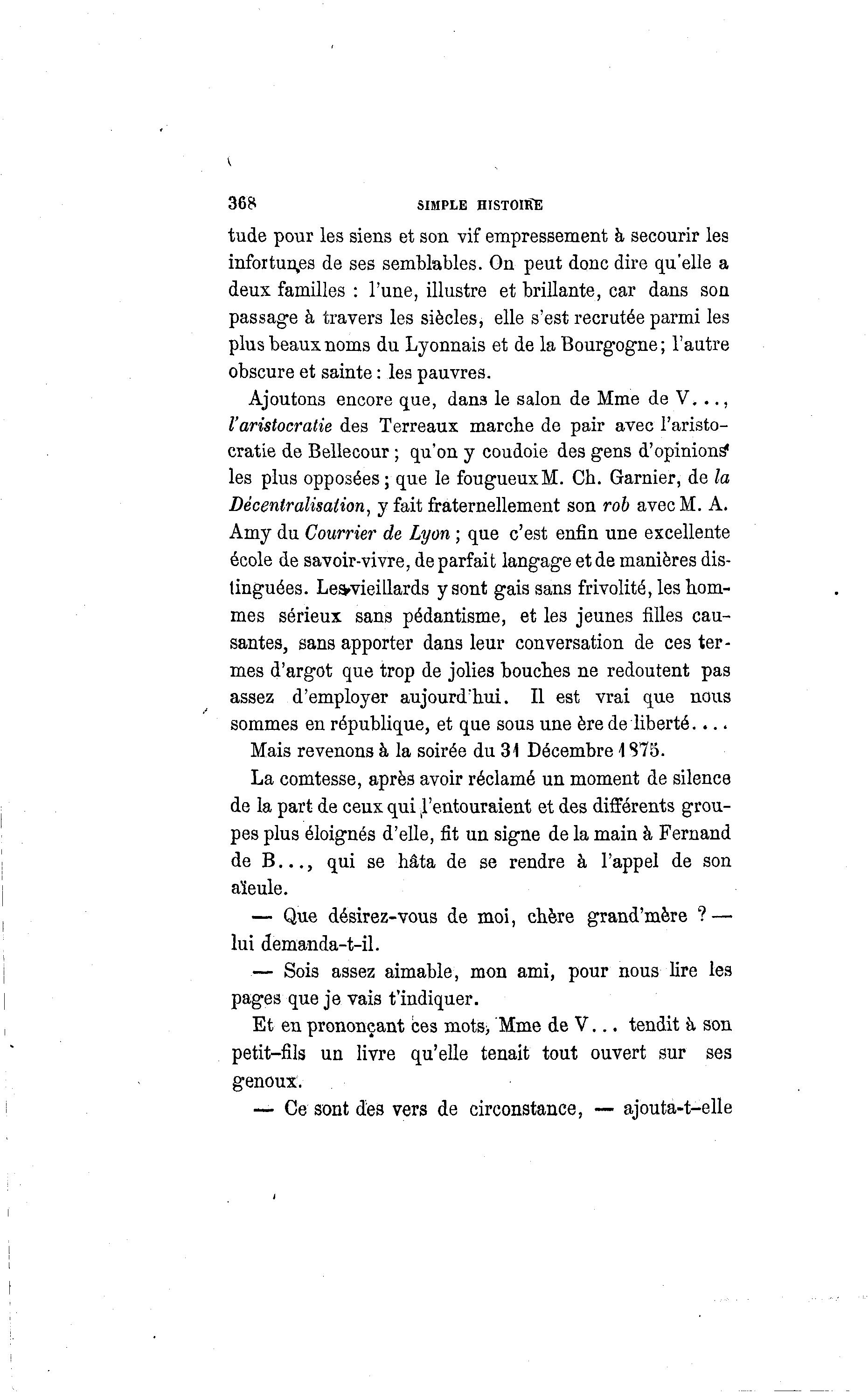 V 368 SIMPLE HISTOIRE tude pour les siens et son vif empressement à secourir les infortun.es de ses semblables. On peut donc dire qu'elle a deux familles : l'une, illustre et brillante, car dans son passage à travers les siècles, elle s'est recrutée parmi les plus beaux noms du Lyonnais et de la Bourgogne ; l'autre obscure et sainte : les pauvres. Ajoutons encore que, dans le salon de Mme de V. . . , l'aristocratie des Terreaux marche de pair avec l'aristo- cratie de Bellecour ; qu'on y coudoie des gens d'opinions* les plus opposées; que le fougueuxM. Ch. Garnier, de la Décentralisation, y fait fraternellement son rob avec M. A. Amy du Courrier de Lyon ; que c'est enfin une excellente école de savoir-vivre, de parfait langage et de manières dis- tinguées. Les/vieillards y sont gais sans frivolité, les hom- mes sérieux sans pédantisme, et les jeunes filles cau- santes, sans apporter dans leur conversation de ces ter- mes d'argot que trop de jolies bouches ne redoutent pas assez d'employer aujourd'hui. Il est vrai que nous sommes en république, et que sous une ère de liberté.... Mais revenons à la soirée du 31 Décembre \ 875. La comtesse, après avoir réclamé un moment de silence de la part de ceux qui ^'entouraient et des différents grou- pes plus éloignés d'elle, fit un signe de la main à Fernand de B . . . , qui se hâta de se rendre à l'appel de son aïeule. — Que désirez-vous de moi, chère grand'mère ? — lui demanda-t-il. — Sois assez aimable, mon ami, pour nous lire les pages que je vais t'indiquer. Et en prononçant ces mots> Mme de V . . . tendit à son petit-fils un livre qu'elle tenait tout ouvert sur ses genoux. — Ce sont des vers de circonstance, — ajouta-t-elle