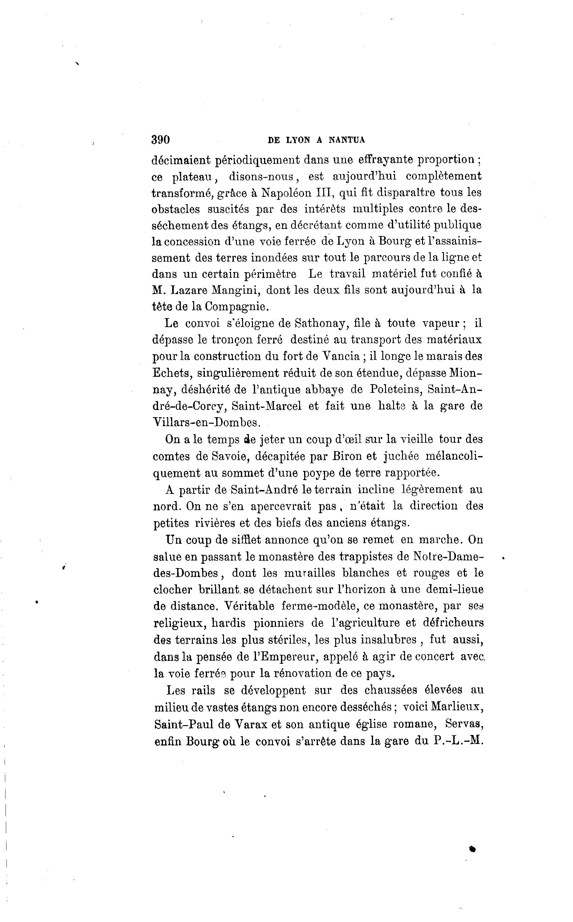 390 DE LYON A NANTUA décimaient périodiquement dans une effrayante proportion ; ce plateau, disons-nous, est aujourd'hui complètement transformé, grâce à Napoléon III, qui fit disparaître tous les obstacles suscités par des intérêts multiples contre le des- sèchement des étangs, en décrétant comme d'utilité publique la concession d'une voie ferrée de Lyon à Bourg et l'assainis- sement des terres inondées sur tout le parcours de la ligne et dans un certain périmètre Le travail matériel fut confié à M. Lazare Mangini, dont les deux fils sont aujourd'hui à la tète de la Compagnie. Le convoi s'éloigne de Sathonay, file à toute vapeur ; il dépasse le tronçon ferré destiné au transport des matériaux pour la construction du fort de Vancia ; il longe le marais des Echets, singulièrement réduit de son étendue, dépasse Mion- nay, déshérité de l'antique abbaye de Poleteins, Saint-An- dré-de-Corcy, Saint-Marcel et fait une halte à la gare de Villars-en-Dombes. On a le temps de jeter un coup d'oeil sur la vieille tour des comtes de Savoie, décapitée par Biron et juchée mélancoli- quement au sommet d'une poype de terre rapportée. A partir de Saint-André le terrain incline légèrement au nord. On ne s'en apercevrait pas, n'était la direction des petites rivières et des biefs des anciens étangs. Un coup de sifflet annonce qu'on se remet en marche. On salue en passant le monastère des trappistes de Nolre-Dame- des-Dombes, dont les murailles blanches et rouges et le clocher brillant, se détachent sur l'horizon à une demi-lieue de distance. Véritable ferme-modèle, ce monastère, par ses religieux, hardis pionniers de l'agriculture et défricheurs des terrains les plus stériles, les plus insalubres , fut aussi, dans la pensée de l'Empereur, appelé à agir de concert avec, la voie ferré?, pour la rénovation de ce pays. Les rails se développent sur des chaussées élevées au milieu de vastes étangs non encore desséchés ; voici Marlieux, Saint-Paul de Varax et son antique église romane, Servas, enfin Bourg où le convoi s'arrête dans la gare du P.-L.-M.