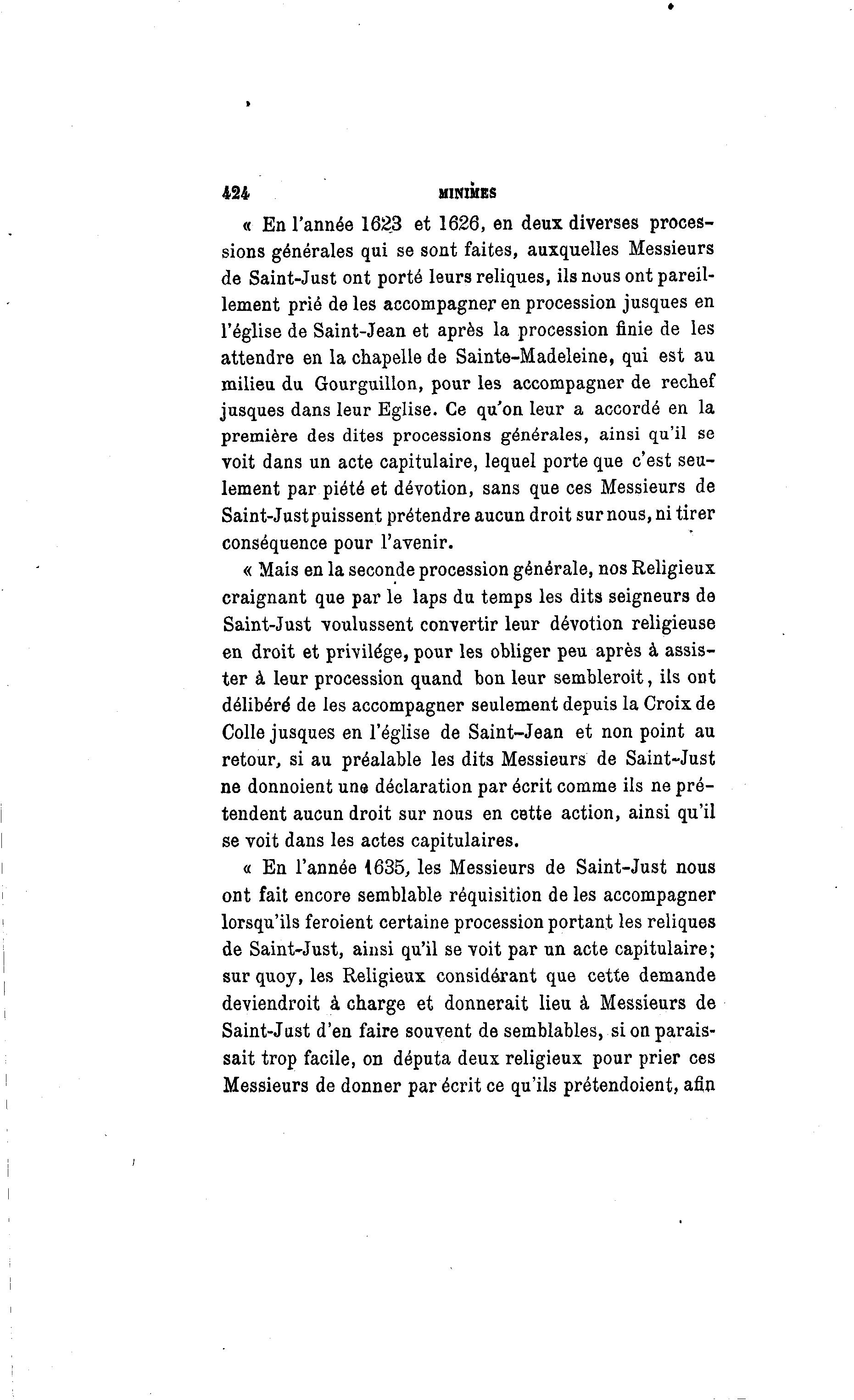 424 MINIMES « En l'année 1623 et 1626, en deux diverses proces- sions générales qui se sont faites, auxquelles Messieurs de Saint-Just ont porté leurs reliques, ils nous ont pareil- lement prié de les accompagner en procession jusques en l'église de Saint-Jean et après la procession finie de les attendre en la chapelle de Sainte-Madeleine, qui est au milieu du Gourguillon, pour les accompagner de rechef jusques dans leur Eglise. Ce qu'on leur a accordé en la première des dites processions générales, ainsi qu'il se voit dans un acte capitulaire, lequel porte que c'est seu- lement par piété et dévotion, sans que ces Messieurs de Saint-Just puissent prétendre aucun droit sur nous, ni tirer conséquence pour l'avenir. « Mais en la seconde procession générale, nos Religieux craignant que par le laps du temps les dits seigneurs de Saint-Just voulussent convertir leur dévotion religieuse en droit et privilège, pour les obliger peu après à assis- ter à leur procession quand bon leur sembleroit, ils ont délibéré de les accompagner seulement depuis la Croix de Colle jusques en l'église de Saint-Jean et non point au retour, si au préalable les dits Messieurs de Saint-Just ne donnoient une déclaration par écrit comme ils ne pré- tendent aucun droit sur nous en cette action, ainsi qu'il se voit dans les actes capitulaires. « En l'année 1635, les Messieurs de Saint-Just nous ont fait encore semblable réquisition de les accompagner lorsqu'ils feroient certaine procession portant les reliques de Saint-Just, ainsi qu'il se voit par un acte capitulaire; sur quoy, les Religieux considérant que cette demande deviendroit à charge et donnerait lieu à Messieurs de Saint-Just d'en faire souvent de semblables, si on parais- sait trop facile, on députa deux religieux pour prier ces Messieurs de donner par écrit ce qu'ils prétendoient, afin
