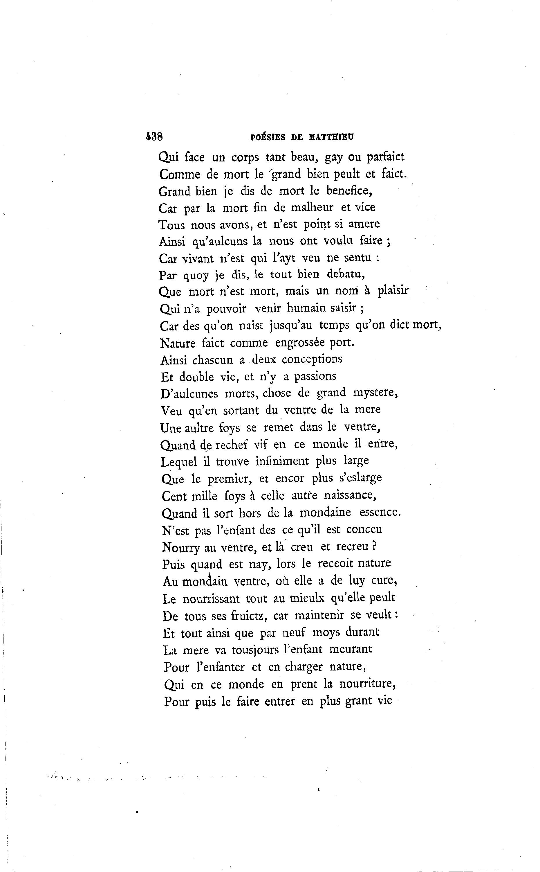 438 POÉSIES DE MATTHIEU Qui face un corps tant beau, gay ou parfaict Comme de mort le 'grand bien peult et faict. Grand bien je dis de mort le bénéfice, Car par la mort fin de malheur et vice Tous nous avons, et n'est point si amere Ainsi qu'aulcuns la nous ont voulu faire ; Car vivant n'est qui l'ayt veu ne sentu : Par quoy je dis, le tout bien debatu, Que mort n'est mort, mais un nom à plaisir Qui n'a pouvoir venir humain saisir ; Car des qu'on naist jusqu'au temps qu'on dict mort, Nature faict comme engrossée port. Ainsi chascun a deux conceptions Et double vie, et n'y a passions D'aulcunes morts, chose de grand mystère, Veu qu'en sortant du ventre de la mère Une aultre foys se remet dans le ventre, Quand de rechef vif en ce monde il entre, Lequel il trouve infiniment plus large Que le premier, et encor plus s'eslarge Cent mille foys à celle autre naissance, Quand il sort hors de la mondaine essence. N'est pas l'enfant des ce qu'il est conceu Nourry au ventre, et là creu et recreu ? Puis quand est nay, lors le receoit nature Au mondain ventre, où elle a de luy cure, Le nourrissant tout au mieulx qu'elle peult De tous ses fruictz, car maintenir se veult : Et tout ainsi que par neuf moys durant La mère va tousjours l'enfant meurant Pour l'enfanter et en charger nature, Qui en ce monde en prent la nourriture, Pour puis le faire entrer en plus grant vie