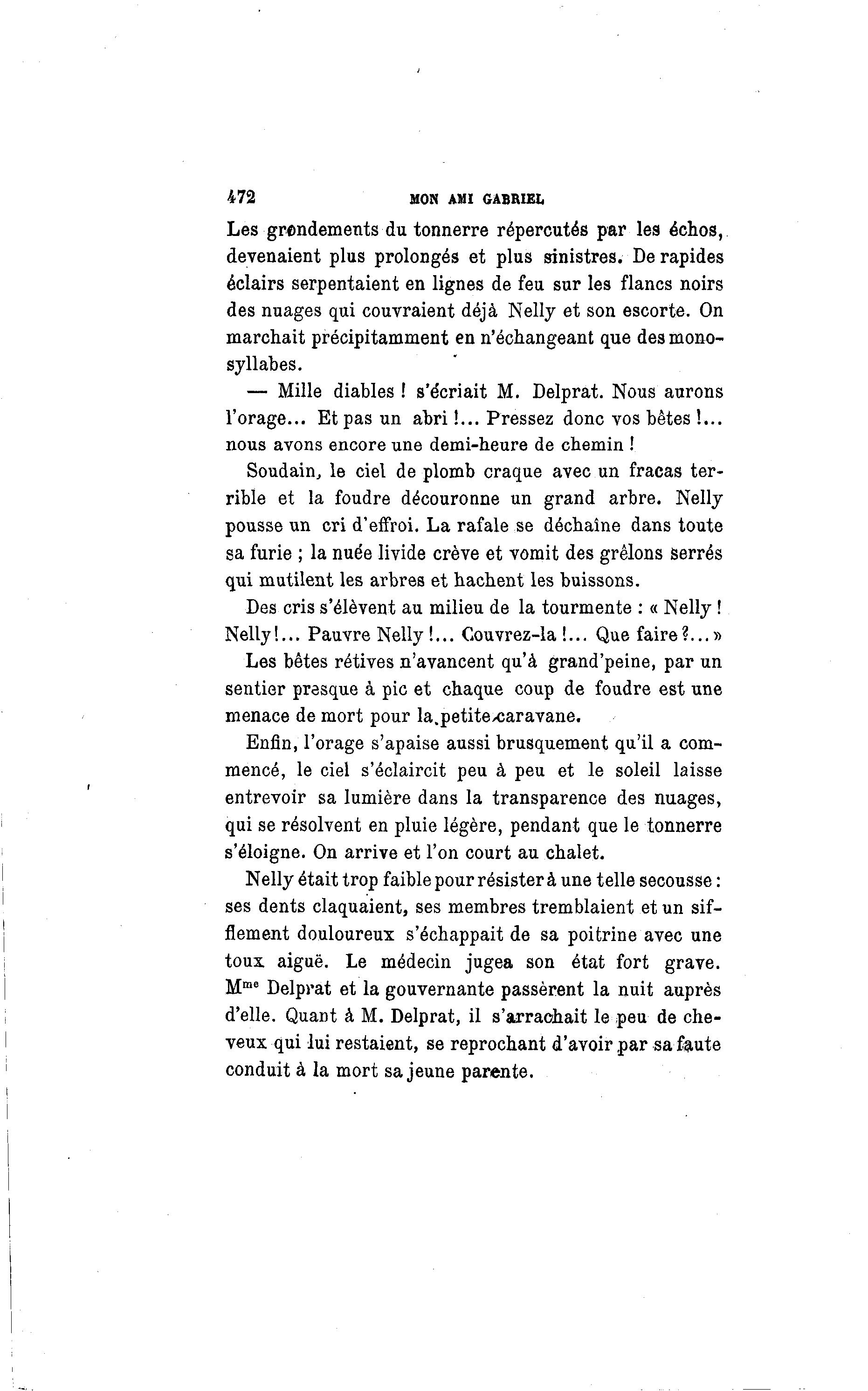 472 MON AMI GABRIEL Les grondements du tonnerre répercutés par les échos, devenaient plus prolongés et plus sinistres. De rapides éclairs serpentaient en lignes de feu sur les flancs noirs des nuages qui couvraient déjà Nelly et son escorte. On marchait précipitamment en n'échangeant que des mono- syllabes. — Mille diables ! s'écriait M. Delprat. Nous aurons l'orage... Et pas un abri !... Pressez donc vos bêtes !... nous avons encore une demi-heure de chemin ! Soudain, le ciel de plomb craque avec un fracas ter- rible et la foudre découronne un grand arbre. Nelly pousse un cri d'effroi. La rafale se déchaîne dans toute sa furie ; la nuée livide crève et vomit des grêlons serrés qui mutilent les arbres et hachent les buissons. Des cris s'élèvent au milieu de la tourmente : « Nelly ! Nelly !... Pauvre Nelly !... Couvrez-la !... Que faire ?... » Les bêtes rétives n'avancent qu'à grand'peine, par un sentier presque à pic et chaque coup de foudre est une menace de mort pour la.petite/caravane. Enfin, l'orage s'apaise aussi brusquement qu'il a com- mencé, le ciel s'éclaircit peu à peu et le soleil laisse entrevoir sa lumière dans la transparence des nuages, qui se résolvent en pluie légère, pendant que le tonnerre s'éloigne. On arrive et l'on court au chalet. Nelly était trop faible pour résistera une telle secousse : ses dents claquaient, ses membres tremblaient et un sif- flement douloureux s'échappait de sa poitrine avec une toux aiguë. Le médecin jugea son état fort grave. Mmc Delprat et la gouvernante passèrent la nuit auprès d'elle. Quant à M. Delprat, il s'arrachait le peu de che- veux qui lui restaient, se reprochant d'avoir par sa faute conduit à la mort sa jeune parente.