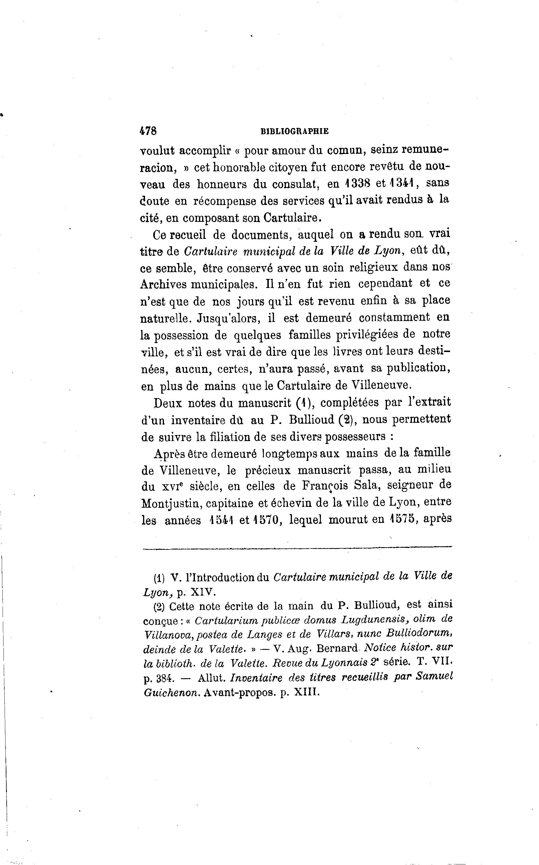 478 BIBLIOGRAPHIE voulut accomplir « pour amour du comun, seinz remune- racion, » cet honorable citoyen fut encore revêtu de nou- veau des honneurs du consulat, en 4338 et 1344, sans doute en récompense des services qu'il avait rendus à la cité, en composant son Cartulaire. Ce recueil de documents, auquel on a rendu son. vrai titre de Cartulaire municipal de la Ville de Lyon, eût dû, ce semble, être conservé avec un soin religieux dans nos Archives municipales. Il n'en fut rien cependant et ce n'est que de nos jours qu'il est revenu enfin à sa place naturelle. Jusqu'alors, il est demeuré constamment en la possession de quelques familles privilégiées de notre ville, et s'il est vrai de dire que les livres ont leurs desti- nées, aucun, certes, n'aura passé, avant sa publication, en plus de mains que le Cartulaire de Villeneuve. Deux notes du manuscrit (1), complétées par l'extrait d'un inventaire dû au P. Bullioud (2), nous permettent de suivre la filiation de ses divers possesseurs : Après être demeuré longtemps aux mains de la famille de Villeneuve, le précieux manuscrit passa, au milieu du xvic siècle, en celles de François Sala, seigneur de Montjustin, capitaine et échevin de la ville de Lyon, entre les années 4541 et 1570, lequel mourut en 1575, après (1) V. l'Introduction du Cartulaire municipal de la Ville de Lyon., p. XIV. (2) Cette note écrite de la main du P. Bullioud, est ainsi conçue : « Cartularium publicœ domus Lugdunensis, olirn de Villanova, postea de Langes et de Villars, nunc Bulliodorum, deinde de la Valette- » — V. Aug. Bernard Notice histor. sur labiblioth. delà Valette. Revue du Lyonnais 2" série. T. VII. p. 384. — Allut. Inventaire des titres recueillis par Samuel Guichenon. Avant-propos, p. XIII.