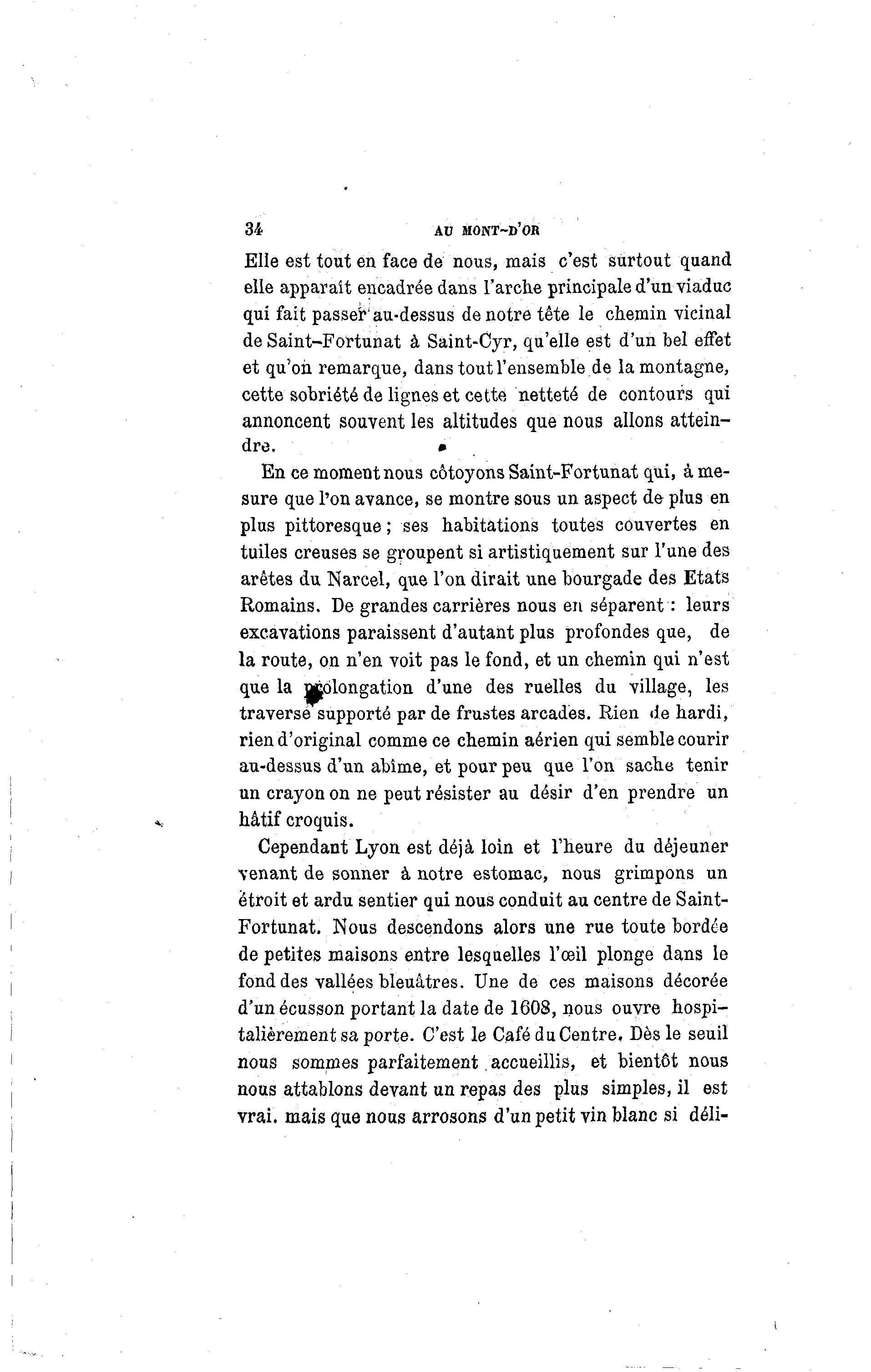 34 AU MONT-D'OR Elle est tout en face de nous, mais c'est surtout quand elle apparaît encadrée dans l'arche principale d'un viaduc qui fait passer'au-dessus de notre tête le chemin vicinal de Saint-Fortunat à Saint-Cyr, qu'elle est d'un bel effet et qu'on remarque, dans tout l'ensemble de la montagne, cette sobriété de lignes et cette netteté de contours qui annoncent souvent les altitudes que nous allons attein- dre, m En ce moment nous côtoyons Saint-Fortunat qui, à me- sure que l'on avance, se montre sous un aspect de plus en plus pittoresque ; ses habitations toutes couvertes en tuiles creuses se groupent si artistiquement sur l'une des arêtes du Narcel, que l'on dirait une bourgade des Etats Romains. De grandes carrières nous en séparent : leurs excavations paraissent d'autant plus profondes que, de la route, on n'en voit pas le fond, et un chemin qui n'est que la jcolongation d'une des ruelles du village, les traversé supporté par de frustes arcades. Rien de hardi, rien d'original comme ce chemin aérien qui semble courir au-dessus d'un abîme, et pour peu que l'on sache tenir un crayon on ne peut résister au désir d'en prendre un hâtif croquis. Cependant Lyon est déjà loin et l'heure du déjeuner venant de sonner à notre estomac, nous grimpons un étroit et ardu sentier qui nous conduit au centre de Saint- Fortunat. Nous descendons alors une rue toute bordée de petites maisons entre lesquelles l'œil plonge dans le fond des vallées bleuâtres. Une de ces maisons décorée d'un écusson portant la date de 1603, nous ouvre hospi- talièrement sa porte. C'est le Café du Centre, Dès le seuil nous sommes parfaitement. accueillis, et bientôt nous nous attablons devant un repas des plus simples, il est vrai, mais que nous arrosons d'un petit vin blanc si déli-