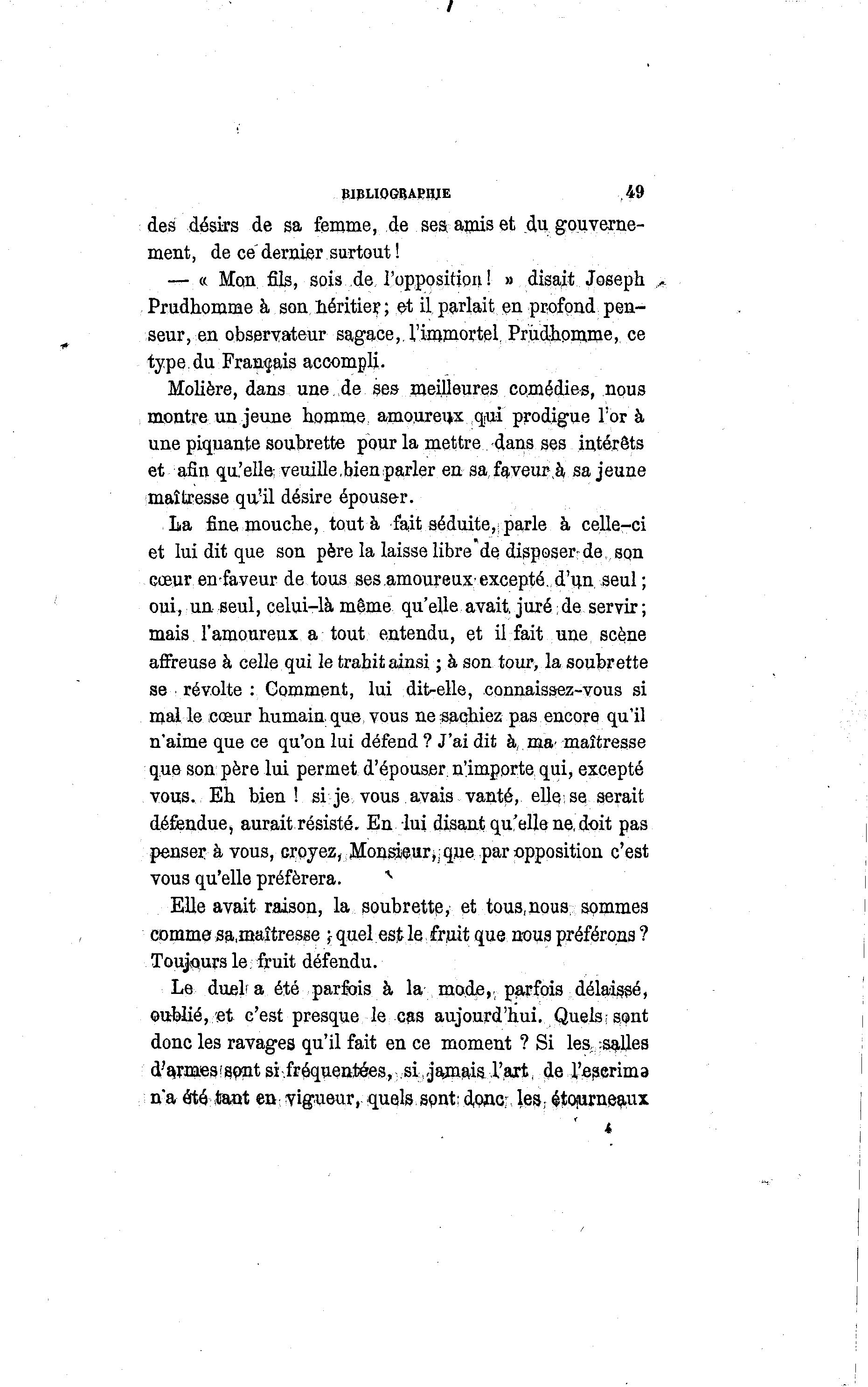 / WPLIOGBARHJE ,49 des désirs de sa femme, de ses amis et du gouverne- ment, de ce"dernier surtout! — « Mon fils, sois de l'opposition ! » disait Joseph *. Prudhomme à son néritier ; et il parfait eu profond pen- seur, en observateur sagace,, l'immortel Prudh.om.me, ce type.du Français accompli. Molière, dans une .de ses meilleures comédies, nous montre un jeune homme amoureux qui prodigue l'or à une piquante soubrette pour la mettre dans ses intérêts et afin qu'elle veuille, bien parler en safaveur.à sa jeune maîtresse qu'il désire épouser. La fine mouche, tout à fait séduite,; parle à celle-ci et lui dit que son père la laisse libre'de disposer-de, son cœur en faveur de tous ses amoureux-excepté, d'un seul ; oui, un seul, celui-là même qu'elle avait, juré de servir ; mais l'amoureux a tout entendu, et il fait une scène affreuse à celle qui le trahit ainsi ; à son tour, la soubrette se révolte : Gomment, lui dit-elle, connaissez-vous si mal le cœur humain, que. vous ne sachiez pas encore qu'il n'aime que ce qu'on lui défend ? J'ai dit à , ma- maîtresse que son père lui permet d'épouser, n'importe qui, excepté vous. Eh bien ! si je vous avais vanté, elle; se serait défendue, aurait résisté. En lui disant qu'elle ne, doit pas penser à vous, croyez, Monsieur;• que par opposition c'est vous qu'elle préférera. ^ Elle avait raison, la soubrette, et tous,nous sommes comme sa.maîtresse y quel est le fruit que nous préférons ? Toujours le: fruit défendu. Le duel a été parfois à la mode,, parfois délaissé, oublié, et c'est presque le cas aujourd'hui. Quels; sont donc les ravages qu'il fait en ce moment ? Si les, -salles d'armes (sont si fréquentées, .si, jamais l'art, de l'eaerima n'a été tant en- vigueur, quels sont; donc; les ; étoiurneaux *
