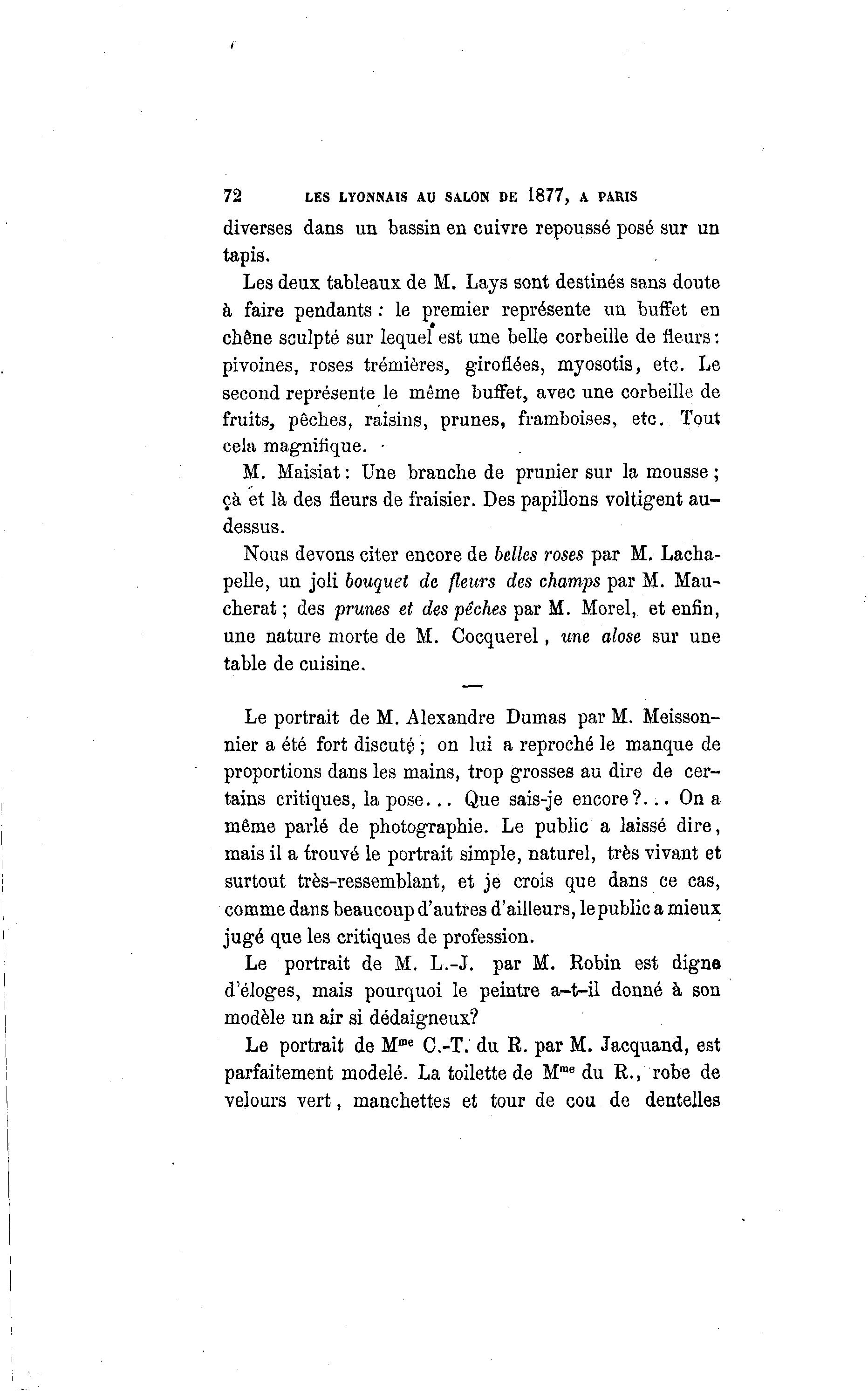 72 LES LYONNAIS AU SALON DE 1877, A PARIS diverses dans un bassin en cuivre repoussé posé sur un tapis. Les deux tableaux de M. Lays sont destinés sans doute à faire pendants : le premier représente un buffet en chêne sculpté sur lequel est une belle corbeille de fleurs : pivoines, roses trémières, giroflées, myosotis, etc. Le second représente le même buffet, avec une corbeille de fruits, pêches, raisins, prunes, framboises, etc. Tout cela magnifique. • M. Maisiat : Une branche de prunier sur la mousse ; ça et là des fleurs de fraisier. Des papillons voltigent au- dessus. Nous devons citer encore de belles roses par M. Lacha- pelle, un joli bouquet de fleurs des champs par M. Mau- cherat ; des prunes et des pêches par M. Morel, et enfin, une nature morte de M. Cocquerel, une alose sur une table de cuisine. Le portrait de M. Alexandre Dumas par M. Meisson- nier a été fort discuté ; on lui a reproché le manque de proportions dans les mains, trop grosses au dire de cer- tains critiques, la pose... Que sais-je encore?... On a même parlé de photographie. Le public a laissé dire, mais il a trouvé le portrait simple, naturel, très vivant et surtout très-ressemblant, et je crois que dans ce cas, comme dans beaucoup d'autres d'ailleurs, le public a mieux jugé que les critiques de profession. Le portrait de M. L.-J. par M. Robin est digne d'éloges, mais pourquoi le peintre a-t-il donné à son modèle un air si dédaigneux? Le portrait de Mme C.-T. du R. par M. Jacquand, est parfaitement modelé. La toilette de Mme du R., robe de velours vert, manchettes et tour de cou de dentelles
