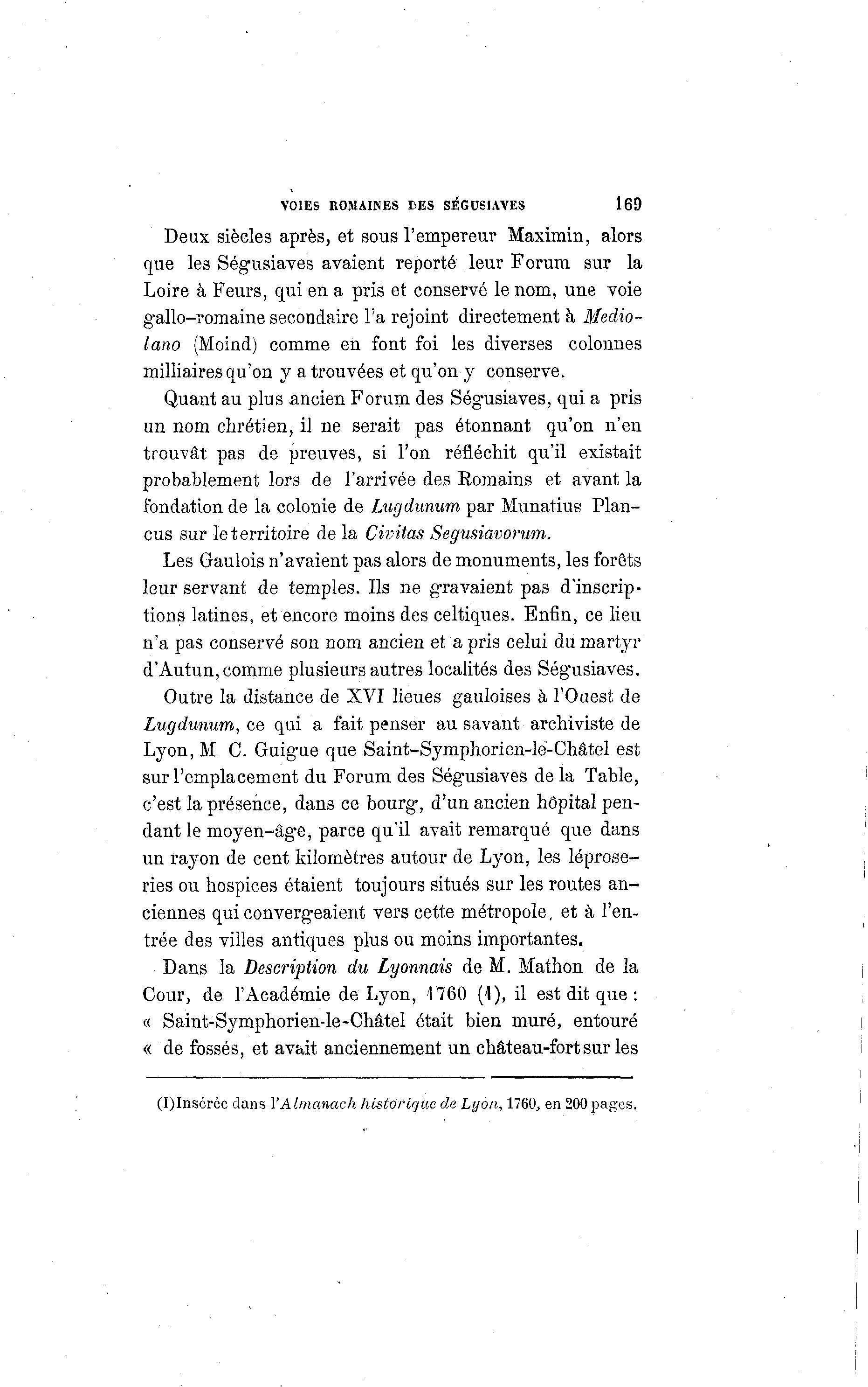 VOIES ROMAINES BES SÉGUSIAVES 169 Deux siècles après, et sous l'empereur Maximin, alors que les Ségusiaves avaient reporté leur Forum sur la Loire à Feurs, qui en a pris et conservé le nom, une voie gallo-romaine secondaire l'a rejoint directement à Medio- lano (Moind) comme en font foi les diverses colonnes milliaires qu'on y a trouvées et qu'on y conserve. Quant au plus ancien Forum des Ségusiaves, qui a pris un nom chrétien, il ne serait pas étonnant qu'on n'en trouvât pas de preuves, si l'on réfléchit qu'il existait probablement lors de l'arrivée des Romains et avant la fondation de la colonie de Lugdunum par Munatius Plan- cus sur le territoire de la Civitas Segusiavorum. Les Gaulois n'avaient pas alors de monuments, les forêts leur servant de temples. Ils ne gravaient pas d'inscrip- tions latines, et encore moins des celtiques. Enfin, ce lieu n'a pas conservé son nom ancien et a pris celui du martyr d'Autun, comme plusieurs autres localités des Ségusiaves. Outre la distance de XVI lieues gauloises à l'Ouest de Lugdunum, ce qui a fait penser au savant archiviste de Lyon, M C. Guigue que Saint-Symphorien-lé-Châtel est sur l'emplacement du Forum des Ségusiaves de la Table, c'est la présence, dans ce bourg, d'un ancien hôpital pen- dant le moyen-âge, parce qu'il avait remarqué que dans un rayon de cent kilomètres autour de Lyon, les léprose- ries ou hospices étaient toujours situés sur les routes an- ciennes qui convergeaient vers cette métropole, et à l'en- trée des villes antiques plus ou moins importantes. Dans la Description du Lyonnais de M. Mathon de la Cour, de l'Académie de Lyon, 1760 (1), il est dit que : « Saint-Symphorien-le-Châtel était bien muré, entouré « de fossés, et avait anciennement un château-fort sur les (I)Inséréo clans VAlmcmach historique de Lyon, 1760., en 200pages,