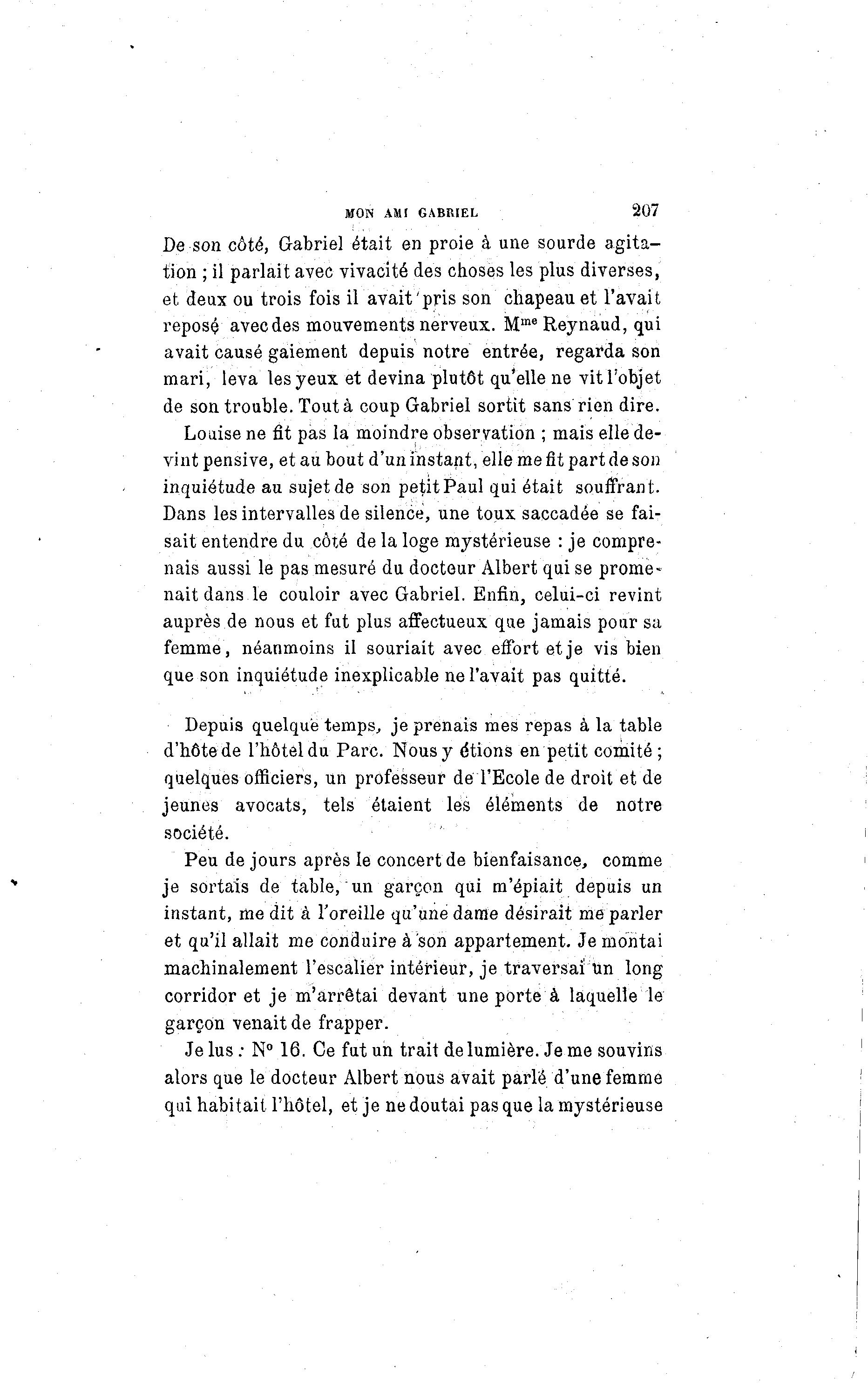 MON AMI GABRIEL 207 De son côté, Gabriel était en proie à une sourde agita- tion ; il parlait avec vivacité des choses les plus diverses, et deux ou trois fois il avait'pris son chapeau et l'avait reposé avecdes mouvements nerveux. Mme Reynaud, qui avait causé gaiement depuis notre entrée, regarda son mari, leva les yeux et devina plutôt qu'elle ne vit l'objet de son trouble. Tout à coup Gabriel sortit sans rien dire. Louise ne fit pas la moindre observation ; mais elle de- vint pensive, et au bout d'un instant, elle mefitpart de son inquiétude au sujet de son petit Paul qui était souffrant. Dans les intervalles de silence, une toux saccadée se fai- sait entendre du côté de la loge mystérieuse : je compre- nais aussi le pas mesuré du docteur Albert qui se prome- nait dans le couloir avec Gabriel. Enfin, celui-ci revint auprès de nous et fut plus affectueux que jamais pour sa femme, néanmoins il souriait avec effort et je vis bien que son inquiétude inexplicable ne l'avait pas quitté. Depuis quelque temps, je prenais mes repas à la table d'hôte de l'hôtel du Parc. Nous y étions en petit comité ; quelques officiers, un professeur de l'Ecole de droit et de jeunes avocats, tels étaient les éléments de notre société. Peu de jours après le concert de bienfaisance, comme je sortais de table, un garçon qui m'épiait depuis un instant, me dit à l'oreille qu'une dame désirait me parler et qu'il allait me conduire à son appartement. Je montai machinalement l'escalier intérieur, je traversai tin long corridor et je m'arrêtai devant une porte à laquelle le garçon venait de frapper. Je lus : N° 16. Ce fut un trait de lumière. Je me souvins alors que le docteur Albert nous avait parlé d'une femme qui habitait l'hôtel, et je ne doutai pas que la mystérieuse