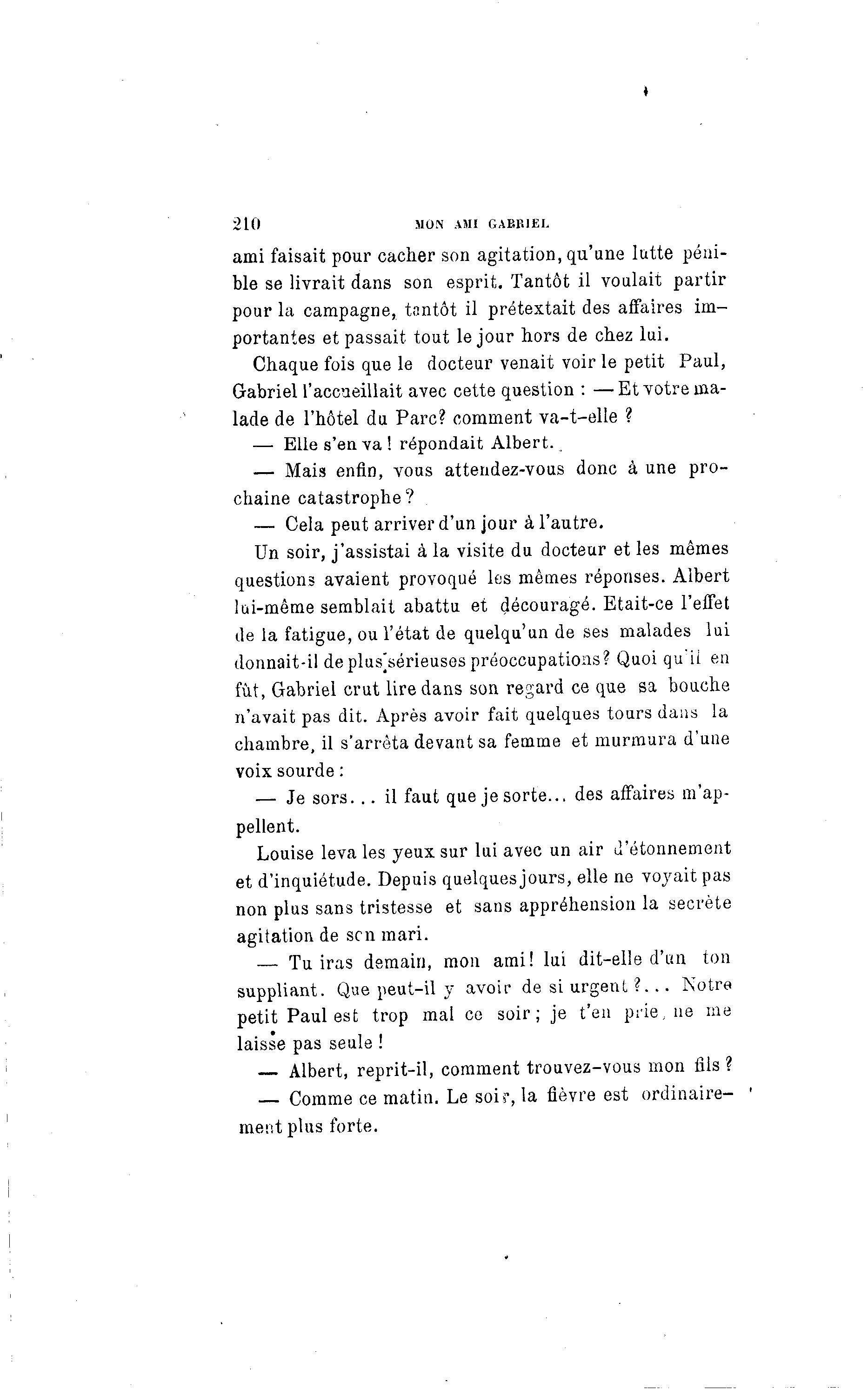210 MON AMI GABRIEL ami faisait pour cacher son agitation, qu'une lutte péni- ble se livrait dans son esprit. Tantôt il voulait partir pour la campagne, tantôt il prétextait des affaires i m - portantes et passait tout le jour hors de chez lui. Chaque fois que le docteur venait voir le petit Paul, Gabriel l'accueillait avec cette question : — E t votre ma- lade de l'hôtel du Parc? comment va-t-elle ? — Elle s'en va ! répondait Albert. — Mais enfin, vous attendez-vous donc à une pro- chaine catastrophe ? — Cela peut arriver d'un jour à l'autre. Un soir, j'assistai à la visite du docteur et les mêmes questions avaient provoqué les mêmes réponses. Albert lui-même semblait abattu et découragé. Etait-ce l'effet de la fatigue, ou l'état de quelqu'un de ses malades lui donnait-il deplus^sérieuses préoccupations? Quoi qu'il en fût, Gabriel crut lire dans son regard ce que sa bouche n'avait pas dit. Après avoir fait quelques tours dans la chambre, il s'arrêta devant sa femme et murmura d'une voix sourde : — Je sors. . . il faut que je sorte... des affaires m'ap- pellent. Louise leva les yeux sur lui avec un air J'étonnement et d'inquiétude. Depuis quelquesjours, elle ne voyait pas non plus sans tristesse et sans appréhension la secrète agitation de scn mari. — Tu iras demain, mon ami! lui dit-elle d'un ton suppliant. Que peut-il y avoir de si urgent ? . . . Notre petit Paul est trop mal ce soir; je t'en prie, ne me laisse pas seule ! — Albert, reprit-il, comment trouvez-vous mon fils ? — Comme ce matin. Le soir, la fièvre est ordinaire- ment plus forte.