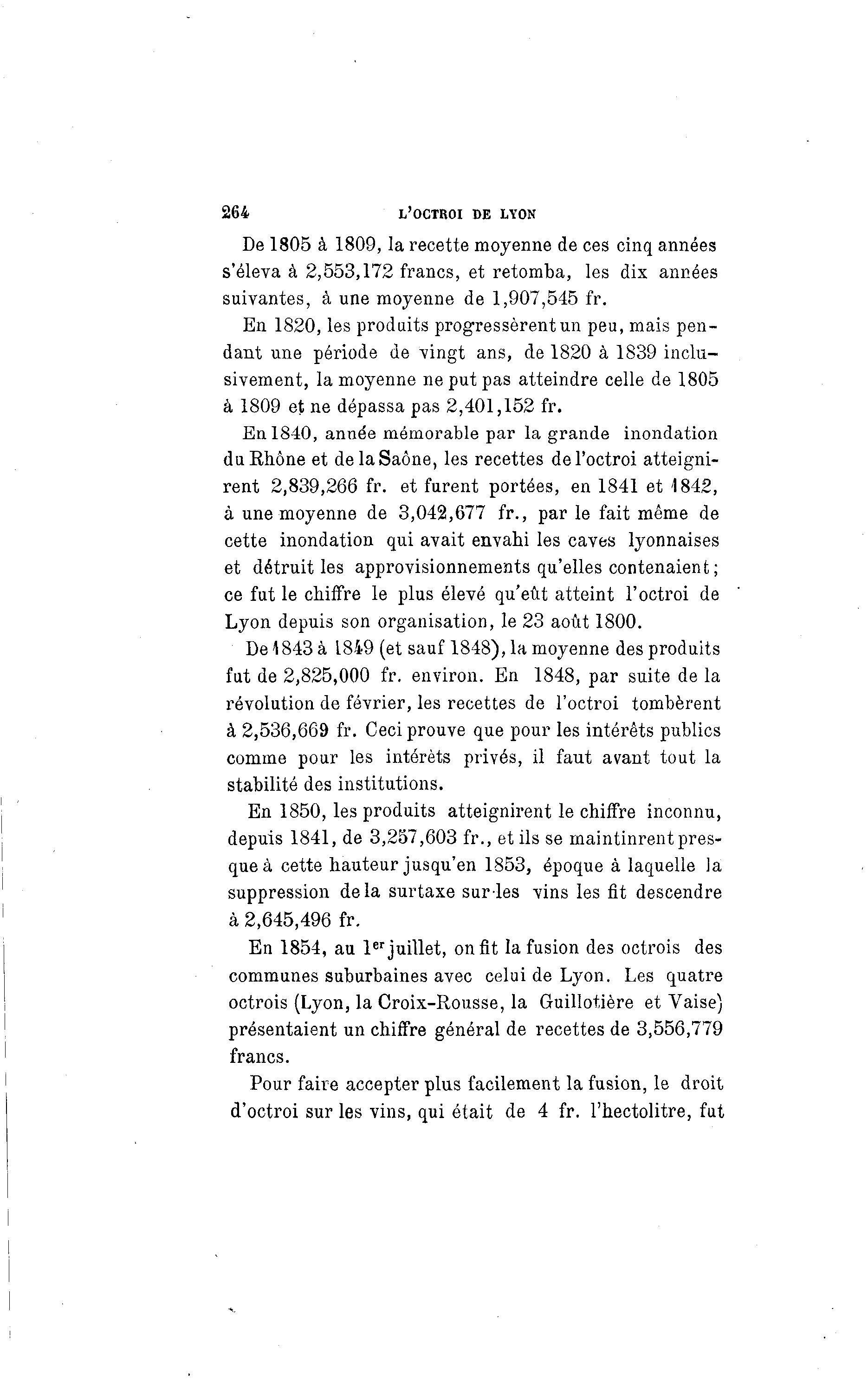 264 L'OCTROI DE LYON De 1805 à 1809, la recette moyenne de ces cinq années s'éleva à 2,553,172 francs, et retomba, les dix années suivantes, à une moyenne de 1,907,545 fr. En 1820, les produits progressèrent un peu, mais pen- dant une période de vingt ans, de 1820 à 1839 inclu- sivement, la moyenne ne put pas atteindre celle de 1805 à 1809 et ne dépassa pas 2,401,152 fr. En 1840, année mémorable par la grande inondation du Rhône et de la Saône, les recettes de l'octroi atteigni- rent 2,839,266 fr. et furent portées, en 1841 et 1842, à une moyenne de 3,042,677 fr., par le fait même de cette inondation qui avait envahi les caves lyonnaises et détruit les approvisionnements qu'elles contenaient; ce fut le chiffre le plus élevé qu'eût atteint l'octroi de Lyon depuis son organisation, le 23 août 1800. De 1843 à 1849 (et sauf 1848), la moyenne des produits fut de 2,825,000 fr. environ. En 1848, par suite de la révolution de février, les recettes de l'octroi tombèrent à 2,536,669 fr. Ceci prouve que pour les intérêts publics comme pour les intérêts privés, il faut avant tout la stabilité des institutions. En 1850, les produits atteignirent le chiffre inconnu, depuis 1841, de 3,257,603 fr., et ils se maintinrent pres- que à cette hauteur jusqu'en 1853, époque à laquelle la suppression delà surtaxe surles vins les fit descendre à 2,645,496 fr. En 1854, au 1 er juillet, on fit la fusion des octrois des communes suburbaines avec celui de Lyon. Les quatre octrois (Lyon, la Croix-Rousse, la Guillotière et Vaise) présentaient un chiffre général de recettes de 3,556,779 francs. Pour faire accepter plus facilement la fusion, le droit d'octroi sur les vins, qui était de 4 fr. l'hectolitre, fut