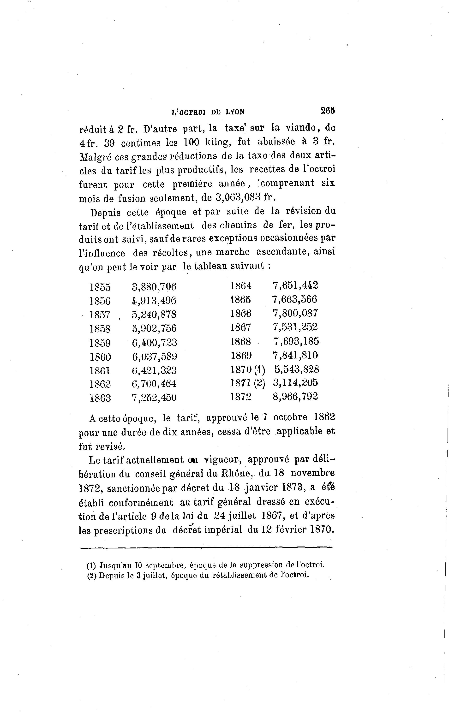 L'OCTROI DE LYON 265 1 réduit à 2 fr. D'autre part, la taxe sur la viande, de 4fr. 39 centimes les 100 kilog, fut abaissée à 3 fr. Malgré ces grandes réductions de la taxe des deux arti- cles du tarif les plus productifs, les recettes de l'octroi furent pour cette première année, 'comprenant six mois de fusion seulement, de 3,063,083 fr. Depuis cette époque et par suite de la révision du tarif et de l'établissement des chemins de fer, les pro- duits ont suivi, sauf de rares exceptions occasionnées par l'influence des récoltes, une marche ascendante, ainsi qu'on peut le voir par le tableau suivant : 1855 3,880,706 1864 7,651,442 1856 4,913,496 1865 7,663,566 1857 , 5,240,873 1866 7,800,087 1858 5,902,756 1867 7,531,252 1859 6,400,723 1868 7,693,185 1860 6,037,589 1869 7,841,810 1861 6,421,323 1870(1) 5,543,828 1862 6,700,464 1871 (2) 3,114,205 1863 7,252,450 1872 8,966,792 A cette époque, le tarif, approuvé le 7 octobre 1862 pour une durée de dix années, cessa d'être applicable et fut revisé. Le tarif actuellement en vigueur, approuvé par déli- bération du conseil général du Rhône, du 18 novembre 1872, sanctionnée par décret du 18 janvier 1873, a ét'é établi conformément au tarif général dressé en exécu- tion de l'article 9 delà loi du 24 juillet 1867, et d'après les prescriptions du décret impérial du 12 février 1870. (1) Jusqu'au 10 septembre, époque de la suppression de l'octroi. (2) Depuis le 3 juillet, époque du rétablissement de l'octroi.