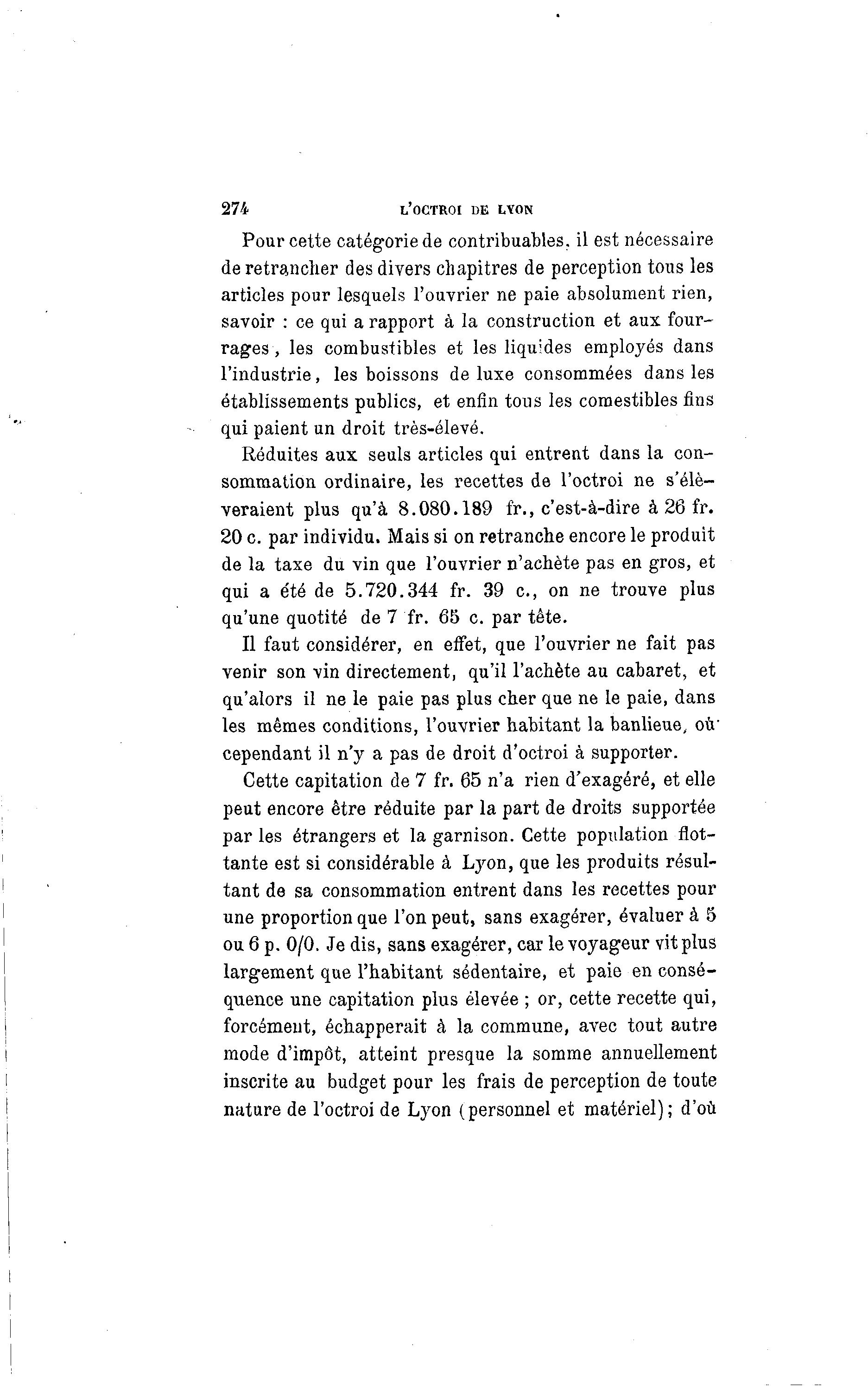 274 L'OCTROI DE LYON Pour cette catégorie de contribuables, il est nécessaire de retrancher des divers chapitres de perception tous les articles pour lesquels l'ouvrier ne paie absolument rien, savoir : ce qui a rapport à la construction et aux four- rages , les combustibles et les liquides employés dans l'industrie, les boissons de luxe consommées dans les établissements publics, et enfin tous les comestibles fins qui paient un droit très-élevé. Réduites aux seuls articles qui entrent dans la con- sommation ordinaire, les recettes de l'octroi ne s'élè- veraient plus qu'à 8.080.189 fr., c'est-à -dire à 26 fr. 20 c. par individu. Mais si on retranche encore le produit de la taxe du vin que l'ouvrier n'achète pas en gros, et qui a été de 5.720.344 fr. 39 c , on ne trouve plus qu'une quotité de 7 fr. 65 c. par tête. Il faut considérer, en effet, que l'ouvrier ne fait pas venir son vin directement, qu'il l'achète au cabaret, et qu'alors il ne le paie pas plus cher que ne le paie, dans les mêmes conditions, l'ouvrier habitant la banlieue, où' cependant il n'y a pas de droit d'octroi à supporter. Cette capitation de 7 fr. 65 n'a rien d'exagéré, et elle peut encore être réduite par la part de droits supportée par les étrangers et la garnison. Cette population flot- tante est si considérable à Lyon, que les produits résul- tant de sa consommation entrent dans les recettes pour une proportion que l'on peut, sans exagérer, évaluer à 5 ou 6 p. 0/0. Je dis, sans exagérer, car le voyageur vit plus largement que l'habitant sédentaire, et paie en consé- quence une capitation plus élevée ; or, cette recette qui, forcément, échapperait à la commune, avec tout autre mode d'impôt, atteint presque la somme annuellement inscrite au budget pour les frais de perception de toute nature de l'octroi de Lyon (personnel et matériel); d'où