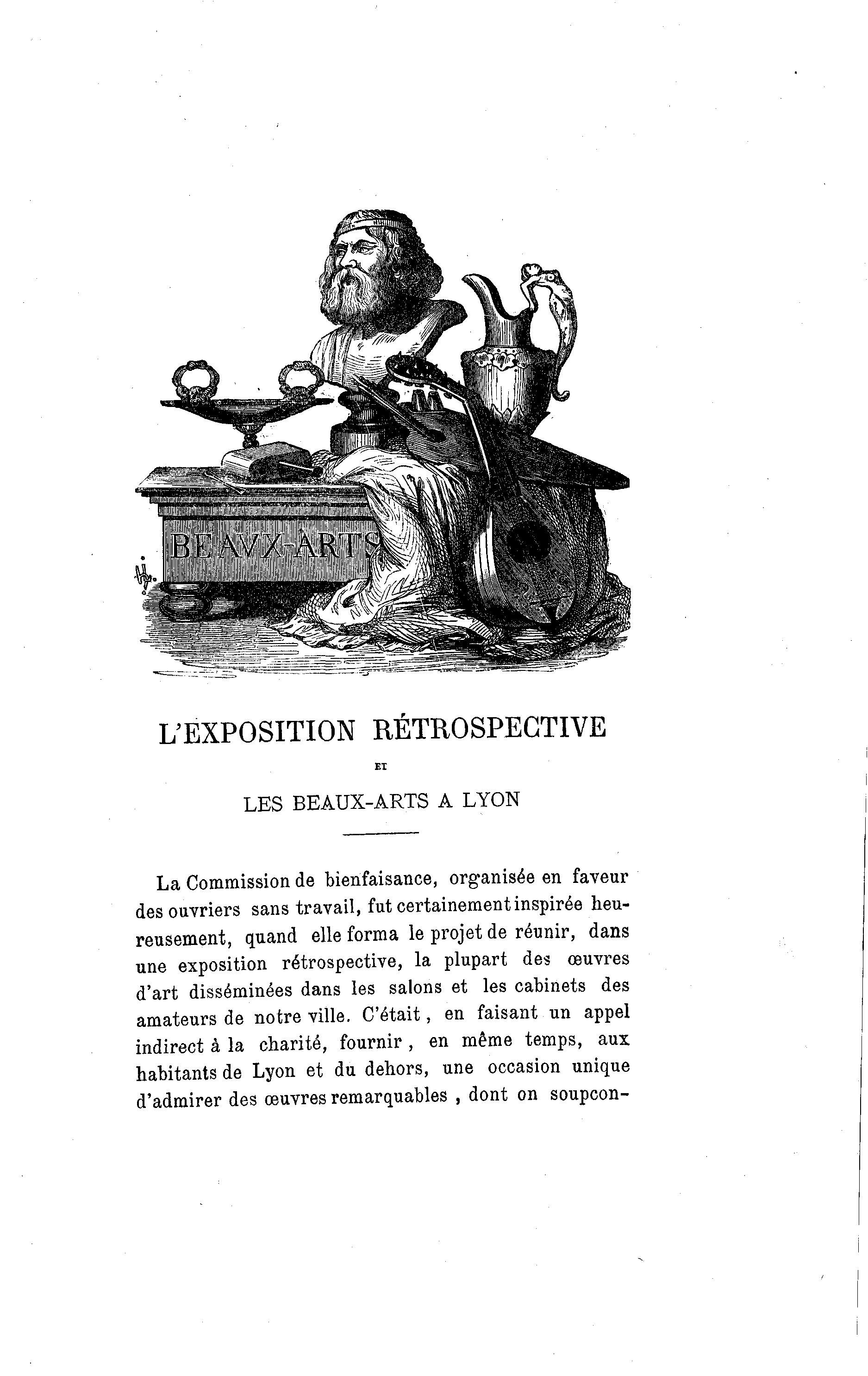 L'EXPOSITION RÉTROSPECTIVE El LES BEAUX-ARTS A LYON La Commission de bienfaisance, organisée en faveur des ouvriers sans travail, fut certainement inspirée heu- reusement, quand elle forma le projet de réunir, dans une exposition rétrospective, la plupart des œuvres d'art disséminées dans les salons et les cabinets des amateurs de notre ville. C'était, en faisant un appel indirect à la charité, fournir , en même temps, aux habitants de Lyon et du dehors, une occasion unique d'admirer des œuvres remarquables , dont on soupçon-