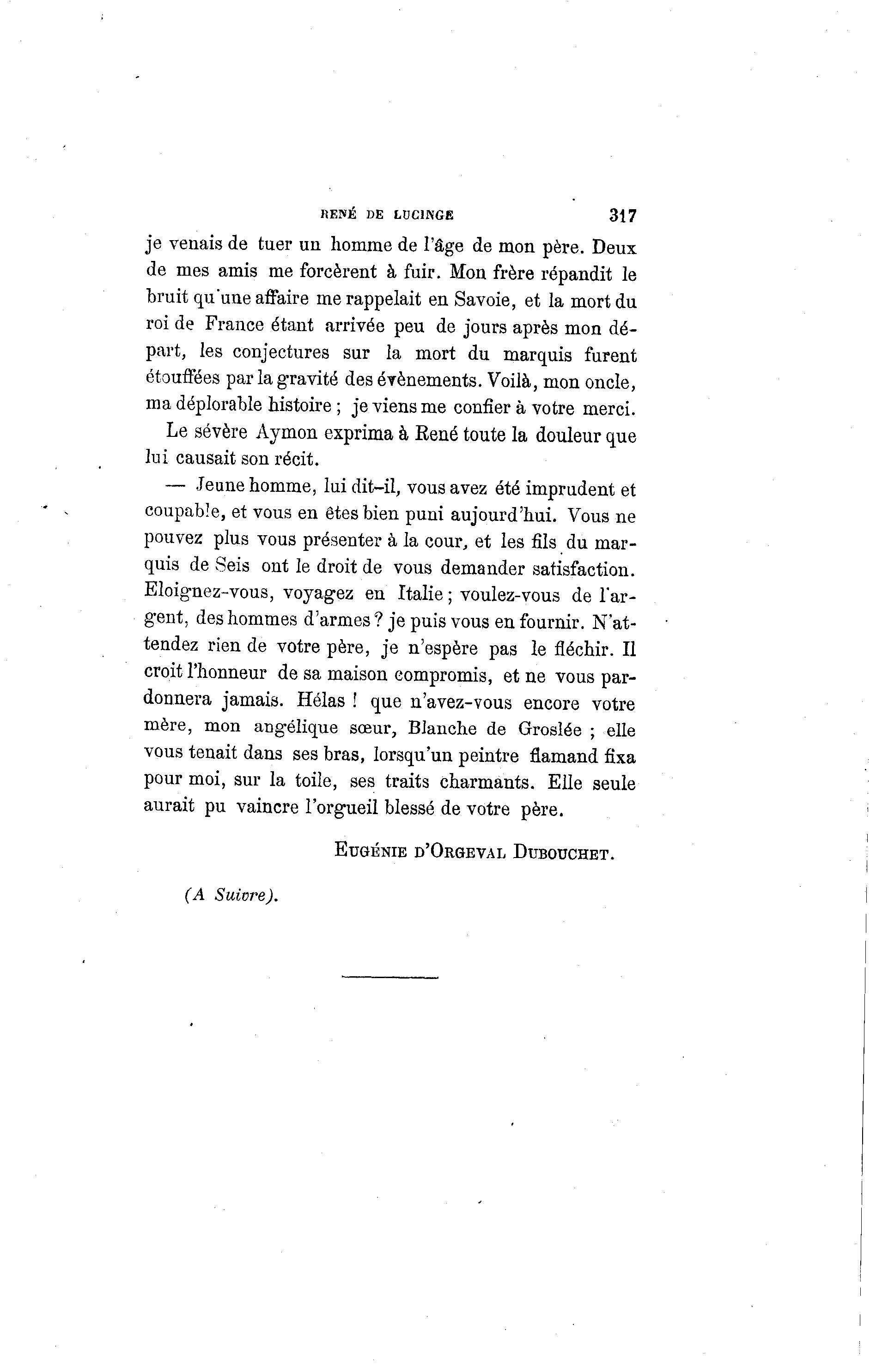 HEVÉ DE LDC1NGE 317 je venais de tuer un homme de l'âge de mon père. Deux de mes amis me forcèrent à fuir. Mon frère répandit le bruit qu'une affaire me rappelait en Savoie, et la mort du roi de France étant arrivée peu de jours après mon dé- part, les conjectures sur la mort du marquis furent étouffées par la gravité des événements. Voilà , mon oncle, ma déplorable histoire ; je viens me confier à votre merci. Le sévère Aymon exprima à René toute la douleur que lui causait son récit. — Jeune homme, lui dit-il, vous avez été imprudent et coupable, et vous en êtes bien puni aujourd'hui. Vous ne pouvez plus vous présenter à la cour, et les fils du mar- quis de Seis ont le droit de vous demander satisfaction. Eloignez-vous, voyagez en Italie ; voulez-vous de l'ar- gent, des hommes d'armes ? je puis vous en fournir. N'at- tendez rien de votre père, je n'espère pas le fléchir. Il croit l'honneur de sa maison compromis, et ne vous par- donnera jamais. Hélas ! que n'avez-vous encore votre mère, mon angélique sœur, Blanche de Groslée ; elle vous tenait dans ses bras, lorsqu'un peintre flamand fixa pour moi, sur la toile, ses traits charmants. Elle seule aurait pu vaincre l'orgueil blessé de votre père. EUGÉNIE D'ORGEVAL DUBOUCHET. (A Suivre).
