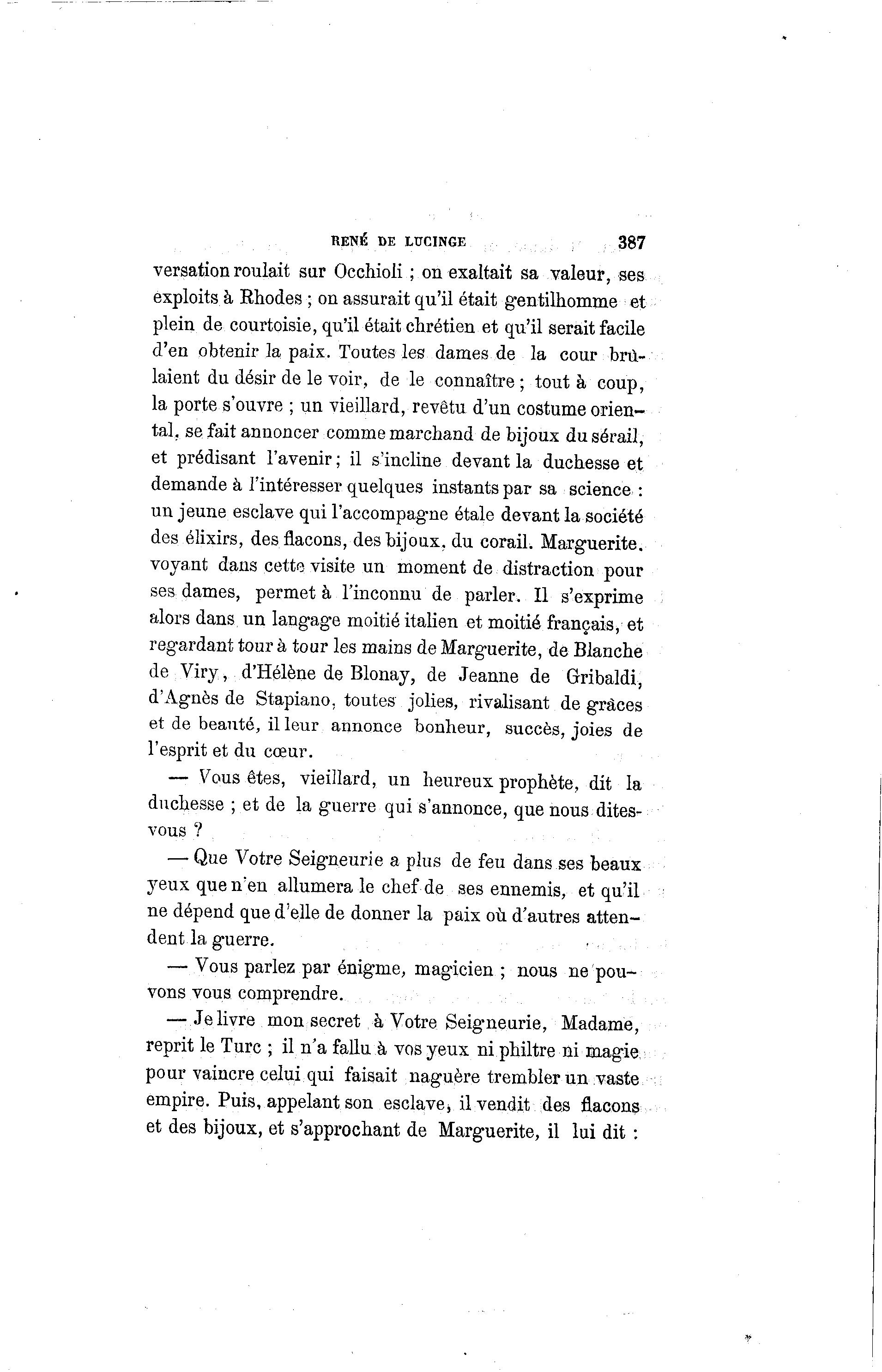 KENÉ DE LUCINGE 387 versation roulait sur Oechioli ; on exaltait sa valeur, ses exploits à Rhodes ; on assurait qu'il était gentilhomme et plein de courtoisie, qu'il était chrétien et qu'il serait facile d'en obtenir la paix. Toutes les dames de la cour brû- laient du désir de le voir, de le connaître; tout à coup, la porte s'ouvre ; un vieillard, revêtu d'un costume orien- tal, se fait annoncer comme marchand de bijoux du sérail, et prédisant l'avenir ; il s'incline devant la duchesse et demande à l'intéresser quelques instants par sa science : un jeune esclave qui l'accompagne étale devant la société des élixirs, des flacons, des bijoux, du corail. Marguerite. voyant dans cette visite un moment de distraction pour ses dames, permet à l'inconnu de parler. Il s'exprime alors dans un langage moitié italien et moitié français, et regardant tour à tour les mains de Marguerite, de Blanche de Viry, d'Hélène de Blonay, de Jeanne de Gribaldi, d'Agnès de Stapiano. toutes jolies, rivalisant de grâces et de beauté, il leur annonce bonheur, succès, joies de l'esprit et du cœur. — Vous êtes, vieillard, un heureux prophète, dit la duchesse ; et de la guerre qui s'annonce, que nous dites- vous ? . — Que Votre Seigneurie a plus de feu dans ses beaux yeux que n'en allumera le chef de ses ennemis, et qu'il ne dépend que d'elle de donner la paix où d'autres atten- dent la guerre. — Vous parlez par énigme, magicien ; nous ne pou- vons vous comprendre. — Je livre mon secret à Votre Seigneurie, Madame, reprit le Turc ; il n'a fallu à vos yeux ni philtre ni magie pour vaincre celui qui faisait naguère trembler un vaste empire. Puis, appelant son esclave, il vendit des flacons et des bijoux, et s'approchant de Marguerite, il lui dit :