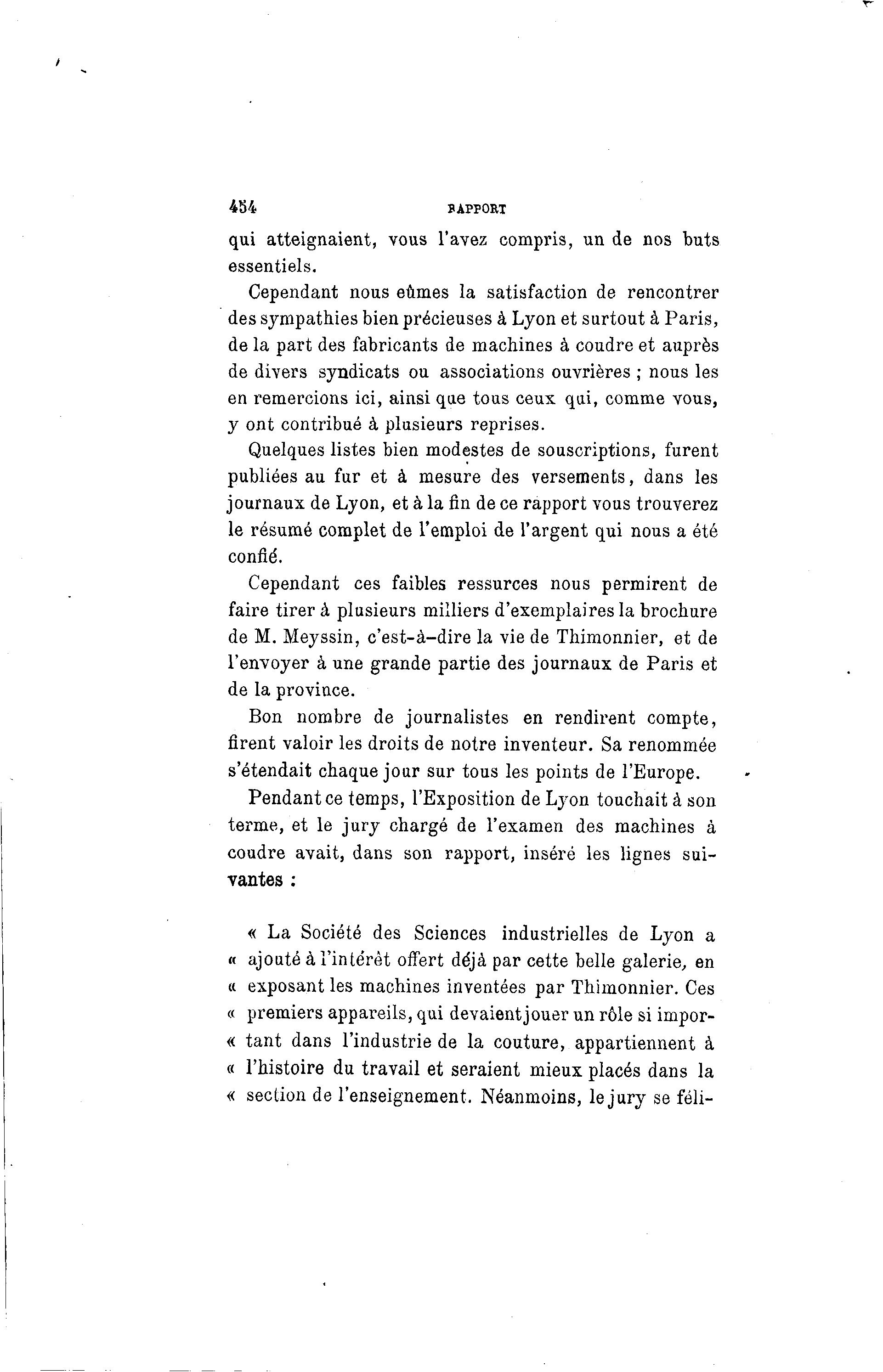 454 BAPPORT qui atteignaient, vous l'avez compris, un de nos buts essentiels. Cependant nous eûmes la satisfaction de rencontrer des sympathies bien précieuses à Lyon et surtout à Paris, de la part des fabricants de machines à coudre et auprès de divers syndicats ou associations ouvrières ; nous les en remercions ici, ainsi que tous ceux qui, comme vous, y ont contribué à plusieurs reprises. Quelques listes bien modestes de souscriptions, furent publiées au fur et à mesure des versements, dans les journaux de Lyon, et à la fin de ce rapport vous trouverez le résumé complet de l'emploi de l'argent qui nous a été confié. Cependant ces faibles ressurces nous permirent de faire tirer à plusieurs milliers d'exemplaires la brochure de M. Meyssin, c'est-à -dire la vie de Thimonnier, et de l'envoyer à une grande partie des journaux de Paris et de la province. Bon nombre de journalistes en rendirent compte, firent valoir les droits de notre inventeur. Sa renommée s'étendait chaque jour sur tous les points de l'Europe. Pendant ce temps, l'Exposition de Lyon touchait à son terme, et le jury chargé de l'examen des machines à coudre avait, dans son rapport, inséré les lignes sui- vantes : « La Société des Sciences industrielles de Lyon a « ajouté à l'intérêt offert déjà par cette belle galerie, en « exposant les machines inventées par Thimonnier. Ces « premiers appareils, qui devaient jouer un rôle si impor- « tant dans l'industrie de la couture, appartiennent à « l'histoire du travail et seraient mieux placés dans la « section de l'enseignement. Néanmoins, le jury se féli-