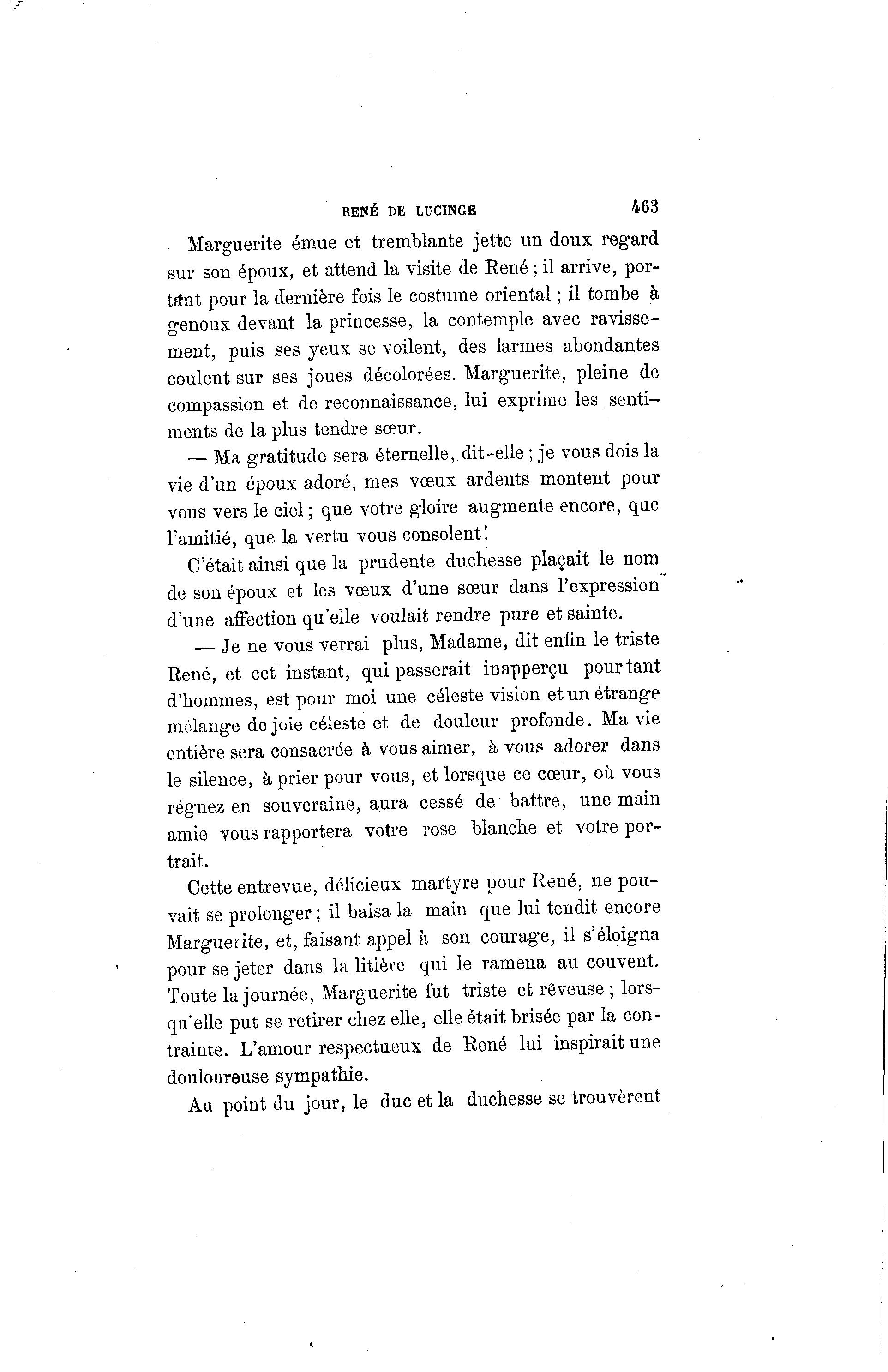 RENÉ DE LUCINGE 463 Marguerite émue et tremblante jette un doux regard sur son époux, et attend la visite de René ; il arrive, por- tant pour la dernière fois le costume oriental ; il tombe à genoux devant la princesse, la contemple avec ravisse- ment, puis ses yeux se voilent, des larmes abondantes coulent sur ses joues décolorées. Marguerite, pleine de compassion et de reconnaissance, lui exprime les senti- ments de la plus tendre sœur. — Ma gratitude sera éternelle, dit-elle ; je vous dois la vie d'un époux adoré, mes vœux ardents montent pour vous vers le ciel ; que votre gioire augmente encore, que l'amitié, que la vertu vous consolent! C'était ainsi que la prudente duchesse plaçait le nom de son époux et les vœux d'une sœur dans l'expression d'une affection qu'elle voulait rendre pure et sainte. — Je ne vous verrai plus, Madame, dit enfin le triste René, et cet instant, qui passerait inapperçu pourtant d'hommes, est pour moi une céleste vision et un étrange mélange de joie céleste et de douleur profonde. Ma vie entière sera consacrée à vous aimer, à vous adorer dans le silence, à prier pour vous, et lorsque ce cœur, où vous régnez en souveraine, aura cessé de battre, une main amie vous rapportera votre rose blanche et votre por- trait. Cette entrevue, délicieux martyre pour René, ne pou- vait se prolonger ; il baisa la main que lui tendit encore Marguerite, et, faisant appel à son courage, il s'éloigna pour se jeter dans la litière qui le ramena au couvent. Toute la journée, Marguerite fut triste et rêveuse ; lors- qu'elle put se retirer chez elle, elle était brisée par la con- trainte. L'amour respectueux de René lui inspirait une douloureuse sympathie. Au point du jour, le duc et la duchesse se trouvèrent