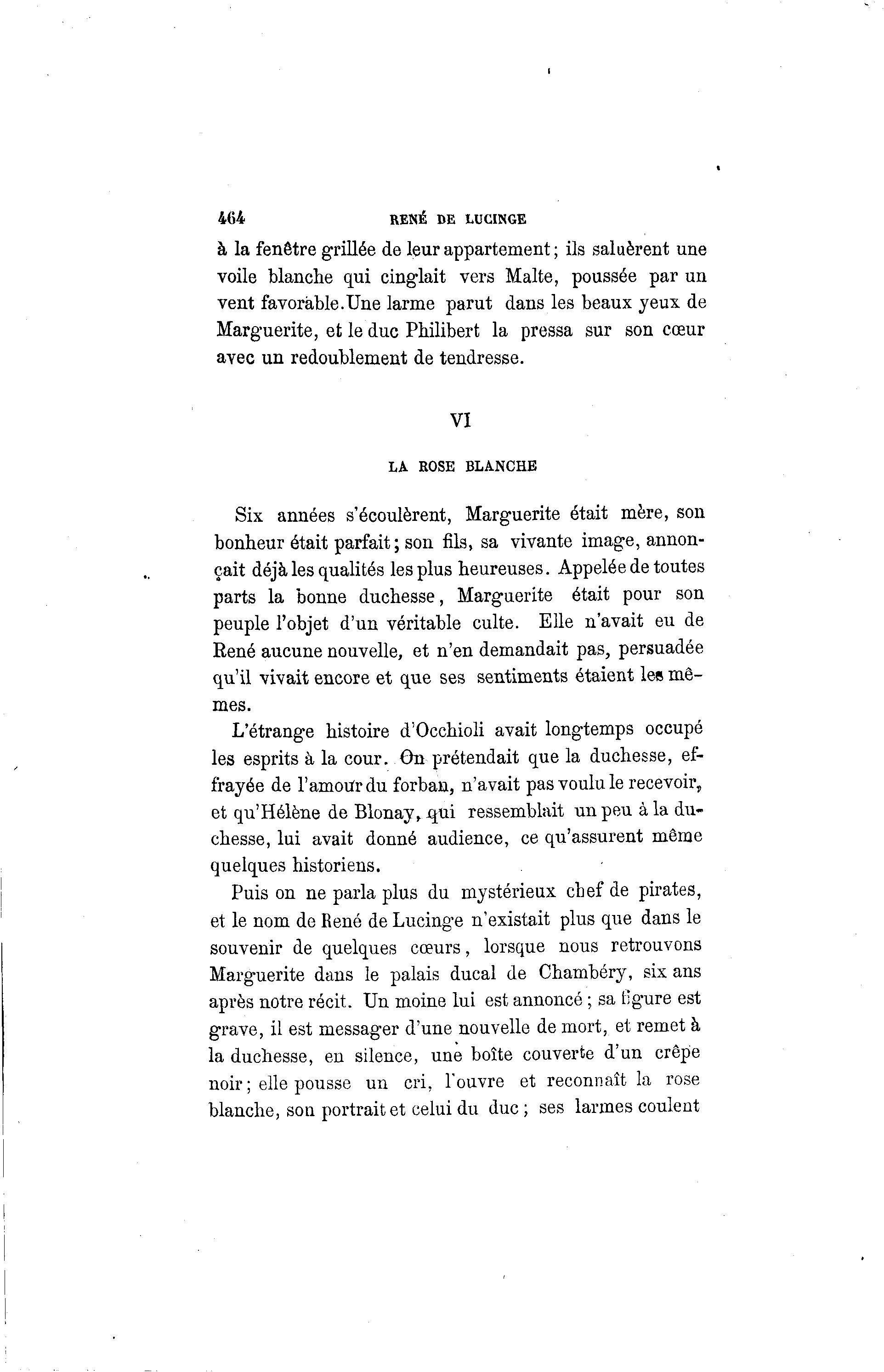 464 RENÉ DE LUGINGE à la fenêtre grillée de leur appartement ; ils saluèrent une voile blanche qui cinglait vers Malte, poussée par un vent favorable.Une larme parut dans les beaux yeux de Marguerite, et le duc Philibert la pressa sur son cœur avec un redoublement de tendresse. VI LA ROSE BLANCHE Six années s'écoulèrent, Marguerite était mère, son bonheur était parfait; son fils, sa vivante image, annon- çait déjà les qualités les plus heureuses. Appelée de toutes parts la bonne duchesse, Marguerite était pour son peuple l'objet d'un véritable culte. Elle n'avait eu de René aucune nouvelle, et n'en demandait pas, persuadée qu'il vivait encore et que ses sentiments étaient les mê- mes. L'étrange histoire d'Occhioli avait longtemps occupé les esprits à la cour. On prétendait que la duchesse, ef- frayée de l'amour du forban, n'avait pas voulu le recevoir, et qu'Hélène de Blonay, .qui ressemblait un peu à la du- chesse, lui avait donné audience, ce qu'assurent même quelques historiens. Puis on ne parla plus du mystérieux chef de pirates, et le nom de René de Lucinge n'existait plus que dans le souvenir de quelques cœurs, lorsque nous retrouvons Marguerite dans le palais ducal de Chambéry, six ans après notre récit. Un moine lui est annoncé ; sa figure est grave, il est messager d'une nouvelle de mort, et remet à la duchesse, en silence, une boîte couverte d'un crêpe noir ; elle pousse un cri, l'ouvre et reconnaît la rose blanche, son portrait et celui du duc ; ses larmes coulent