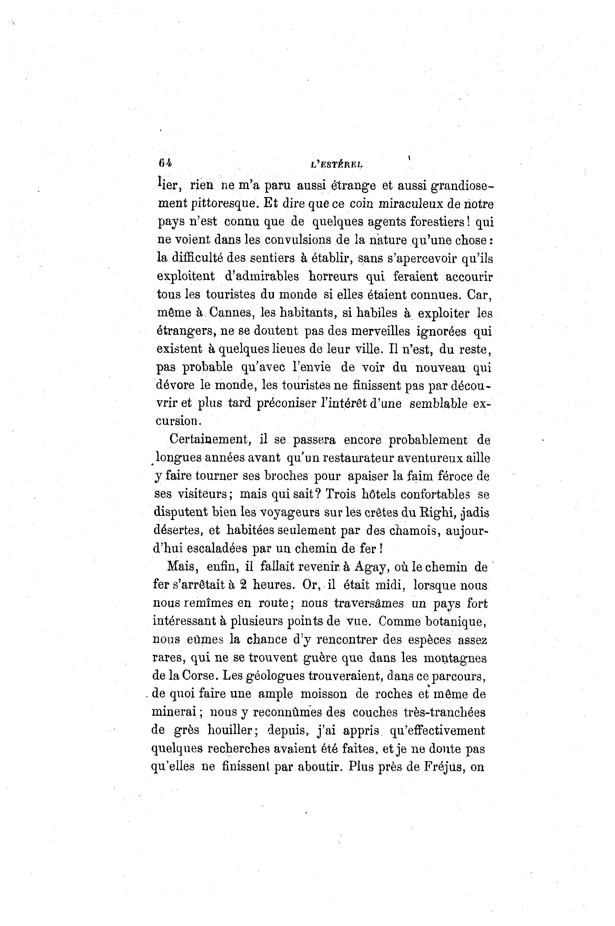 64 L'ESTEREL ^ier, rien ne m'a paru aussi étrange et aussi grandiose- ment pittoresque. Et dire que ce coin miraculeux de notre pays n'est connu que de quelques agents forestiers! qui ne voient dans les convulsions de la nature qu'une chose : la difficulté des sentiers à établir, sans s'apercevoir qu'ils exploitent d'admirables horreurs qui feraient accourir tous les touristes du monde si elles étaient connues. Car, même à Cannes, les habitants, si habiles à exploiter les étrangers, ne se doutent pas des merveilles ignorées qui existent à quelques lieues de leur ville. Il n'est, du reste, pas probable qu'avec l'envie de voir du nouveau qui dévore le monde, les touristes ne finissent pas par décou- vrir et plus tard préconiser l'intérêt d'une semblable ex- cursion. Certainement, il se passera encore probablement de longues années avant qu'un restaurateur aventureux aille y faire tourner ses broches pour apaiser la faim féroce de ses visiteurs; mais qui sait? Trois hôtels confortables se disputent bien les voyageurs sur les crêtes du Righi, jadis désertes, et habitées seulement par des chamois, aujour- d'hui escaladées par un chemin de fer ! Mais, enfin, il fallait revenir, à Agay, où le chemin de fer s'arrêtait à 2 heures. Or, il était midi, lorsque nous nous remîmes en route ; nous traversâmes un pays fort intéressant à plusieurs points de vue. Comme botanique, nous eûmes la chance d'y rencontrer des espèces assez rares, qui ne se trouvent guère que dans les montagnes de la Corse. Les géologues trouveraient, dans ce parcours, de quoi faire une ample moisson de roches et même de minerai ; nous y reconnûmes des couches très-tranchées de grès houiller; depuis, j'ai appris qu'effectivement quelques recherches avaient été faites, et je ne doute pas qu'elles ne finissent par aboutir. Plus près de Fréjus, on