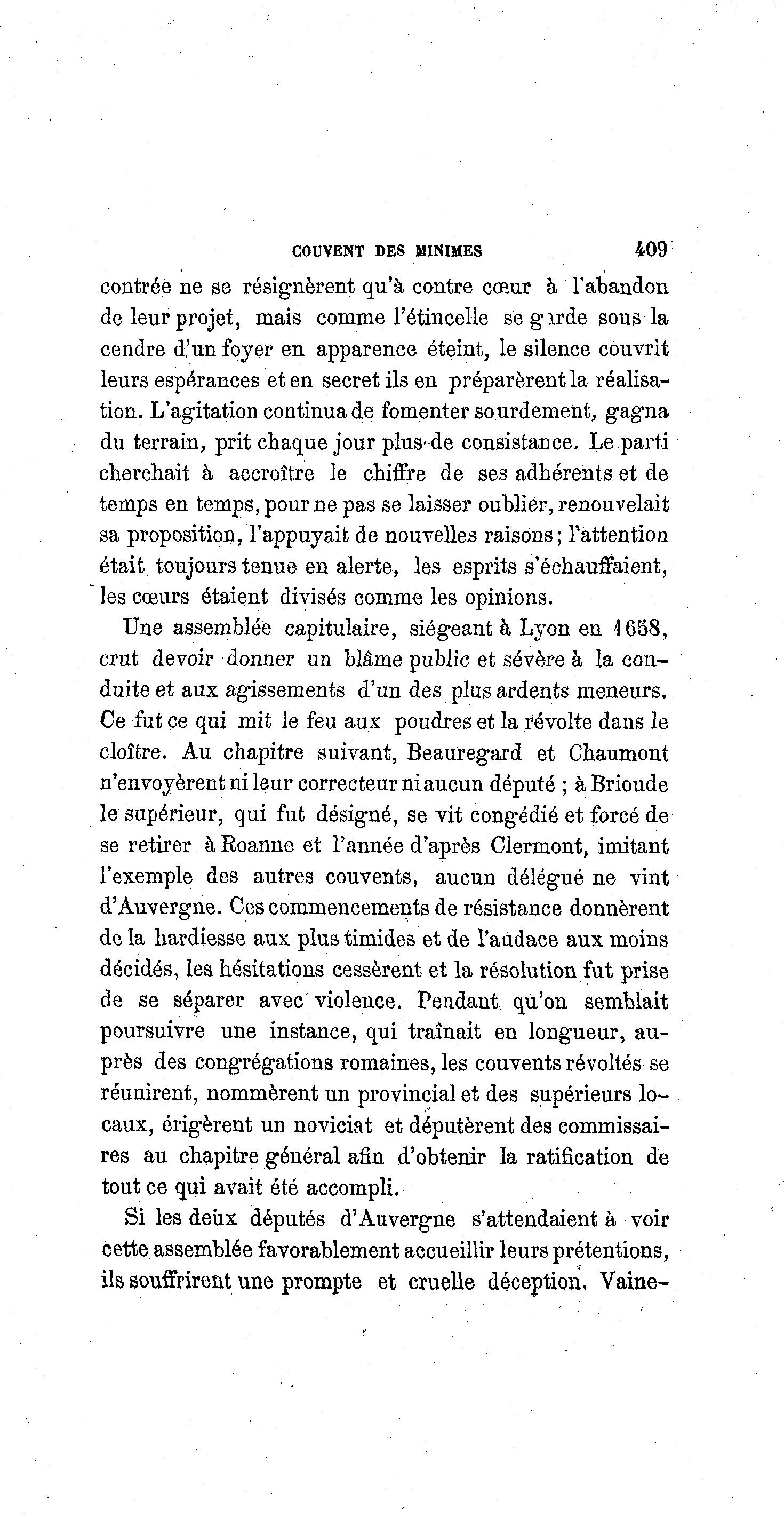 COUVENT DES MINIMES 409 contrée ne se résignèrent qu'à contre cœur à l'abandon de leur projet, mais comme l'étincelle se g irde sous la cendre d'un foyer en apparence éteint, le silence couvrit leurs espérances et en secret ils en préparèrent la réalisa- tion. L'agitation continua de fomenter sourdement, gagna du terrain, prit chaque jour plus' de consistance. Le parti cherchait à accroître le chiffre de ses adhérents et de temps en temps, pour ne pas se laisser oublier, renouvelait sa proposition, l'appuyait de nouvelles raisons; l'attention était toujours tenue en alerte, les esprits s'échauffaient, les cœurs étaient divisés comme les opinions. Une assemblée capitulaire, siégeante Lyon en 1658, crut devoir donner un blâme public et sévère à la con- duite et aux agissements d'un des plus ardents meneurs. Ce fut ce qui mit le feu aux poudres et la révolte dans le cloître. Au chapitre suivant, Beauregard et Chaumont n'envoyèrent ni leur correcteur ni aucun député ; à Brioude le supérieur, qui fut désigné, se vit congédié et forcé de se retirer à Roanne et l'année d'après Clermont, imitant l'exemple des autres couvents, aucun délégué ne vint d'Auvergne. Ces commencements de résistance donnèrent de la hardiesse aux plus timides et de l'audace aux moins décidés, les hésitations cessèrent et la résolution fut prise de se séparer avec violence. Pendant qu'on semblait poursuivre une instance, qui traînait en longueur, au- près des congrégations romaines, les couvents révoltés se réunirent, nommèrent un provincial et des supérieurs lo- caux, érigèrent un noviciat et députèrent des commissai- res au chapitre général afin d'obtenir la ratification de tout ce qui avait été accompli. Si les deux députés d'Auvergne s'attendaient à voir cette assemblée favorablement accueillir leurs prétentions, ils souffrirent une prompte et cruelle déception. Vaine-