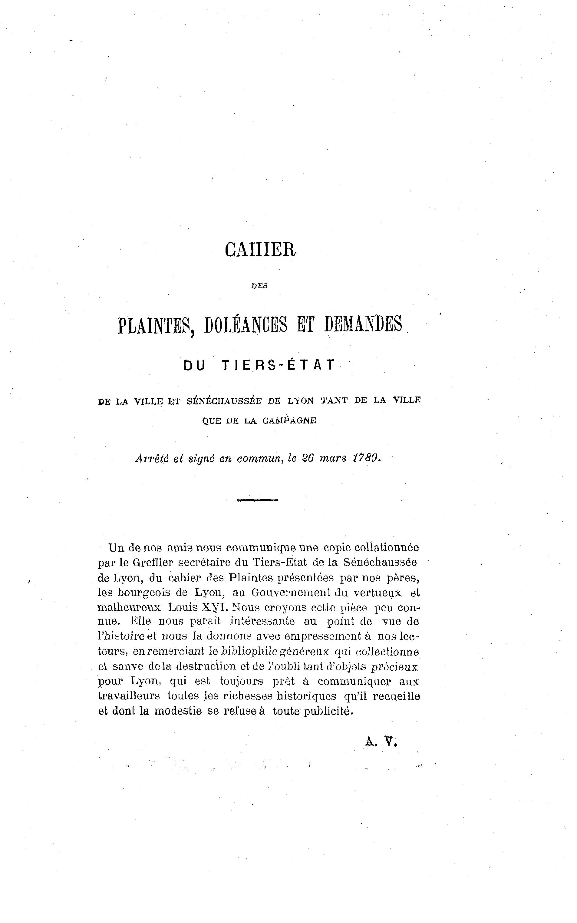 de Lyon, du cahier des Plaintes présentées par nos pères,