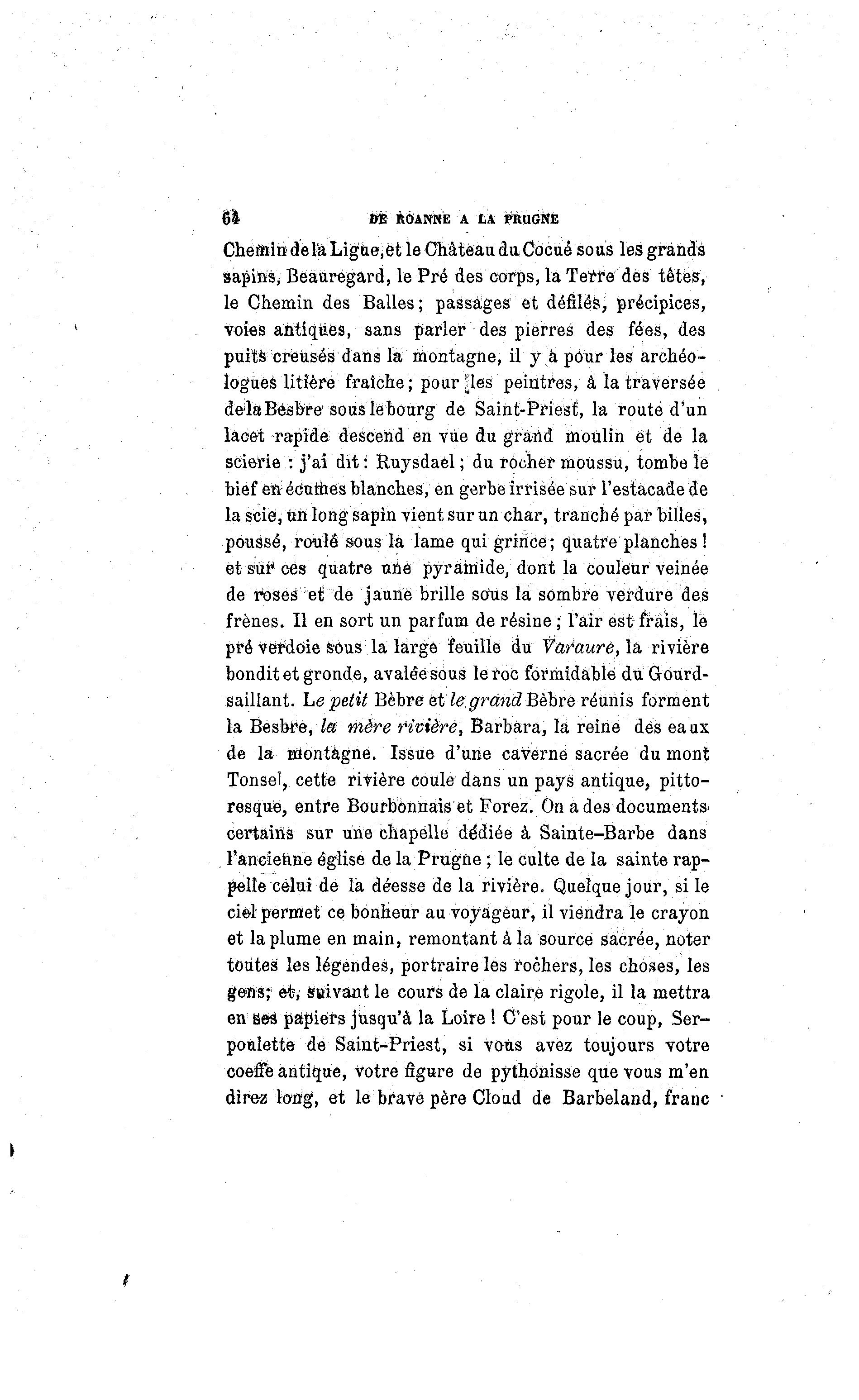 61 Sii ROANNE A LA PRU6NE Chemin dé là Ligue, et le Château du Cocué sous les grands sapins, Beauregard, le Pré des corps, la Terre des têtes, le Chemin des Balles; passages et défilés, précipices, voies antiques, sans parler des pierres des fées, des puits creusés dans là montagne, il y à pour les archéo- logues litière fraîche; pour pes peintres, à la traversée delaBésbre sous le bourg de Saint-Priest, la route d'un laoet rapide descend en vue du grand moulin et de la scierie : j'ai dit : Ruysdael ; du rocher moussu, tombe le bief en éduîhes blanches, en gerbe irrisée sur l'estacade de la scie, tth long sapin vient sur un char, tranché par billes, poussé, roulé sous la lame qui grince; quatre planches ! et s'ùï* ces quatre une pyramide, dont la couleur veinée de roses et de jaune brille sous la sombre verdure des frênes. Il en sort un parfum de résine ; l'air est frais, le pré verdoie sous la large feuille du Varauré, la rivière bondit et gronde, avalée sous le roc formidable du Gourd- saillant. Le petit Bèbre et le grand Bèbre réunis forment te Besbi"e, la mère rivière, Barbara, la reine dés eaux de la montagne. Issue d'une caverne sacrée du mont Tonsel, cette rivière coule dans un pays antique, pitto- resque, entre Bourbonnais et Forez. On a des documents* certains sur une chapelle dédiée à Sainte-Barbe dans l'ancienne église de la Prugne ; le culte de la sainte rap- pelle celui de la déesse de la rivière. Quelque jour, si le ciel permet ce bonheur au voyageur, il viendra le crayon et la plume en main, remontant à la source sacrée, noter toutes les légendes, portraire les rochers, les choses, les gens; ek; Suivant le cours de la claire rigole, il la mettra en setë papiers jusqu'à la Loire ! C'est pour le coup, Ser- poulette de Saint-Priest, si vous avez toujours votre coeffe antique, votre âgure de pythonisse que vous m'en direz long, et le brave père Cloud de Barbeland, franc