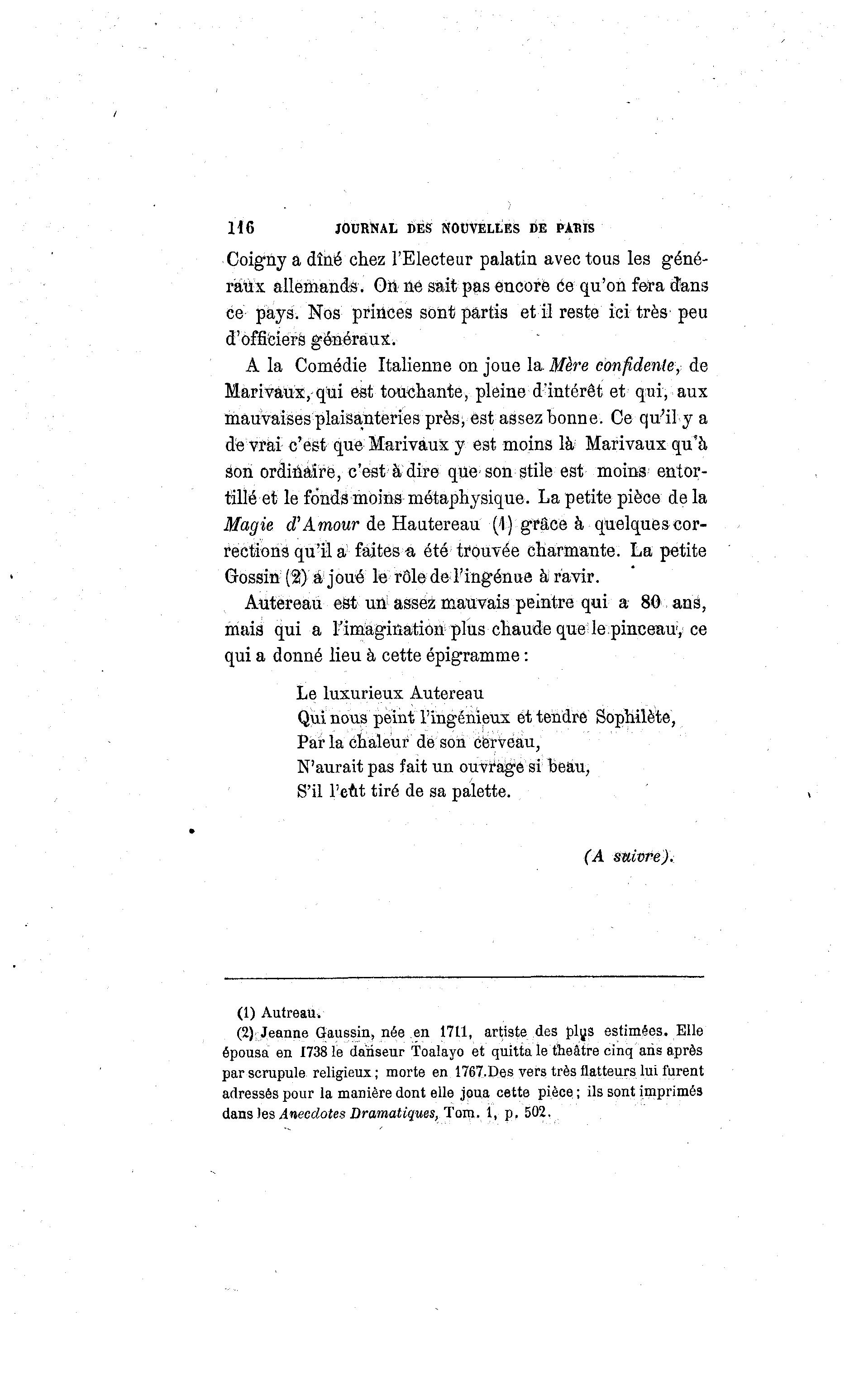 (2) Jeanne Gaussin, née en 1711, artiste des plus estimées. Elle