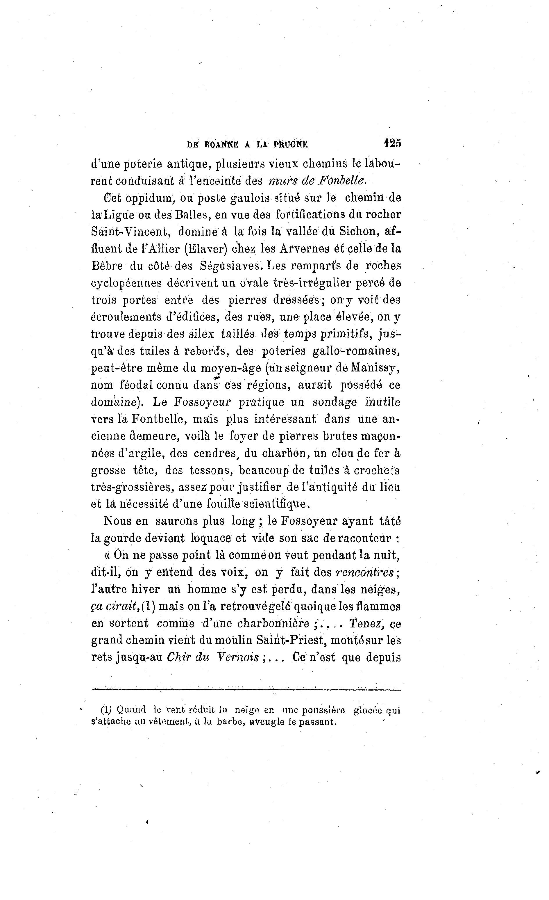 BË ROANNE A LA. PftUGNE 125 d'une poterie antique, plusieurs vieux chemins le labou- rent conduisant à l'enceinte des murs de Fonbélle. Cet oppidum, ou poste gaulois situé sur le chemin de laLigue ou des Balles, en vue des fortifications du rocher Saint-Vincent, domine à la fois la vallée du Sichon, af- fluent de l'Allier (Elaver) chez les Arvernes et celle dé la Bêbre du côté des Ségusiaves. Les remparts de roches cyclopéennes décrivent un ovale très-irrégulier percé de trois portes entre des pierres dressées ; ony voit des écroulements d'édifices, des rues, une place élevée, ony trouve depuis des silex taillés des: temps primitifs, jus- qu'à des tuiles à rebords, des poteries gallo-romaines, peut-être même du moyen-âge (un seigneur de Manissy, nom féodal connu dans ces régions, aurait possédé ce domaine). Le Fossoyeur pratique un sondage inutile vers la Fontbelle, mais plus intéressant dans une' an- cienne demeure, voila le foyer de pierres brutes maçon- nées d'argile, des cendres, du charbon, un clou de fer à grosse tête, dés tessons, beaucoup de tuiles à crochets très-grossières, assez pour justifier de l'antiquité du lieu et la nécessité d'une fouille scientifique. Nous en saurons plus long ; le Fossoyeur ayant tâté la gourde devient loquace et vide son sac de raconteur : « On ne passe point là comme on veut pendant la nuit, dit-il, on y entend des voix, on y fait des rencontres ; l'autre hiver un homme s'y est perdu, dans les neiges, ça cirait, (1) mais on l'a retrouvé gelé quoique les flammes en sortent comme d'une charbonnière ; ' . . . . Tenez, ce grand chemin vient du moulin Saiht-Priest, monté sur les rets jusqu-au Chir du Vemois;.., Ce n'est que depuis (1) Quand le vent réduit la neige en une poussière glacée qui s'attache au vêtement, à la barbe, aveugle le passant.