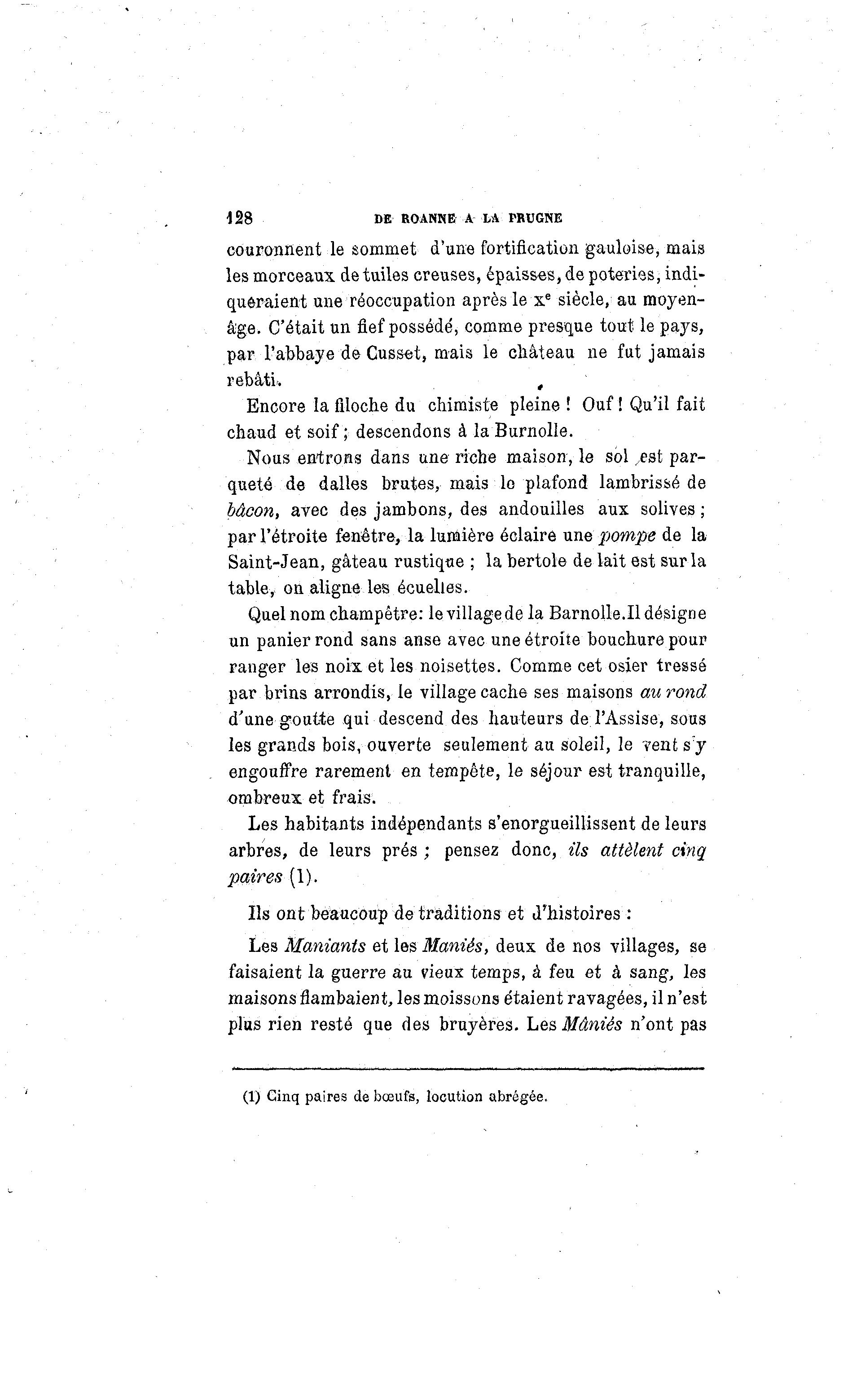 128 DE ROANNE A LA PRUGNE couronnent le sommet d'une fortification gauloise, mais les morceaux de tuiles creuses, épaisses, de poteries, indi- queraient une réoccupation après le Xe siècle, au moyen- âge. C'était un fief possédé, comme presque tout le pays, par l'abbaye de Cusset, mais le château ne fut jamais rebâti. , Encore la filoche du chimiste pleine ! Ouf ! Qu'il fait chaud et soif ; descendons à la Burnolle. Nous entrons dans une riche maison, le sol .est par- queté de dalles brutes, mais le plafond lambrissé de bacon, avec des jambons, des andouilles aux solives ; par l'étroite fenêtre, la lumière éclaire une p>ompe de la Saint-Jean, gâteau rustique ; la bertole de lait est sur la table, on aligne les écuelles. Quel nom champêtre: levillagede la Barnolle.Il désigne un panier rond sans anse avec une étroite bouchure pour ranger les noix et les noisettes. Comme cet osier tressé par brins arrondis, le village cache ses maisons au rond d'une goutte qui descend des hauteurs de l'Assise, sous les grands bois, ouverte seulement au soleil, le vent s:y engouffre rarement en tempête, le séjour est tranquille, ombreux et frais. Les habitants indépendants s'enorgueillissent de leurs arbres, de leurs prés ; pensez donc, ils attèlent cinq paires (1). Ils ont beaucoup de traditions et d'histoires : Les Maniants et les Maniés, deux de nos villages, se faisaient la guerre au vieux temps, à feu et à sang, les maisons flambaient, les moissons étaient ravagées, il n'est plus rien resté que des bruyères. Les Maniés n'ont pas (1) Cinq paires de bœufs, locution abrégée.