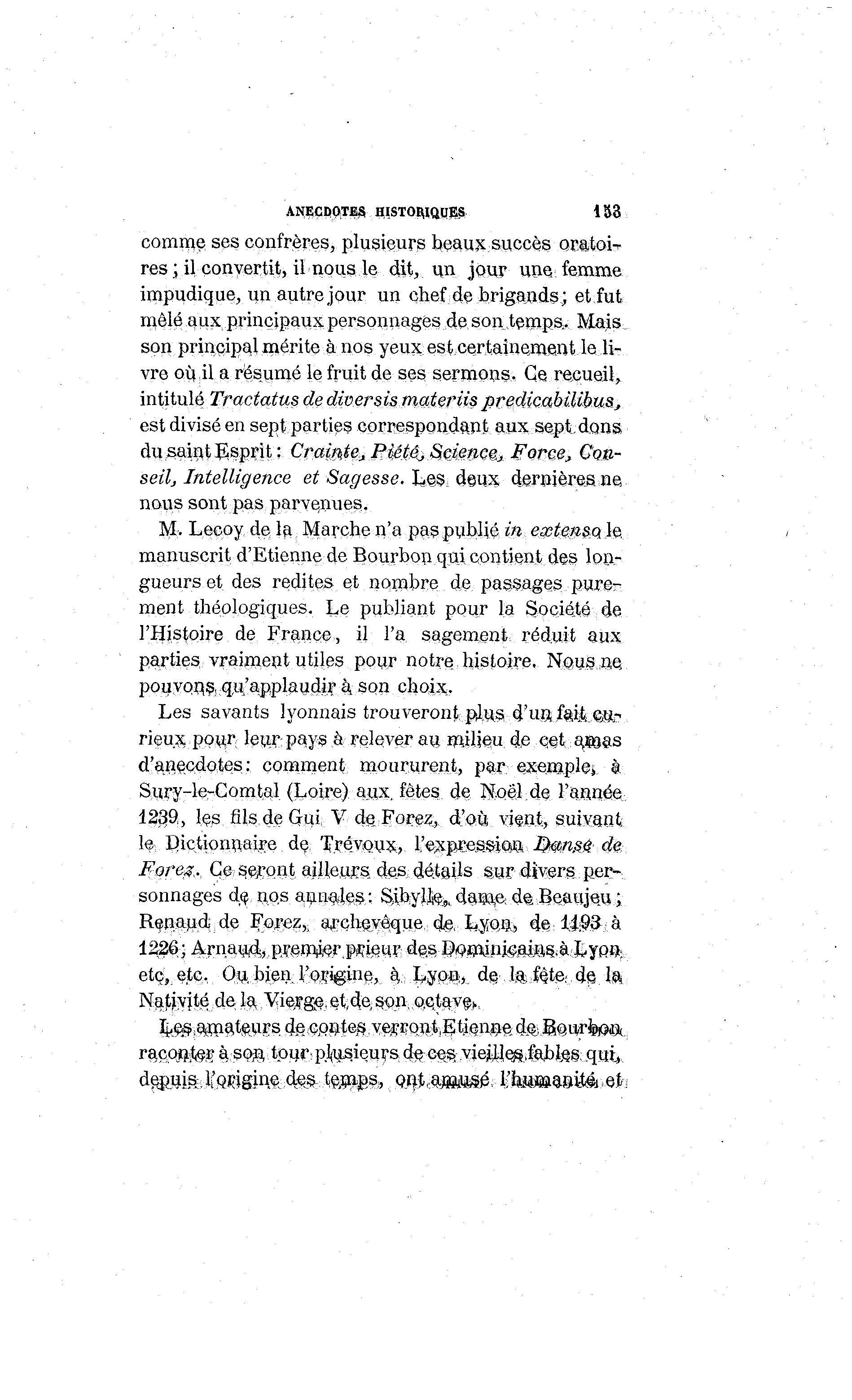 ANÇCDlQTES HISTOMQCSSi 153 comme ses confrères, plusieurs beaux succès oratoi- res ; il convertit, il nous le dit, un jour une. femme impudique, un autre jour un chef de brigands; et fut mêlé aux principaux personnages de son temps,. Majs. son principal mérite à nos yeux est certainement le li- vre où il a résumé le fruit de ses sermons. Ge recueil, intitulé Tractatus de diversis m&teriis ptedicabiMbus, est divisé en sept parties correspondant aux sept; dons, dusaiiitesprit: Cramte,PiétâjScience^ Force, Con- seilj Intelligence et Sagesse. L m deux dernières ne nous sont pas parvenues. M. Lecoy de la Marche ii'a paspuhUé in, esstenmh, manuscrit d'Etienne de Bourbon qtti contient des lon- gueurs et des redites et nombre de passages purer ment théologiques. Le publiant pour la Société de l'Histoire de France, il l'a sagement réduit aux parties vraiment utiles pour notre histoire. Nûui^nç pouvons, (ju'applaudir k son choix. Les savants lyonnais trouveront plus d'ua feii ©gr- rieu.x pour; leur: pays ô relever au milieu de cetaïoas d'anecdotes: comment moururent, par exempig^ 4 Sury-le-Comtal (Loire) aux, fêtes de Noël de l'année 12.^9, les fils de G-ui V de Forez, d'où vient, suivant le dictionnaire de Trévoux, l/e^pr^ssion. H}®n.sfr de, Fore$,.., Ce seront ailleurs des détails sur divers per- sonnages de nos annules; SÀbylfc,, dam,e: d© Beaujeu; Renaud-de Forez,, archevêque d#, LyoA, de: li§3 À 1226 ; Arnawi> fmwhFMiÇM d§§ PiQ^ni^aim^ià LyfiB; etç, etc. Qu; bien l'origine, à , Lypni, de; lalêj,e; ds Ift Najtjylté de la ."Vfreigft et,dÀ s^n, Qqtavfe, ^e^mate-MS. deçpnte§ ve;rrQ#1Etjen.j9e;dg;S©urfeiO©( racopter à ;SO$ tour: plusieurs d^ce^viejMe&fabfôiS: qui, de^uiSiltQrigine4f^ t^BipS;, Qnt,,a»ujSjé. l'jtiM»a®ité.eti