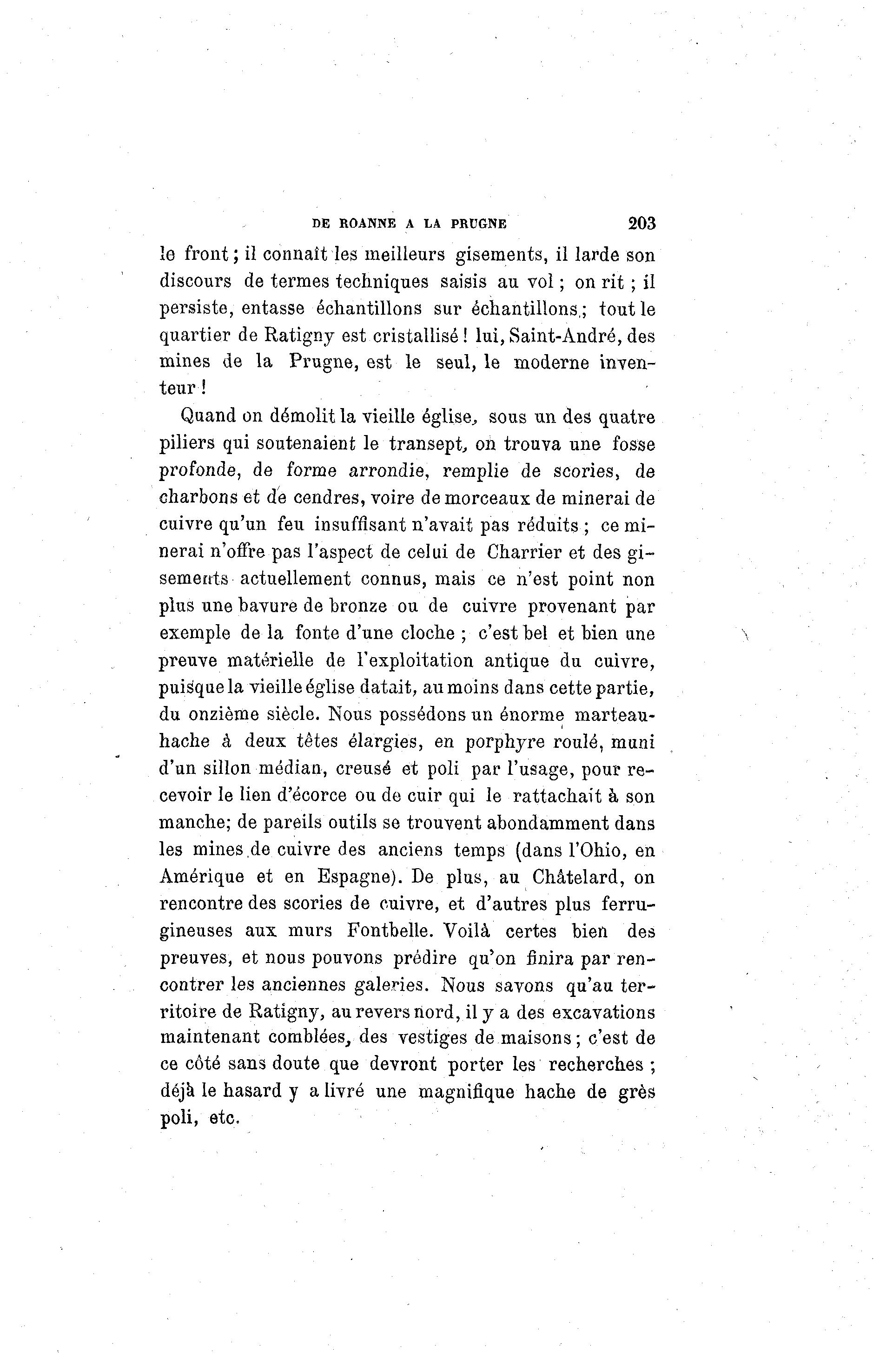 DE ROANNE A LA PRUGNE 203 le front; il connaît les meilleurs gisements, il larde son discours de termes techniques saisis au vol ; on rit ; il persiste, entasse échantillons sur échantillons,; tout le quartier de Ratigny est cristallisé ! lui, Saint-André, des mines de la Prugne, est le seul, le moderne inven- teur ! Quand on démolit la vieille église, sous un des quatre piliers qui soutenaient le transept, on trouva une fosse profonde, de forme arrondie, remplie de scories, de charbons et de cendres, voire de morceaux de minerai de cuivre qu'un feu insuffisant n'avait pas réduits ; ce mi- nerai n'offre pas l'aspect de celui de Charrier et des gi- sements actuellement connus, mais ce n'est point non plus une bavure de hronze ou de cuivre provenant par exemple de la fonte d'une cloche ; c'est bel et bien une preuve matérielle de l'exploitation antique du cuivre, puisque la vieille église datait, au moins dans cette partie, du onzième siècle. Nous possédons un énorme marteau- hache à deux têtes élargies, en porphyre roulé, muni d'un sillon médian, creusé et poli par l'usage, pour re- cevoir le lien d'écorce ou de cuir qui le rattachait à son manche; de pareils outils se trouvent abondamment dans les mines.de cuivre des anciens temps (dans l'Ohio, en Amérique et en Espagne). De plus, au Châtelard, on rencontre des scories de cuivre, et d'autres plus ferru- gineuses aux murs Fontbelle. Voilà certes bien des preuves, et nous pouvons prédire qu'on finira par ren- contrer les anciennes galeries. Nous savons qu'au ter- ritoire de Ratigny, au revers nord, il y a des excavations maintenant comblées, des vestiges de maisons; c'est de ce côté sans doute que devront porter les recherches ; déjà le hasard y a livré une magnifique hache de grès poli, etc.