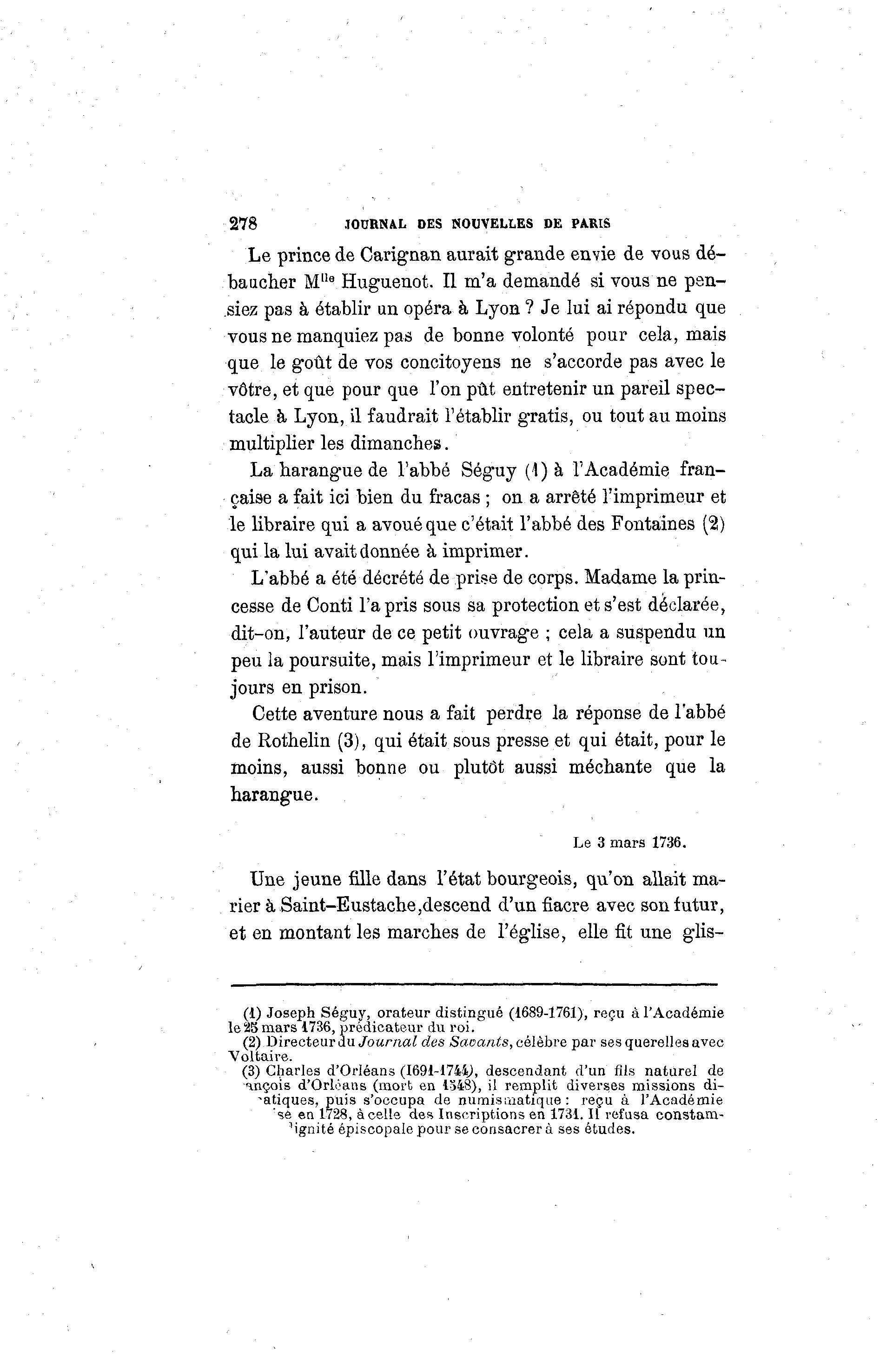 278 JOURNAL DES NOUVELLES DE PARIS Le prince de Carignan aurait grande envie de vous dé- baucher M"e Huguenot. Il m'a demandé si vous ne pen- siez pas à établir un opéra à Lyon ? Je lui ai répondu que vous ne manquiez pas de bonne volonté pour cela, mais que le goût de vos concitoyens ne s'accorde pas avec le vôtre, et que pour que l'on pût entretenir un pareil spec- tacle à Lyon, il faudrait l'établir gratis, ou tout au moins multiplier les dimanches. La harangue de l'abbé Séguy (