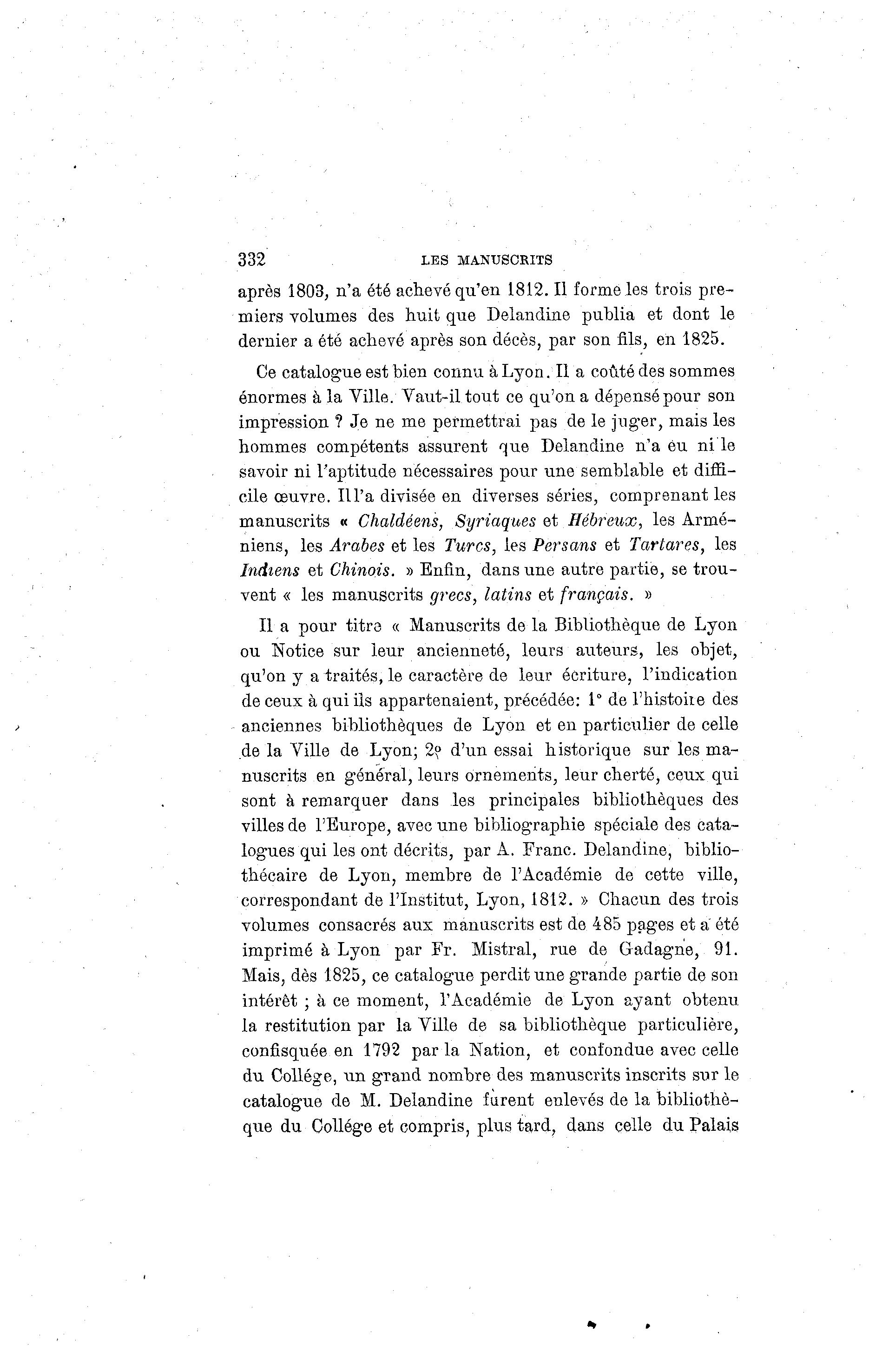 332 LES MANUSCRITS après 1803, n'a été achevé qu'en 1812. Il forme les trois pre- miers volumes des huit que Delandine publia et dont le dernier a été achevé après son décès, par son fils, en 1825. Ce catalogue est bien connu à Lyon. Il a coûté des sommes énormes à la Ville. Vaut-il tout ce qu'on a dépensé pour son impression ? Je ne me permettrai pas de le juger, mais les hommes compétents assurent que Delandine n'a eu ni le savoir ni l'aptitude nécessaires pour une semblable et diffi- cile œuvre. Ill'a divisée en diverses séries, comprenant les manuscrits « Chaldéens, Syriaques et Hébreux, les Armé- niens, les Arabes et les Turcs, les Persans et Tartares, les Indiens et Chinois. » Enfin, dans une autre partie, se trou- vent « les manuscrits grecs, latins et français. » Il a pour titre « Manuscrits de la Bibliothèque de Lyon ou Notice sur leur ancienneté, leurs auteurs, les objet, qu'on y a traités, le caractère de leur écriture, l'indication de ceux à qui ils appartenaient, précédée: 1° de l'histoire des anciennes bibliothèques de Lyon et en particulier de celle de la Ville de Lyon; 2? d'un essai historique sur les ma- nuscrits en général, leurs ornements, leur cherté, ceux qui sont à remarquer dans les principales bibliothèques des villes de l'Europe, avec une bibliographie spéciale des cata- logues qui les ont décrits, par Â. Franc. Delandine, biblio- thécaire de Lyon, membre de l'Académie de cette ville, correspondant de l'Institut, Lyon, 1812. » Chacun des trois volumes consacrés aux manuscrits est de 485 pages et a été imprimé à Lyon par Fr. Mistral, rue de Gadagne, 91. Mais, dès 1825, ce catalogue perdit une grande partie de son intérêt ; à ce moment, l'Académie de Lyon ayant obtenu la restitution par la Ville de sa bibliothèque particulière, confisquée en 1792 par la Nation, et confondue avec celle du Collège, un grand nombre des manuscrits inscrits sur le catalogue de M. Delandine furent enlevés de la bibliothè- que du Collège et compris, plus tard, dans celle du Palais