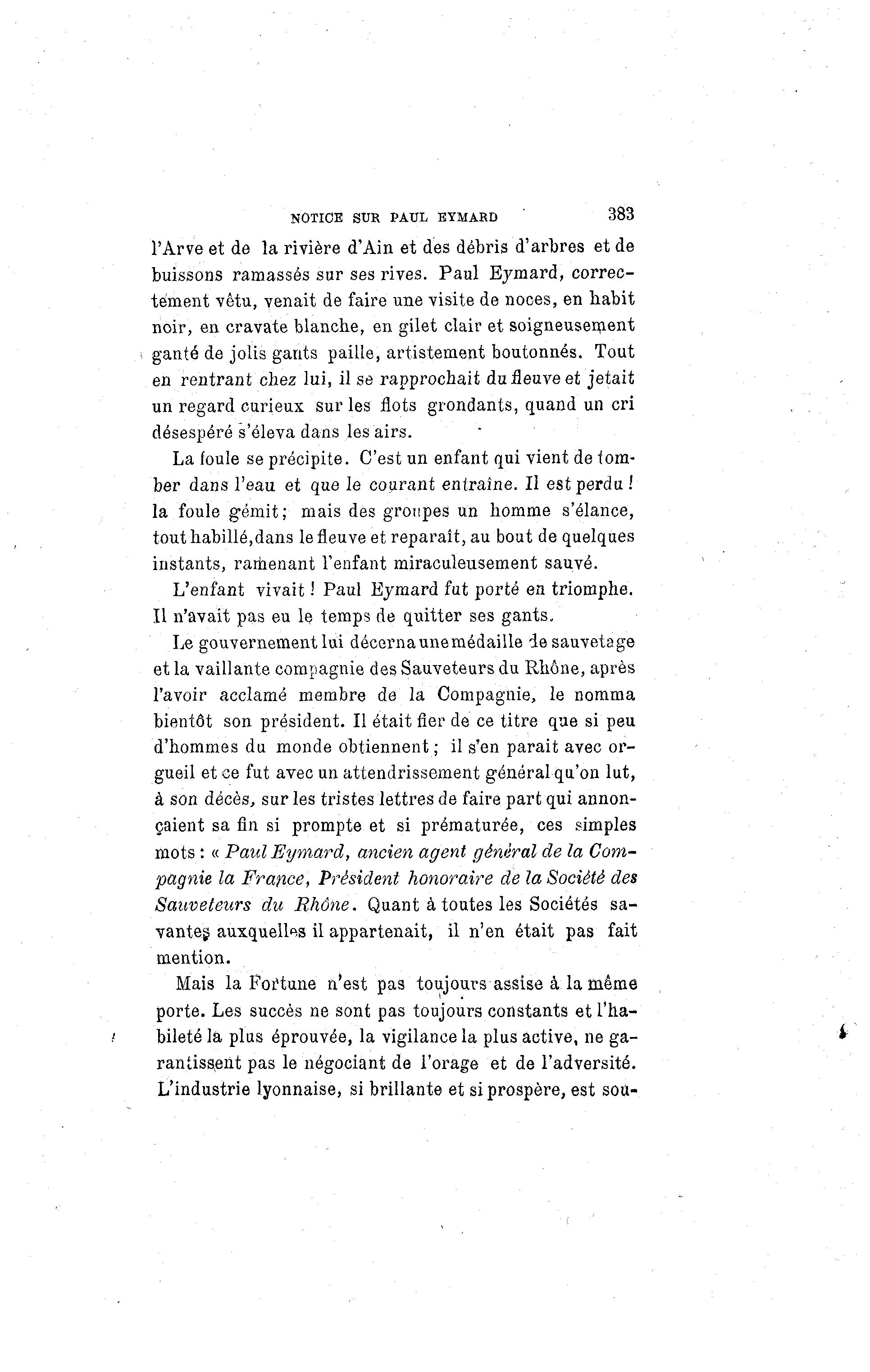 NOTICE SUR PAUL EYMARD 383 l'Arve et de la rivière d'Ain et des débris d'arbres et de buissons ramassés sur ses rives. Paul Eymard, correc- tement vêtu, venait de faire une visite de noces, en habit noir, en cravate blanche, en gilet clair et soigneusement ganté de jolis gants paille, artistement boutonnés. Tout en rentrant chez lui, il se rapprochait du fleuve et jetait un regard curieux sur les flots grondants, quand un cri désespéré s'éleva dans les airs. La foule se précipite. C'est un enfant qui vient de tom- ber dans l'eau et que le courant entraîne. Il est perdu.' la foule gémit; mais des groupes un homme s'élance, tout habillé,dans lefleuveet reparaît, au bout de quelques instants, ramenant l'enfant miraculeusement sauvé. L'enfant vivait ! Paul Eymard fut porté en triomphe. Il n'avait pas eu le. temps de quitter ses gants. Le gouvernement lai décernaunemédaille de sauvetage et la vaillante compagnie des Sauveteurs du Rhône, après l'avoir acclamé membre de la Compagnie, le nomma bientôt son président. Il était fier de ce titre que si peu d'hommes du monde obtiennent ; il s'en parait avec or- gueil et ce fut avec un attendrissement général qu'on lut, à son décès, sur les tristes lettres de faire part qui annon- çaient sa fin si prompte et si prématurée, ces simples mots : « Paul Eymard, ancien agent général de la Com- pagnie la France, Président honoraire de la Société des Sauveteurs du Rhône. Quant à toutes les Sociétés sa- vantes, auxquelles il appartenait, il n'en était pas fait mention. Mais la Fortune n'est pas toujours assise à la même porte. Les succès ne sont pas toujours constants et l'ha- bileté la plus éprouvée, la vigilance la plus active, ne ga- rantissent pas le négociant de l'orage et de l'adversité. L'industrie lyonnaise, si brillante et si prospère, est sou-