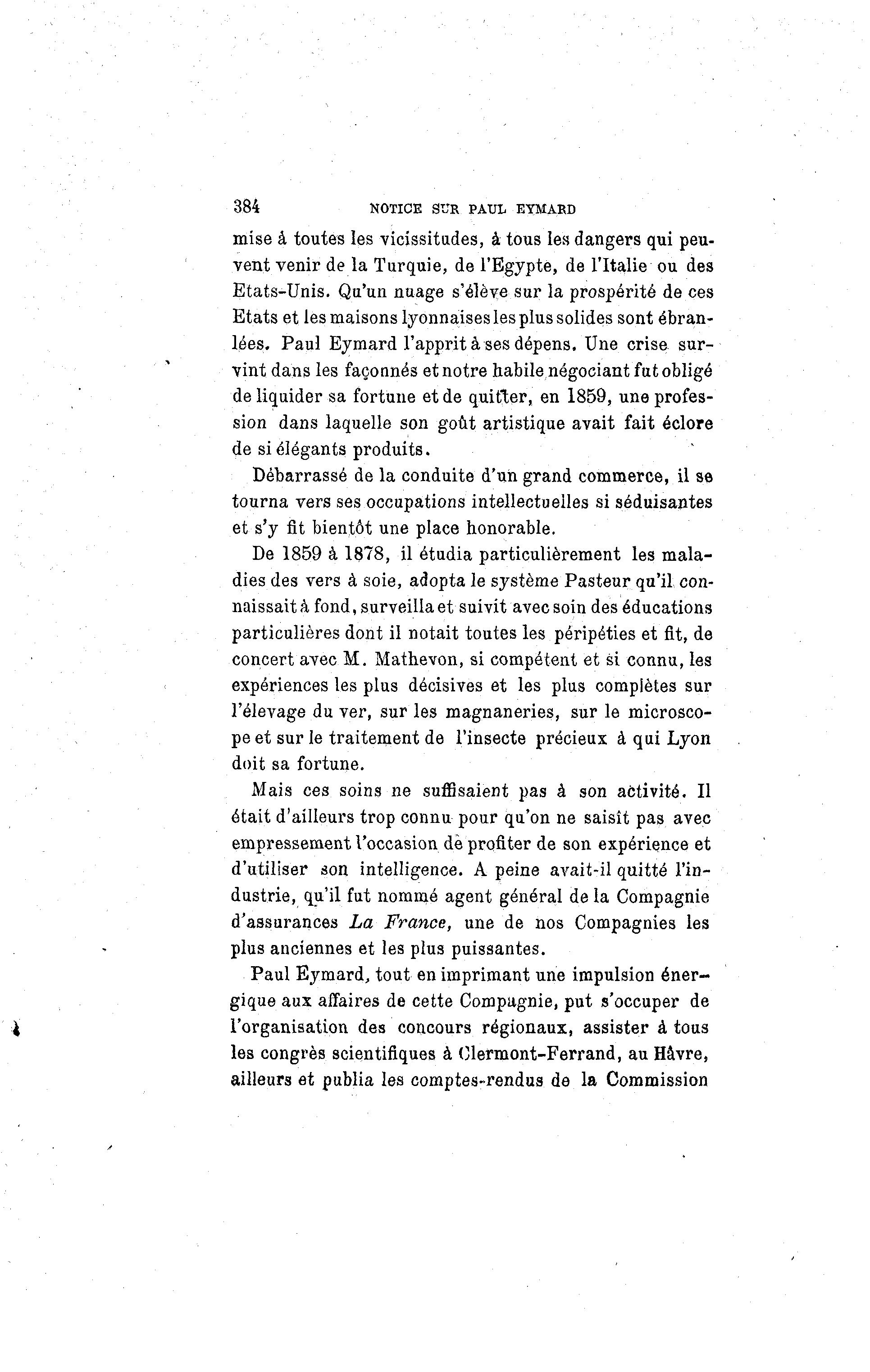 384 NOTICE STJR PAUL EYMAKD mise à toutes les vicissitudes, à tous les dangers qui peu- vent venir de la Turquie, de l'Egypte, de l'Italie ou des Etats-Unis. Qu'un nuage s'élève sur la prospérité de ces Etats et les maisons lyonnaises les plus solides sont ébran- lées. Paul Eymard l'apprit à ses dépens. Une crise sur- vint dans les façonnés et notre habile négociant fut obligé de liquider sa fortune et de quitter, en 1859, une profes- sion dans laquelle son goût artistique avait fait éclore de si élégants produits. Débarrassé de la conduite d'un grand commerce, il se tourna vers ses occupations intellectuelles si séduisantes et s'y fit bientôt une place honorable. De 1859 à 1878, il étudia particulièrement les mala- dies des vers à soie, adopta le système Pasteur qu'il con- naissait à fond, surveilla et suivit avec soin des éducations particulières dont il notait toutes les péripéties et fit, de concert avec M. Mathevon, si compétent et si connu, les expériences les plus décisives et les plus complètes sur l'élevage du ver, sur les magnaneries, sur le microsco- pe et sur le traitement de l'insecte précieux à qui Lyon doit sa fortune. Mais ces soins ne suffisaient pas à son activité. Il était d'ailleurs trop connu pour qu'on ne saisît pas avec empressement l'occasion de profiter de son expérience et d'utiliser son intelligence. A peine avait-il quitté l'in- dustrie, qu'il fut nommé agent général de la Compagnie d'assurances La France, une de nos Compagnies les plus anciennes et les plus puissantes. Paul Eymard, tout en imprimant une impulsion éner- gique aux affaires de cette Compagnie, put s'occuper de l'organisation des concours régionaux, assister à tous les congrès scientifiques à Olermont-Ferrand, au Havre, ailleurs et publia les comptes-rendus de la Commission